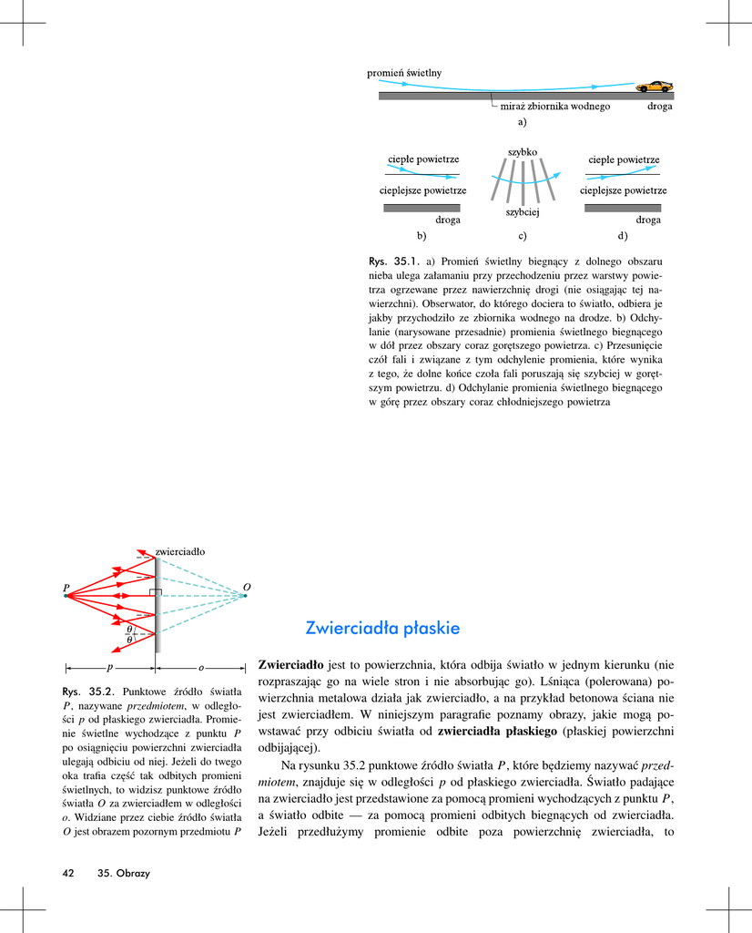 Rys. 35.1. a) Promień świetlny biegnący z dolnego obszaru nieba ulega załamaniu przy przechodzeniu przez warstwy powietrza ogrzewane przez nawierzchnię drogi (nie osiągając tej nawierzchni). Obserwator, do którego dociera to światło, odbiera je jakby przychodziło ze zbiornika wodnego na drodze. b) Odchylanie (narysowane przesadnie) promienia świetlnego biegnącego w dół przez obszary coraz gorętszego powietrza. c) Przesunięcie czół fali i związane z tym odchylenie promienia, które wynika z tego, że dolne końce czoła fali poruszają się szybciej w gorętszym powietrzu. d) Odchylanie promienia świetlnego biegnącego w górę przez obszary coraz chłodniejszego powietrza Zwierciadła płaskie Rys. 35.2. Punktowe źródło światła P , nazywane przedmiotem, w odległości p od płaskiego zwierciadła. Promienie świetlne wychodzące z punktu P po osiągnięciu powierzchni zwierciadła ulegają odbiciu od niej. Jeżeli do twego oka trafia część tak odbitych promieni świetlnych, to widzisz punktowe źródło światła O za zwierciadłem w odległości o. Widziane przez ciebie źródło światła O jest obrazem pozornym przedmiotu P 42 35. Obrazy Zwierciadło jest to powierzchnia, która odbija światło w jednym kierunku (nie rozpraszając go na wiele stron i nie absorbując go). Lśniąca (polerowana) powierzchnia metalowa działa jak zwierciadło, a na przykład betonowa ściana nie jest zwierciadłem. W niniejszym paragrafie poznamy obrazy, jakie mogą powstawać przy odbiciu światła od zwierciadła płaskiego (płaskiej powierzchni odbijającej). Na rysunku 35.2 punktowe źródło światła P , które będziemy nazywać przedmiotem, znajduje się w odległości p od płaskiego zwierciadła. Światło padające na zwierciadło jest przedstawione za pomocą promieni wychodzących z punktu P , a światło odbite — za pomocą promieni odbitych biegnących od zwierciadła. Jeżeli przedłużymy promienie odbite poza powierzchnię zwierciadła, to