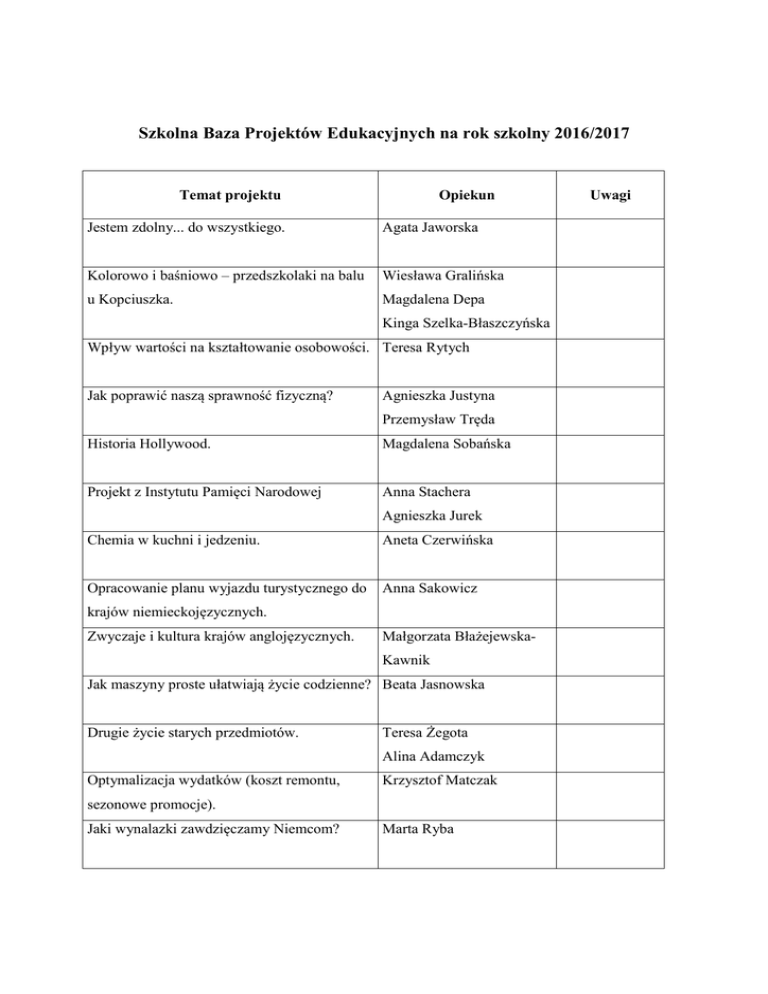 Szkolna Baza Projektów Edukacyjnych na rok szkolny 2016/2017 Temat projektu Opiekun Jestem zdolny... do wszystkiego. Agata Jaworska Kolorowo i baśniowo – przedszkolaki na balu Wiesława Gralińska u Kopciuszka. Magdalena Depa Kinga Szelka-Błaszczyńska Wpływ wartości na kształtowanie osobowości. Teresa Rytych Jak poprawić naszą sprawność fizyczną? Agnieszka Justyna Przemysław Tręda Historia Hollywood. Magdalena Sobańska Projekt z Instytutu Pamięci Narodowej Anna Stachera Agnieszka Jurek Chemia w kuchni i jedzeniu. Aneta Czerwińska Opracowanie planu wyjazdu turystycznego do Anna Sakowicz krajów niemieckojęzycznych. Zwyczaje i kultura krajów anglojęzycznych. Małgorzata BłażejewskaKawnik Jak maszyny proste ułatwiają życie codzienne? Beata Jasnowska Drugie życie starych przedmiotów. Teresa Żegota Alina Adamczyk Optymalizacja wydatków (koszt remontu, Krzysztof Matczak sezonowe promocje). Jaki wynalazki zawdzięczamy Niemcom? Marta Ryba Uwagi Jak poprawić język uczniów naszej szkoły? Monika Gawarzyńska Małgorzata Stasiołek Matematyka – królową nauk. Monika Gawarzyńska Małgorzata Stasiołek Historia i jej zwycięstwa. Grzegorz Włoch Uwaga! Do 31 października uczniowie klas II wybierają temat projektu edukacyjnego, który chcieliby realizować i zgłaszają się do opiekuna projektu. Uczniowie mają również możliwość zgłoszenia własnej propozycji tematu projektu, który chcą realizować. Warunkiem przystąpienia do projektu zgłoszonego przez uczniów jest znalezienie opiekuna (nauczyciela), który będzie koordynował prace nad projektem. Zaproponowany przez uczniów temat należy zgłosić do szkolnego koordynatora projektów Anety Czerwińskiej. A. Czerwińska