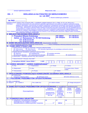 ____________________________________________ pieczęć nagłówkowa podatnika DN – 1 Miejscowość, data .................................................................... DEKLARACJA NA PODATEK OD NIERUCHOMOŚCI na rok 2007 2. Numer ewidencyjny podatnika ............................... 1. Nr PKD ..................... Podstawa prawna: Ustawa z dnia 12 stycznia 1991 r. o podatkach i opłatach lokalnych ( Dz.U. z 2006 r. Nr 121, poz. 844 ze zm.). Składający: Formularz przeznaczony dla osób prawnych, jednostek organizacyjnych oraz spółek nie mających osobowości prawnej będących właścicielami nieruchomości lub obiektów budowlanych, posiadaczami samoistnymi nieruchomości lub obiektów budowlanych, uŜytkownikami wieczystymi gruntów, posiadaczami nieruchomości lub ich części albo obiektów budowlanych lub ich części, stanowiących własność Skarbu Państwa lub jednostki samorządu terytorialnego oraz dla współwłaścicieli lub współposiadaczy z osobami fizycznymi, prawnymi, bądź z innymi jednostkami organizacyjnymi nieposiadającymi osobowości prawnej lub z spółkami nieposiadającymi osobowości prawnej, z wyjątkiem osób tworzących wspólnotę mieszkaniową. Termin składania: Do 15 stycznia kaŜdego roku podatkowego lub w terminie 14 dni od zaistnienia okoliczności mających wpływ na powstanie bądź wygaśnięcie obowiązku podatkowego. A. MIEJSCE SKŁADANIA DEKLARACJI 3. Prezydent Miasta Kołobrzeg Adres: ul. Ratuszowa 13, 78-100 Kołobrzeg NIP GMINY NIP URZĘDU 671-169-85-41 671-100-55-03 Fax. (0 94) 35 515 50 Tel. (0 94) 35 515 56 B. DANE SKŁADAJĄCEGO DEKLARACJĘ (niepotrzebne skreślić) * - dotyczy składającego deklarację niebędącego osobą fizyczną ** - dotyczy składającego deklarację będącego osobą fizyczną B.1 DANE IDENTYFIKACYJNE 4. Rodzaj podmiotu składającego deklarację ( zaznaczyć właściwą kratkę) osoba prawna osoba fizyczna Jednostka organizacyjna nie posiadająca osobowości prawnej spółka nie mająca osobowości prawnej 5. Rodzaj własności, posiadania ( zaznaczyć właściwą kratkę) właściciel współwłaściciel posiadacz samoistny uŜytkownik wieczysty współuŜytkownik wieczysty posiadacz współposiadacz 6. Nazwa pełna * / Nazwisko, pierwsze imię, data urodzenia** 7. Nazwa skrócona* / imię ojca, imię matki** 8. Identyfikator REGON* / Numer PESEL** 9. NIP/ B.2 ADRES SIEDZIBY* / ADRES ZAMIESZKANIA** 10. Kraj 11. Województwo 14. Miejscowość 15. Ulica 17. Kod pocztowy 12. Powiat 13. Gmina 16. Numer domu / Numer lokalu 18. Poczta 19. Telefon C. OKOLICZNOŚCI POWODUJĄCE KONIECZNOŚĆ ZŁOśENIA DEKLARACJI 20. Okoliczności (zaznaczyć właściwą kratkę) deklaracja roczna korekta deklaracji rocznej C.1. POŁOśENIE PRZEDMIOTÓW OPODATKOWANIA 21. Ulica, nr porządkowy: 22. Obręb Nr 23. Działka nr Pow. działki (ha) 24. Udział w działce 25. Księga wieczysta Nr D. DANE DOTYCZĄCE PRZEDMIOTÓW OPODATKOWANIA (z wyjątkiem zwolnionych) Podstawa opodatkowania Wyszczególnienie /powierzchnia 2 wyraŜona w m lub ha/ Stawka podatku wynikająca z Uchwały R M Kołobrzeg Nr III/12/06 z dn. 11.12.06 w zł,gr Kwota podatku w zł, gr D.1 POWIERZCHNIA GRUNTÓW 1. związanych z prowadzeniem działalności gospodarczej, bez względu na sposób zakwalifikowania w ewidencji gruntów i budynków 26. ................... m 27. 2 28. 0,60 zł .................... Uwaga! obowiązek podatkowy miesiące od –do 2. pod jeziorami, zajętych na zbiorniki wodne retencyjne lub elektrowni wodnych 3. pozostałe grunty, w tym zajęte na prowadzenie odpłatnej statutowej działalności poŜytku publiczn. przez organizacje poŜytku publicznego 29. 30. ..................ha 32. 33. .................m 2 31. 3,61 zł ................... 34. 0,27 zł ..................... D.2 OD BUDYNKÓW LUB ICH CZĘŚCI * Do powierzchni uŜytkowej budynku lub jego części naleŜy zaliczyć powierzchnię mierzoną, po wewnętrznej długości ścian na wszystkich kondygnacjach, z wyjątkiem powierzchni klatek schodowych oraz szybów dźwigowych. Za kondygnację uwaŜa się równieŜ garaŜe podziemne, piwnice, sutereny i poddasza uŜytkowe. Powierzchnię pomieszczeń lub ich części oraz części kondygnacji o wysokości w świetle od 1,40 m do 2,20 m zalicza się do powierzchni uŜytkowej budynku w 50 %, a jeŜeli wysokość jest mniejsza niŜ 1,40 m, powierzchnię tę pomija się. 1. mieszkalnych 2. związanych z prowadzeniem działalności gospodarczej oraz od budynków mieszkalnych lub ich części zajętych na prowadzenie działalności gospodarczej , 2 3. od 1 m powierzchni uŜytkowej budynków związanych z prowadzeniem działalności gospodarczej w zakresie handlu: wyłącznie detalicznego lub detalicznego i hurtowego jeŜeli pow. 2 budynku przekracza 1000 m , wyłącznie hurtowego 2 jeŜeli pow. budynku przekracza 2500 m 4. zajętych na prowadzenie działalności gospodarczej w zakresie obrotu kwalifikowanym materiałem siewnym , 5. zajętych na prowadzenie działalności gospodarczej w zakresie świadczeń zdrowotnych, 6. pozostałych, w tym zajętych na prowadzenie odpłatnej statutowej działalności poŜytku publicznego przez organizacje poŜytku publicznego 35. 2 .................. m 38. .................. m 2 41. 36. 0,50 zł 37. ................... 40. 16,00 zł ................... 39. 42. 2 ..................m 43. 18,43 zł 44. 2 .................. m 45. 47. 2 .................. m 50. 2 ...................m 48. 7,40 zł 3,71 zł 51. 6,00 zł .................... 46. .................... 49. .................... 52. .................... D.3 OD BUDOWLI LUB ICH CZEŚĆI ( ich wartość określonej na podstawie art. 4 ust. 1 pkt 3 i ust. 3-7) 53. 54. 55. 1. Od budowli ....................zł .................. 2% (wartość budowli w pełnych złotych) E. ŁĄCZNA KWOTA PODATKU Kwota podatku Suma kwot z poz. D (kwota podatku zaokrąglona do pełnych złotych) 56. .................................zł F. INFORMACJA O PRZEDMIOTACH ZWOLNION