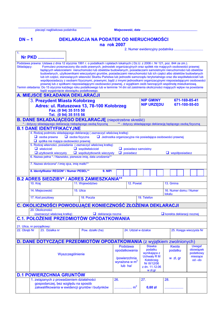 1 DEKLARACJA NA PODATEK OD NIERUCHOMOŚCI na rok 2007