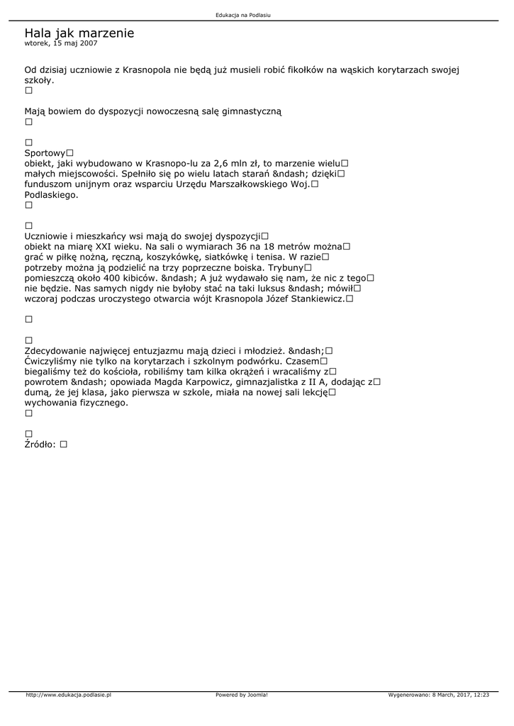 Edukacja na Podlasiu Hala jak marzenie wtorek, 15 maj 2007 Od dzisiaj uczniowie z Krasnopola nie będą już musieli robić fikołków na wąskich korytarzach swojej szkoły. Mają bowiem do dyspozycji nowoczesną salę gimnastyczną Sportowy obiekt, jaki wybudowano w Krasnopo-lu za 2,6 mln zł, to marzenie wielu małych miejscowości. Spełniło się po wielu latach starań – dzięki funduszom unijnym oraz wsparciu Urzędu Marszałkowskiego Woj. Podlaskiego. Uczniowie i mieszkańcy wsi mają do swojej dyspozycji obiekt na miarę XXI wieku. Na sali o wymiarach 36 na 18 metrów można grać w piłkę nożną, ręczną, koszykówkę, siatkówkę i tenisa. W razie potrzeby można ją podzielić na trzy poprzeczne boiska. Trybuny pomieszczą około 400 kibiców. – A już wydawało się nam, że nic z tego nie będzie. Nas samych nigdy nie byłoby stać na taki luksus – mówił wczoraj podczas uroczystego otwarcia wójt Krasnopola Józef Stankiewicz. Zdecydowanie najwięcej entuzjazmu mają dzieci i młodzież. – Ćwiczyliśmy nie tylko na korytarzach i szkolnym podwórku. Czasem biegaliśmy też do kościoła, robiliśmy tam kilka okrążeń i wracaliśmy z powrotem – opowiada Magda Karpowicz, gimnazjalistka z II A, dodając z dumą, że jej klasa, jako pierwsza w szkole, miała na nowej sali lekcję wychowania fizycznego. Źródło: http://www.edukacja.podlasie.pl Powered by Joomla! Wygenerowano: 8 March, 2017, 12:23
