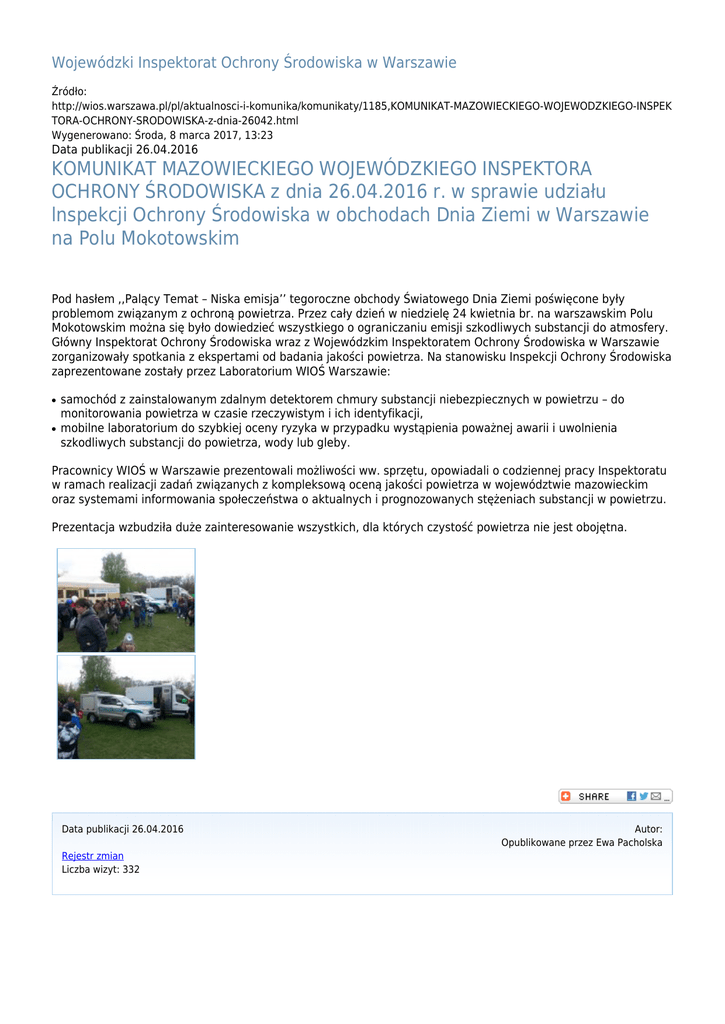 Wojewódzki Inspektorat Ochrony Środowiska w Warszawie Źródło: http://wios.warszawa.pl/pl/aktualnosci-i-komunika/komunikaty/1185,KOMUNIKAT-MAZOWIECKIEGO-WOJEWODZKIEGO-INSPEK TORA-OCHRONY-SRODOWISKA-z-dnia-26042.html Wygenerowano: Środa, 8 marca 2017, 13:23 Data publikacji 26.04.2016 KOMUNIKAT MAZOWIECKIEGO WOJEWÓDZKIEGO INSPEKTORA OCHRONY ŚRODOWISKA z dnia 26.04.2016 r. w sprawie udziału lnspekcji Ochrony Środowiska w obchodach Dnia Ziemi w Warszawie na Polu Mokotowskim Pod hasłem ,,Palący Temat – Niska emisja’’ tegoroczne obchody Światowego Dnia Ziemi poświęcone były problemom związanym z ochroną powietrza. Przez cały dzień w niedzielę 24 kwietnia br. na warszawskim Polu Mokotowskim można się było dowiedzieć wszystkiego o ograniczaniu emisji szkodliwych substancji do atmosfery. Główny Inspektorat Ochrony Środowiska wraz z Wojewódzkim Inspektoratem Ochrony Środowiska w Warszawie zorganizowały spotkania z ekspertami od badania jakości powietrza. Na stanowisku Inspekcji Ochrony Środowiska zaprezentowane zostały przez Laboratorium WIOŚ Warszawie: ● ● samochód z zainstalowanym zdalnym detektorem chmury substancji niebezpiecznych w powietrzu – do monitorowania powietrza w czasie rzeczywistym i ich identyfikacji, mobilne laboratorium do szybkiej oceny ryzyka w przypadku wystąpienia poważnej awarii i uwolnienia szkodliwych substancji do powietrza, wody lub gleby. Pracownicy WIOŚ w Warszawie prezentowali możliwości ww. sprzętu, opowiadali o codziennej pracy Inspektoratu w ramach realizacji zadań związanych z kompleksową oceną jakości powietrza w województwie mazowieckim oraz systemami informowania społeczeństwa o aktualnych i prognozowanych stężeniach substancji w powietrzu. Prezentacja wzbudziła duże zainteresowanie wszystkich, dla których czystość powietrza nie jest obojętna. Data publikacji 26.04.2016 Rejestr zmian Liczba wizyt: 332 Autor: Opublikowane przez Ewa Pacholska