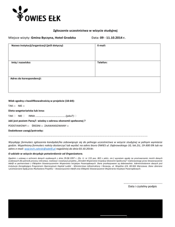 Zgłoszenie uczestnictwa w wizycie studyjnej Miejsce wizyty: Gmina Byczyna, Hotel Grodzka Data: 09 - 11.10.2014 r. Nazwa instytucji/organizacji (jeśli dotyczy) E-mail: Imię i nazwisko: Telefon: Adres do korespondencji: Wiek zgodny z kwalifikowalnością w projekcie (18-64): TAK □ NIE □ Dieta wegetariaoska lub inna: TAK NIE INNA ………………………………………(jaka?) Jaki jest poziom Pana/i wiedzy z zakresu ekonomii społecznej ? PODSTAWOWY □ ŚREDNI □ ZAAWANSOWANY □ Dodatkowe uwagi/potrzeby: …………………………………………………………………………………………………………………………………………………………………………………….. Wysyłając formularz zgłoszenia kandydat/ka zobowiązuje się do pełnego uczestnictwa w wizycie studyjnej w pełnym wymiarze godzin. Wypełniony formularz należy dostarczyd lub wysład na adres biura OWIES ul. Dąbrowskiego 10, lok.2U, 19-300 Ełk lub na adres e-mail: [email protected] najpóźniej do dnia 03.10.2014r. O udziale w wizycie decyduje potwierdzenie od Organizatora. Zgodnie z ustawą o ochronie danych osobowych z dnia 29.08.1997 r. (Dz. U. nr 133 poz. 863 z późn. zm.) wyrażam zgodę na przetwarzanie moich danych osobowych dla potrzeb procesu rekrutacji, realizacji i ewaluacji projektu „Ośrodek Wspierania Inicjatyw Ekonomii Społecznej” realizowanego przez Stowarzyszenie Adelfi w partnerstwie z Elbląskim Stowarzyszeniem Wspierania Inicjatyw Pozarządowych. Dane przekazywane są dobrowolnie. Administratorem danych jest Instytucja Zarządzająca Programem Operacyjnym Kapitał Ludzki - Ministerstwo Infrastruktury i Rozwoju, ul. Wspólna 2/4, 00-926 Warszawa. Dane zbierane i przetwarzane będą przez Realizatora Projektu – Stowarzyszenie Adelfi oraz Elbląskie Stowarzyszenie Wspierania Inicjatyw Pozarządowych. ……………………………………………. Data i czytelny podpis
