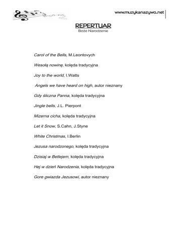 www.muzykanazywo..net REPERTUAR Boże Narodzenie Carol of the Bells, M.Leontovych Wesołą nowinę, kolęda tradycyjna Joy to the world, I.Watts Angels we have heard on high, autor nieznany Gdy śliczna Panna, kolęda tradycyjna Jingle bells, J.L. Pierpont Mizerna cicha, kolęda tradycyjna Let it Snow, S.Cahn, J.Styne White Christmas, I.Berlin Jezusa narodzonego, kolęda tradycyjna Dzisiaj w Betlejem, kolęda tradycyjna Hej w dzień Narodzenia, kolęda tradycyjna Gore gwiazda Jezusowi, autor nieznany