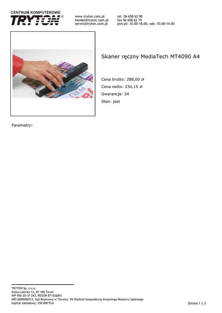 www.tryton.com.pl [email protected] [email protected] tel. 56 658 62 00 fax 56 658 62 19 pon-pt: 10.00-18.00, sob: 10.00-14.00 Skaner ręczny MediaTech MT4090 A4 Cena brutto: 288,00 zł Cena netto: 234,15 zł Gwarancja: 24 Stan: jest Parametry: TRYTON Sp. z o.o. Szosa Lubicka 13, 87-100 Toruń NIP 956-20-37-243, REGON 871526851 KRS 0000006913, Sąd Rejonowy w Toruniu, VII Wydział Gospodarczy Krajowego Rejestru Sądowego kapitał zakładowy: 250 000 PLN Strona 1 z 3 www.tryton.com.pl [email protected] [email protected] Opis tel. 56 658 62 00 fax 56 658 62 19 pon-pt: 10.00-18.00, sob: 10.00-14.00 Skanowanie od ręki w jeszcze lepszej jakości! SCANLINE MT4090 to mobilny, kolorowy skaner dokumentów A4 i mniejszych, zapewniający użytkownikom wysoką jakość skanowanych obrazów, zwiększoną wydajność pracy i większą funkcjonalność. SCANLINE jest idealnym narzędziem pracy dla handlowców, agentów ubezpieczeniowych, sprzedawców z branży nieruchomości i bankowości, architektów, rzeczoznawców, studentów i wszystkich tych, którzy szanują swój czas i pieniądze. SCANLINE zapewnia dwa tryby skanowania: JPEG/PDF. Dzięki temu idealnie nadaje się do sporządzania kopii umów, faktur, kolorowych zdjęć, itp. Przy użyciu SCANLINE można skanować książki, czasopisma, notatki, rachunki, szkice, wizytówki oraz wiele innych i to w dowolnym miejscu: samochodzie, bibliotece, urzędzie, na spotkaniu w restauracji. Zeskanowane obrazy można następnie przejrzeć, wydrukować lub zamienić za pośrednictwem programu OCR na dokumenty Word lub Excel SCANLINE jest bowiem dostępny w pakiecie z rewelacyjnym, wielojęzycznym oprogramowaniem OCR firmy ABBYY. Zastosowanie SCANLINE jest bardzo szerokie. Skaner ręczny SCANLINE będzie idealnym pomocnikiem każdego studenta - pozwoli zaoszczędzić sporo pieniędzy potrzebnych na kserowanie tomów książek, oraz czasu, dzięki oprogramowaniu OCR (gwarantującemu konwersję do plików edytowalnych) prace semestralne powstaną o wiele szybciej. Skaner MT4090 można użyć podczas spotkania, aby od ręki zeskanować podpisane dokumenty i wysłać je e-mailem. Agenci ubezpieczeniowi mogą zeskanować wszystkie potrzebne dokumenty bezpośrednio u klienta. Najistotniejsze jest jednak to, że każdy z użytkowników SCANLINE może znaleźć kolejne, indywidualne zastosowanie. Sprawne i dokładne skanowanie możliwe jest dzięki systemowi prowadzącemu z czterema rolkami, co gwarantuje równomierne rozłożenie nacisku na podłoże. Skany można odczytać bezpośrednio z karty Miro SD lub podłączając urządzenie za pomocą kabla USB do komputera. Niewielkie wymiary i waga, cicha praca, wysoka w tej klasie urządzeń jakość oraz rozdzielczość optyczna do 900 dpi sprawia, że SCANLINE jest idealnym partnerem codziennych zmagań ludzi aktywnych. TRYTON Sp. z o.o. Szosa Lubicka 13, 87-100 Toruń NIP 956-20-37-243, REGON 871526851 KRS 0000006913, Sąd Rejonowy w Toruniu, VII Wydział Gospodarczy Krajowego Rejestru Sądowego kapitał zakładowy: 250 000 PLN Strona 2 z 3 www.tryton.com.pl [email protected] [email protected] tel. 56 658 62 00 fax 56 658 62 19 pon-pt: 10.00-18.00, sob: 10.00-14.00 SCANLINE zapewnia mobilność, uniwersalność i pewność działania, w każdym miejscu i w każdej sytuacji. Mimo dołożenia wszelkich starań nie gwarantujemy, że publikowane dane techniczne nie zawierają uchybień lub błędów. W przypadku jakichkolwiek wątpliwości prosimy przed podjęciem decyzji o kontakt z handlowcem. Przedstawiona oferta cenowa ma charakter informacyjny, nie stanowi oferty handlowej w rozumieniu Art.66 par.1 Kodeksu Cywilnego oraz innych właściwych przepisów prawnych. TRYTON Sp. z o.o. Szosa Lubicka 13, 87-100 Toruń NIP 956-20-37-243, REGON 871526851 KRS 0000006913, Sąd Rejonowy w Toruniu, VII Wydział Gospodarczy Krajowego Rejestru Sądowego kapitał zakładowy: 250 000 PLN Strona 3 z 3