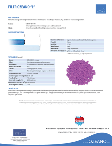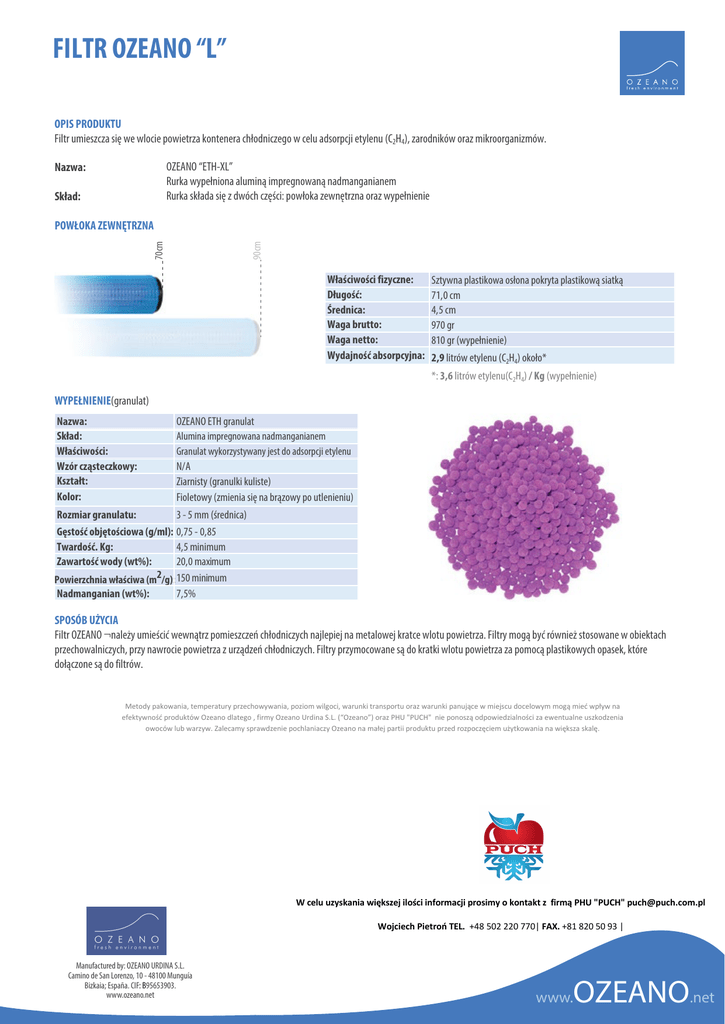 FILTR OZEANO “L” OPIS PRODUKTU Filtr umieszcza się we wlocie powietrza kontenera chłodniczego w celu adsorpcji etylenu (C2H4), zarodników oraz mikroorganizmów. OZEANO “ETH-XL” Rurka wypełniona aluminą impregnowaną nadmanganianem Rurka składa się z dwóch części: powłoka zewnętrzna oraz wypełnienie Nazwa: Skład: 90cm 70cm POWŁOKA ZEWNĘTRZNA Właściwości fizyczne: Długość: Średnica: Waga brutto: Waga netto: Wydajność absorpcyjna: Sztywna plastikowa osłona pokryta plastikową siatką 71,0 cm 4,5 cm 970 gr 810 gr (wypełnienie) 2,9 litrów etylenu (C2H4) około* *: 3,6 litrów etylenu(C2H4) / Kg (wypełnienie) WYPEŁNIENIE(granulat) Nazwa: Skład: Właściwości: Wzór cząsteczkowy: Kształt: Kolor: OZEANO ETH granulat Alumina impregnowana nadmanganianem Granulat wykorzystywany jest do adsorpcji etylenu N/A Ziarnisty (granulki kuliste) Fioletowy (zmienia się na brązowy po utlenieniu) Rozmiar granulatu: 3 - 5 mm (średnica) Gęstość objętościowa (g/ml): 0,75 - 0,85 4,5 minimum Twardość. Kg: Zawartość wody (wt%): 20,0 maximum Powierzchnia właściwa (m2/g): 150 minimum Nadmanganian (wt%): 7,5% SPOSÓB UŻYCIA Filtr OZEANO ¬należy umieścić wewnątrz pomieszczeń chłodniczych najlepiej na metalowej kratce wlotu powietrza. Filtry mogą być również stosowane w obiektach przechowalniczych, przy nawrocie powietrza z urządzeń chłodniczych. Filtry przymocowane są do kratki wlotu powietrza za pomocą plastikowych opasek, które dołączone są do filtrów. Metody pakowania, temperatury przechowywania, poziom wilgoci, warunki transportu oraz warunki panujące w miejscu docelowym mogą mieć wpływ na efektywność produktów Ozeano dlatego , firmy Ozeano Urdina S.L. (“Ozeano”) oraz PHU "PUCH" nie ponoszą odpowiedzialności za ewentualne uszkodzenia owoców lub warzyw. Zalecamy sprawdzenie pochlaniaczy Ozeano na małej partii produktu przed rozpoczęciem użytkowania na większa skalę. W celu uzyskania większej ilości informacji prosimy o kontakt z firmą PHU "PUCH" [email protected] Wojciech Pietroń TEL. +48 502 220 770| FAX. +81 820 50 93 | Manufactured by: OZEANO URDINA S.L. Camino de San Lorenzo, 10 - 48100 Munguía Bizkaia; España. CIF:: BB95653903. www.ozeano.net OZEANO.net www.