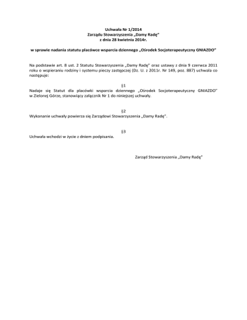 Uchwała Nr 1/2014 Zarządu Stowarzyszenia „Damy Radę” z dnia 28 kwietnia 2014r. w sprawie nadania statutu placówce wsparcia dziennego „Ośrodek Socjoterapeutyczny GNIAZDO” Na podstawie art. 8 ust. 2 Statutu Stowarzyszenia „Damy Radę” oraz ustawy z dnia 9 czerwca 2011 roku o wspieraniu rodziny i systemu pieczy zastępczej (Dz. U. z 2011r. Nr 149, poz. 887) uchwala co następuje: §1 Nadaje się Statut dla placówki wsparcia dziennego „Ośrodek Socjoterapeutyczny GNIAZDO” w Zielonej Górze, stanowiący załącznik Nr 1 do niniejszej uchwały. §2 Wykonanie uchwały powierza się Zarządowi Stowarzyszenia „Damy Radę”. §3 Uchwała wchodzi w życie z dniem podpisania. Zarząd Stowarzyszenia „Damy Radę” Załącznik Nr 1 do Uchwały Nr 1/2014 Zarządu Stowarzyszenia „Damy Radę” z dnia 28 kwietnia 2014 r. STATUT PLACÓWKI WSPARCIA DZIENNEGO OŚRODEK SOCJOTERAPEUTYCZNY GNIAZDO W ZIELONEJ GÓRZE ROZDZIAŁ 1 POSTANOWIENIA OGÓLNE §1 1. Placówka wsparcia dziennego – Ośrodek Socjoterapeutyczny GNIAZDO zwany dalej „Placówką” działa na podstawie niniejszego statutu oraz w oparciu o następujące akty prawne: 1) Ustawę z dnia 9 czerwca 2011 r. o wspieraniu rodziny i systemu pieczy zastępczej (Dz.U. z 2011 r. Nr 149, poz. 887); 2) Ustawy z dnia 12 marca 2004 r. o pomocy społecznej (tekst jednolity Dz. U. z 2009 r. Nr 175, poz. 1362 z późn. Zm.); 3) Ustawy z dnia 26 października 1982 r. o wychowaniu w trzeźwości i przeciwdziałaniu alkoholizmowi (tekst jednolity Dz. U. z 2007 r. Nr 70, poz. 473 z późn. zm.); 4) Ustawy z dnia 29 lipca 2005 r. o przeciwdziałaniu narkomanii (Dz. U. z 2005 r. Nr 179, poz. 1485 z późn. zm.); 5) Ustawy z dnia 29 lipca 2005 r. o przeciwdziałaniu przemocy w rodzinie (Dz. U. z 2005 r. Nr 180, poz. 1493 z późn. zm.); 6) Rozporządzenie Ministra Pracy i Polityki Społecznej z dnia 19 października 2007 r. w sprawie placówek opiekuńczo-wychowawczych (Dz. U. z 2007 r. Nr 201, poz. 1455); 7) Innych właściwych aktów prawnych. §2 1. Placówka prowadzona jest przez Stowarzyszenie „Damy Radę” na zlecenie Miasta Zielona Góra. 2. Główną siedzibą placówki jest lokal przy ul. Sikorskiego 24, 65-450 Zielona Góra. 3. Placówka jest jednostką finansowaną z dotacji celowych budżetu państwa, jednostek samorządowych oraz innych źródeł publicznych, prywatnych, środków własnych Stowarzyszenia „Damy Radę”. 4. Podstawę gospodarki finansowej Placówki stanowi roczny plan finansowy. 5. Pobyt dziecka w Placówce jest dobrowolny i nieodpłatny. 6. Szczegółową organizację Placówki, a także specyfikę i zakres sprawowania opieki określa Regulamin Organizacyjnych Placówki opracowany przez Kierownika Placówki w porozumieniu z Zarządem Stowarzyszenia „Damy Radę”. 7. Placówka może tworzyć filie na terenie Miasta Zielona Góra. 8. Placówka używa pieczęci i wywiesza szyldy zgodnie z obowiązującymi przepisami. ROZDZIAŁ II CELE I ZADANIA §3 1. Placówka realizuje następujące zadania: 1) Opiekę i wychowanie, 2) Pomoc w nauce, 3) Organizację czasu wolnego, rozwój zainteresowań, organizację zabawy i zajęć sportowych, 4) Stałą pracę z rodziną dziecka, 5) Pomoc w sytuacjach kryzysowych, szkolnych, rodzinnych, rówieśniczych, osobistych w oparciu o diagnozę indywidualną dziecka i jego rodziny, 6) Pracę wychowawczą i socjalną w celu kształtowania postaw społecznie pożądanych i pomocy w prawidłowym rozwoju ich osobowości, nabywanie różnych umiejętności społecznych koniecznych do samodzielnego i prawidłowego funkcjonowania w dorosłym życiu, 7) Kształtowanie prawidłowych kontaktów dziecka z jego rodziną i środowiskiem, 8) Zajęcia socjoterapeutyczne, terapeutyczne, psychologiczne, logopedyczne, korekcyjne i kompensacyjne, 9) W działaniach wychowawczych organizowanych w placówce wraz z dzieckiem, mogą uczestniczyć rodzice lub opiekunowie dziecka, 10) O rezygnacji ze świadczeń Placówki, rodzice lub opiekunowie dziecka niezwłocznie winni informować placówkę. 2. W celu realizacji zadań, o których mowa w §3 ust. 1 Placówka współpracuje z organami samorządowymi oraz instytucjami, które prowadzą działalność w obszarze pomocy dziecku i rodzinie, a także z mediami, fundacjami, stowarzyszeniami, osobami fizycznymi i innymi osobami prawnymi. 3. Kierownik Placówki wraz z zatrudnionymi wychowawcami współpracuje z asystentem rodziny, kuratorem rodzinnym, pedagogiem i psychologiem szkolnym, dyrektorami szkół w zakresie działań prowadzonych na rzecz dziecka i rodziny. ROZDZIAŁ III ZASADY DZIAŁANIA I ORGANIZACJA PLACÓWKI §4 1. Placówka funkcjonuje przez cały rok kalendarzowy w dni robocze minimum cztery godziny dziennie w godzinach dostosowanych do potrzeb dzieci i rodziców i kalendarza roku szkolnego. W czasie wakacji dopuszcza się aby Placówka była nieczynna 1 miesiąc z uwagi na urlop wypoczynkowy Kierownika Placówki i wychowawców. 2. Przyjmowanie dzieci do Placówki odbywa się bez skierowania jednak na pisemny wniosek rodzica lub opiekuna prawnego dziecka. 3. W Placówce działa Zespół ds. okresowej oceny sytuacji dziecka. Zespół dokonuje okresowej oceny sytuacji dziecka minimum raz na pół roku. Jego zadania określone są w Regulaminie Organizacyjnym Placówki. §5 1. Na czele Placówki stoi Kierownik, który samodzielnie organizuje i kieruje działalnością Placówki. 2. Kierownik Placówki jest jednocześnie wychowawcą. W razie jego nieobecności trwającej ponad miesiąc Placówką kieruje osoba wyznaczona przez Zarząd Stowarzyszenia „Damy Radę”. 3. Organizację pracy Placówki określa Regulamin Organizacyjny Placówki opracowany przez Kierownika Placówki i wprowadzony zarządzeniem Zarządu Stowarzyszenia „Damy Radę”. 4. Kwalifikacje kadry pedagogicznej zatrudnionej w Placówce są zgodne z wymogami określonymi w art. 26 ustawy z dnia 9 czerwca 2011 r. o wspieraniu rodziny i systemu pieczy zastępczej (Dz.U. z 