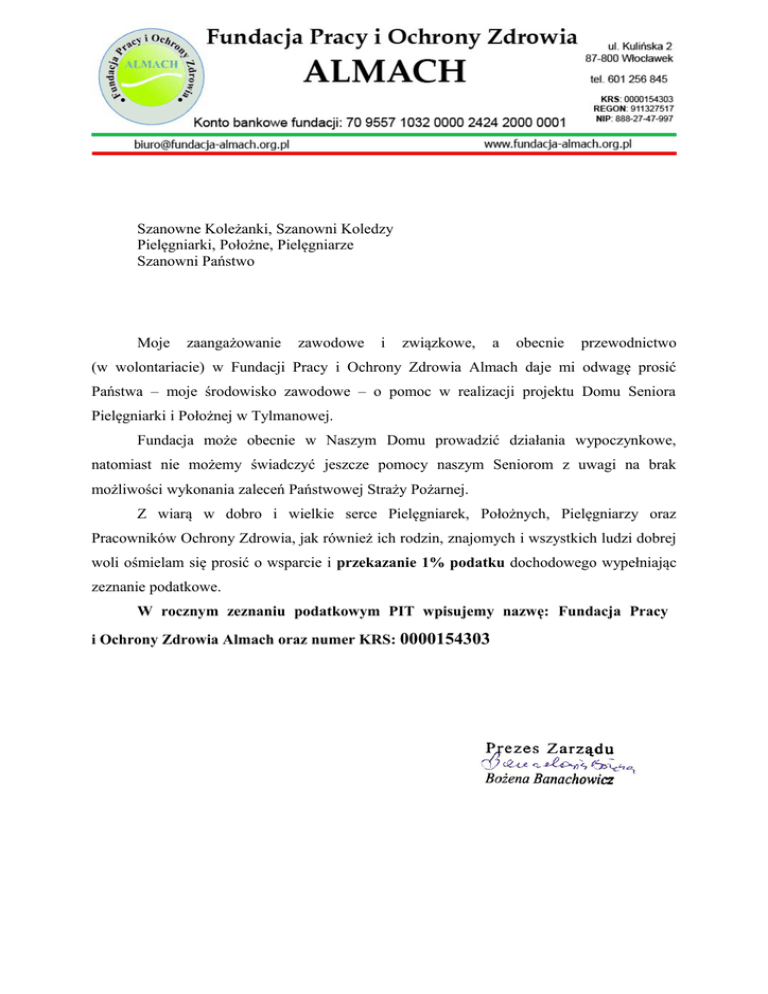 Szanowne Koleżanki, Szanowni Koledzy Pielęgniarki, Położne, Pielęgniarze Szanowni Państwo Moje zaangażowanie zawodowe i związkowe, a obecnie przewodnictwo (w wolontariacie) w Fundacji Pracy i Ochrony Zdrowia Almach daje mi odwagę prosić Państwa – moje środowisko zawodowe – o pomoc w realizacji projektu Domu Seniora Pielęgniarki i Położnej w Tylmanowej. Fundacja może obecnie w Naszym Domu prowadzić działania wypoczynkowe, natomiast nie możemy świadczyć jeszcze pomocy naszym Seniorom z uwagi na brak możliwości wykonania zaleceń Państwowej Straży Pożarnej. Z wiarą w dobro i wielkie serce Pielęgniarek, Położnych, Pielęgniarzy oraz Pracowników Ochrony Zdrowia, jak również ich rodzin, znajomych i wszystkich ludzi dobrej woli ośmielam się prosić o wsparcie i przekazanie 1% podatku dochodowego wypełniając zeznanie podatkowe. W rocznym zeznaniu podatkowym PIT wpisujemy nazwę: Fundacja Pracy i Ochrony Zdrowia Almach oraz numer KRS: 0000154303