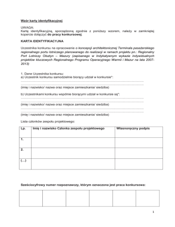 Wzór karty identyfikacyjnej UWAGA: Kartę identyfikacyjną, sporządzoną zgodnie z poniższy wzorem, należy w zamkniętej kopercie dołączyć do pracy konkursowej. KARTA IDENTYFIKACYJNA Uczestnika konkursu na opracowanie o koncepcji architektonicznej Terminala pasażerskiego regionalnego portu lotniczego planowanego do realizacji w ramach projektu pn.: Regionalny Port Lotniczy Olsztyn – Mazury (zapisanego w Indykatywnym wykazie indywidualnych projektów kluczowych Regionalnego Programu Operacyjnego Warmii i Mazur na lata 20072013) 1. Dane Uczestnika konkursu: a) Uczestnik konkursu samodzielnie biorący udział w konkursie*: …………………………………………………………………………………………………… …………………………………………………………………………………………………… (imię i nazwisko/ nazwa oraz miejsce zamieszkania/ siedziba) b) Uczestnikami konkursu wspólnie biorącymi udział w konkursie są*: …………………………………………………………………………………………………… …………………………………………………………………………………………………… (imię i nazwisko/ nazwa oraz miejsce zamieszkania/ siedziba) …………………………………………………………………………………………………… …………………………………………………………………………………………………… (imię i nazwisko/ nazwa oraz miejsce zamieszkania/ siedziba) Lista członków zespołu projektowego: Lp. Imię i nazwisko Członka zespołu projektowego Własnoręczny podpis 1. 2. (…) Sześciocyfrowy numer rozpoznawczy, którym oznaczona jest praca konkursowa: 1 *niepotrzebne skreślić ............................................... miejscowość, data ......................................................... (podpis uczestnika konkursu/ /osób uprawnionych/upoważnionych do reprezentowania uczestnika) 2