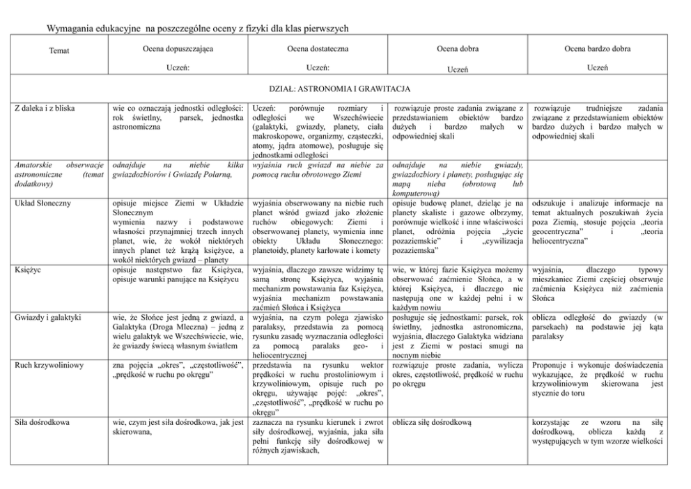 Wymagania edukacyjne na poszczególne oceny z fizyki dla klas pierwszych Temat Ocena dopuszczająca Ocena dostateczna Ocena dobra Ocena bardzo dobra Uczeń: Uczeń: Uczeń Uczeń rozwiązuje proste zadania związane z przedstawianiem obiektów bardzo dużych i bardzo małych w odpowiedniej skali rozwiązuje trudniejsze zadania związane z przedstawianiem obiektów bardzo dużych i bardzo małych w odpowiedniej skali DZIAŁ: ASTRONOMIA I GRAWITACJA Z daleka i z bliska wie co oznaczają jednostki odległości: rok świetlny, parsek, jednostka astronomiczna Amatorskie obserwacje astronomiczne (temat dodatkowy) odnajduje na niebie kilka gwiazdozbiorów i Gwiazdę Polarną, Układ Słoneczny opisuje miejsce Ziemi w Układzie Słonecznym wymienia nazwy i podstawowe własności przynajmniej trzech innych planet, wie, że wokół niektórych innych planet też krążą księżyce, a wokół niektórych gwiazd – planety opisuje następstwo faz Księżyca, opisuje warunki panujące na Księżycu Księżyc Gwiazdy i galaktyki wie, że Słońce jest jedną z gwiazd, a Galaktyka (Droga Mleczna) – jedną z wielu galaktyk we Wszechświecie, wie, że gwiazdy świecą własnym światłem Ruch krzywoliniowy zna pojęcia „okres”, „częstotliwość”, „prędkość w ruchu po okręgu” Siła dośrodkowa wie, czym jest siła dośrodkowa, jak jest skierowana, Uczeń: porównuje rozmiary i odległości we Wszechświecie (galaktyki, gwiazdy, planety, ciała makroskopowe, organizmy, cząsteczki, atomy, jądra atomowe), posługuje się jednostkami odległości wyjaśnia ruch gwiazd na niebie za pomocą ruchu obrotowego Ziemi wyjaśnia obserwowany na niebie ruch planet wśród gwiazd jako złożenie ruchów obiegowych: Ziemi i obserwowanej planety, wymienia inne obiekty Układu Słonecznego: planetoidy, planety karłowate i komety wyjaśnia, dlaczego zawsze widzimy tę samą stronę Księżyca, wyjaśnia mechanizm powstawania faz Księżyca, wyjaśnia mechanizm powstawania zaćmień Słońca i Księżyca wyjaśnia, na czym polega zjawisko paralaksy, przedstawia za pomocą rysunku zasadę wyznaczania odległości za pomocą paralaks geoi heliocentrycznej przedstawia na rysunku wektor prędkości w ruchu prostoliniowym i krzywoliniowym, opisuje ruch po okręgu, używając pojęć: „okres”, „częstotliwość”, „prędkość w ruchu po okręgu” zaznacza na rysunku kierunek i zwrot siły dośrodkowej, wyjaśnia, jaka siła pełni funkcję siły dośrodkowej w różnych zjawiskach, odnajduje na niebie gwiazdy, gwiazdozbiory i planety, posługując się mapą nieba (obrotową lub komputerową) opisuje budowę planet, dzieląc je na planety skaliste i gazowe olbrzymy, porównuje wielkość i inne właściwości planet, odróżnia pojęcia „życie pozaziemskie” i „cywilizacja pozaziemska” odszukuje i analizuje informacje na temat aktualnych poszukiwań życia poza Ziemią, stosuje pojęcia „teoria geocentryczna” i „teoria heliocentryczna” wie, w której fazie Księżyca możemy obserwować zaćmienie Słońca, a w której Księżyca, i dlaczego nie następują one w każdej pełni i w każdym nowiu posługuje się jednostkami: parsek, rok świetlny, jednostka astronomiczna, wyjaśnia, dlaczego Galaktyka widziana jest z Ziemi w postaci smugi na nocnym niebie rozwiązuje proste zadania, wylicza okres, częstotliwość, prędkość w ruchu po okręgu wyjaśnia, dlaczego typowy mieszkaniec Ziemi częściej obserwuje zaćmienia Księżyca niż zaćmienia Słońca oblicza siłę dośrodkową korzystając ze wzoru na siłę dośrodkową, oblicza każdą z występujących w tym wzorze wielkości oblicza odległość do gwiazdy (w parsekach) na podstawie jej kąta paralaksy Proponuje i wykonuje doświadczenia wykazujące, że prędkość w ruchu krzywoliniowym skierowana jest stycznie do toru Grawitacja omawia zjawisko wzajemnego przyciągania się ciał za pomocą siły grawitacji Siła grawitacji jako siła dośrodkowa opisuje działanie siły grawitacji jako siły dośrodkowej przez analogię z siłami mechanicznymi podaje ogólne informacje na temat lotów kosmicznych, wymienia przynajmniej niektóre zastosowania sztucznych satelitów stosuje pojęcie „satelita geostacjonarny”, podaje III prawo Keplera Loty kosmiczne Trzecie prawo Keplera Ciężar i nieważkość wyjaśnia, w jakich warunkach powstają przeciążenie, niedociążenie i nieważkość, wyjaśnia przyczynę nieważkości w statku kosmicznym wyjaśnia, dlaczego w praktyce nie obserwujemy oddziaływań grawitacyjnych między ciałami innymi niż ciała niebieskie, opisuje, jak siła grawitacji zależy od masy ciał i ich odległości wyjaśnia zależność pomiędzy siłą grawitacji i krzywoliniowym ruchem ciał niebieskich omawia zasadę poruszania się sztucznego satelity po orbicie okołoziemskiej, posługuje się pojęciem „pierwsza prędkość kosmiczna” przedstawia na rysunku eliptyczną orbitę planety z uwzględnieniem położenia Słońca, wie, że okres obiegu planety jest jednoznacznie wyznaczony przez średnią odległość planety od Słońca wyjaśnia zależność zmiany ciężaru i niezmienność masy podczas przeciążenia i niedociążenia oblicza siłę grawitacji działającą między dwoma ciałami o danych masach i znajdujących się w różnej odległości od siebie, opisuje doświadczenie Cavendisha korzystając ze wzoru na siłę grawitacji, oblicza każdą z występujących w tym wzorze wielkości wyjaśnia wpływ grawitacji na ruch ciał w układzie podwójnym oblicza pierwszą prędkość kosmiczną dla różnych ciał niebieskich oblicza prędkość satelity krążącego na danej wysokości wyjaśnia, w jaki sposób możliwe jest zachowanie stałego położenia satelity względem powierzchni Ziemi posługuje się III prawem Keplera w zadaniach obliczeniowych rozwiązuje zadania obliczeniowe związane z przeciążeniem i niedociążeniem w układzie odniesienia poruszającym się z przyspies
