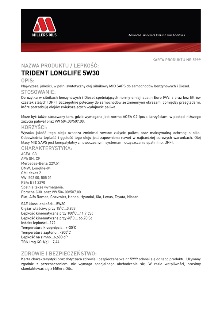 KARTA PRODUKTU NR 5999 NAZWA PRODUKTU / LEPKOŚĆ: TRIDENT LONGLIFE 5W30 OPIS: Najwyższej jakości, w pełni syntetyczny olej silnikowy MID SAPS do samochodów benzynowych i Diesel. STOSOWANIE: Do użytku w silnikach benzynowych i Diesel spełniających normy emisji spalin Euro IV/V, z oraz bez filtrów cząstek stałych (DPF). Szczególnie polecany do samochodów ze zmiennymi okresami pomiędzy przeglądami, które potrzebują olejów zwiększających wydajność paliwa. Może być także stosowany tam, gdzie wymagana jest norma ACEA C2 (poza korzyściami w postaci niższego zużycia paliwa) oraz VW 504.00/507.00. KORZYŚCI: Wysoka jakość tego oleju oznacza zminimalizowane zużycie paliwa oraz maksymalną ochronę silnika. Odpowiednia lepkość i gęstość tego oleju jest zapewniona nawet w najbardziej surowych warunkach. Olej klasy MID SAPS jest kompatybilny z nowoczesnymi systemami oczyszczania spalin (np. DPF). CHARAKTERYSTYKA: ACEA: C3 API: SN, CF Mercedes-Benz: 229.51 BMW: Longlife-04 GM: dexos 2 VW: 502 00, 505 01 PSA: B71 2290 Spełnia także wymagania: Porsche C30 oraz VW 504.00/507.00 Fiat, Alfa Romeo, Chevrolet, Honda, Hyundai, Kia, Lexus, Toyota, Nissan. SAE klasa lepkości:...5W30 Ciężar właściwy przy 150C...0,853 Lepkość kinematyczna przy 1000C...11,7 cSt Lepkość kinematyczna przy 400C... 66,78 St Indeks lepkości...172 Temperatura krzepnięcia.. <-300C Temperatura zapłonu...>2000C Lepkość na zimno...6,600 cP TBN (mg KOH/g) ...7,44 ZDROWIE I BEZPIECZEŃSTWO: Karta charakterystyki oraz dotycząca zdrowia i bezpieczeństwa nr 5999 odnosi się do tego produktu. Używany zgodnie z przeznaczeniem, nie wymaga specjalnego obchodzenia się. W razie wątpliwości, prosimy skontaktować się z Millers Oils.