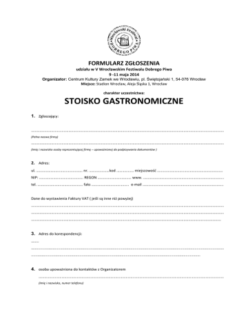 FORMULARZ ZGŁOSZENIA udziału w V Wrocławskim Festiwalu Dobrego Piwa 9 -11 maja 2014 Organizator: Centrum Kultury Zamek we Wrocławiu, pl. Świętojański 1, 54-076 Wrocław Miejsce: Stadion Wrocław, Aleja Śląska 1, Wrocław charakter uczestnictwa: STOISKO GASTRONOMICZNE 1. Zgłaszający: ………………………………………………………………………………………………………………………………………………………………………………… (Pełna nazwa firmy) ………………………………………………………………………………………………………………………………………………………………………………… (Imię i nazwisko osoby reprezentującej firmę – upoważnionej do podpisywania dokumentów ) 2. Adres: ul. …………………….………….…….… nr. …………………kod ……………… miejscowość …...…………………………………………………….. NIP: ………………………………………. REGON ……………………….……. www. ……….……………………………………………………………….. tel. …………………….………….……… faks …………………………….….. e-mail ………….………….………….……….…………………………….. Dane do wystawienia Faktury VAT ( jeśli są inne niż powyżej) ………………………………………………………………………………………………………………………………………………………………………………… ………………………………………………………………………………………………………………………………………………………………………………… ……………………………………………………………………………………………………………………………………………………………………………… 3. Adres do korespondencji: …….. …….................................................................................................................................................................................. ................................................................................................................................................................. 4. osoba upoważniona do kontaktów z Organizatorem …………………………………………………………………………………………………………………………………………………………………………. (Imię i nazwisko, numer telefonu) 5. Rezerwuję miejsce na stoisko gastronomiczne: (podział według cennika opłat na miejsce pod działalność gastronomiczną): Do 6 m² w strefie I ( 1500 zł brutto / 3 dni + opłata za energię ) * Do 25 m² w strefie I ( 3000 zł brutto / 3 dni + opłata za energię ) * Do 8 m² w strefie II ( 1200 zł brutto / 3 dni + opłata za energię ) * DODATKOWE USŁUGI REKLAMOWE*: - reklama tekstowa na stronie Festiwalu (50 zł brutto) * - baner reklamowy na stronie Festiwalu (200 zł brutto) * *- właściwe podkreślić 6. Oferowane menu (rodzaj, produkcja własna lub kraj pochodzenia produktu - podstawa do weryfikacji) ………………………………………………………………………………………………………………………………………………………………………… ………………………………………………………………………………………………………………………………………………………………………… ………………………………………………………………………………………………………………………………………………………………………… ………………………………………………………………………………………………………………………………………………………………………… ………………………………………………………………………………………………………………………………………………………………………… ………………………………………………………………………………………………………………………………………………………………………… ……………………………………………………………………………………………................................................................................ ………………………………………………………………………………………………………………………………………………………………………… ……………………………………………………………………………………………............................................................................... ………………………………………………………………………………………………………………………………………………………………………… ………………………………………………………………………………………………………………………………………………………………………… ………………………………………………………………………………………………………………………………………………………………………… ………………………………………………………………………………………………………………………………………………………………………… ………………………………………………………………………………………………………………………………………………