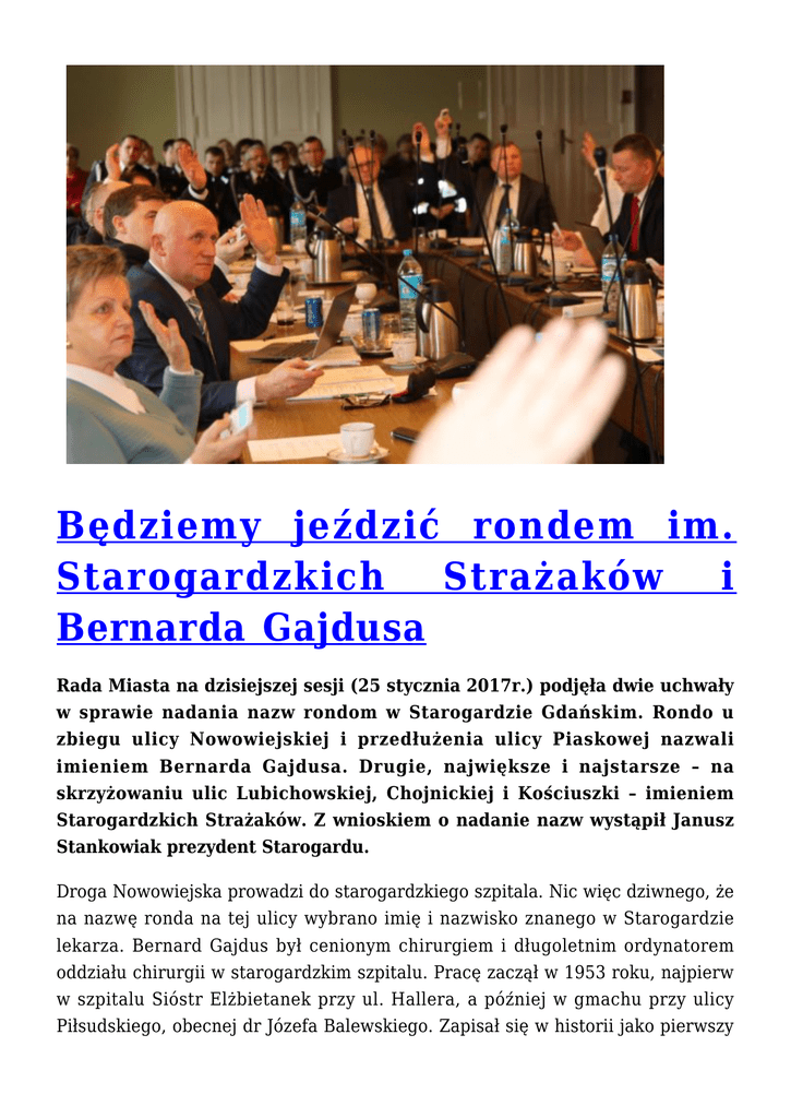 Będziemy jeździć rondem im. Starogardzkich Strażaków i Bernarda Gajdusa Rada Miasta na dzisiejszej sesji (25 stycznia 2017r.) podjęła dwie uchwały w sprawie nadania nazw rondom w Starogardzie Gdańskim. Rondo u zbiegu ulicy Nowowiejskiej i przedłużenia ulicy Piaskowej nazwali imieniem Bernarda Gajdusa. Drugie, największe i najstarsze – na skrzyżowaniu ulic Lubichowskiej, Chojnickiej i Kościuszki – imieniem Starogardzkich Strażaków. Z wnioskiem o nadanie nazw wystąpił Janusz Stankowiak prezydent Starogardu. Droga Nowowiejska prowadzi do starogardzkiego szpitala. Nic więc dziwnego, że na nazwę ronda na tej ulicy wybrano imię i nazwisko znanego w Starogardzie lekarza. Bernard Gajdus był cenionym chirurgiem i długoletnim ordynatorem oddziału chirurgii w starogardzkim szpitalu. Pracę zaczął w 1953 roku, najpierw w szpitalu Sióstr Elżbietanek przy ul. Hallera, a później w gmachu przy ulicy Piłsudskiego, obecnej dr Józefa Balewskiego. Zapisał się w historii jako pierwszy lekarz w Starogardzie Gdańskim, który wykonał pionierską operację na otwartym sercu. Rondo z imieniem pioniera operacji na otwartym sercu – 23 listopada 1986 roku otrzymałem wiadomość telefoniczną, że przywieziono pacjenta w stanie krytycznym – wspominał dr Gajdus. – Był to siedemnastoletni chłopak z raną kłutą klatki piersiowej, w stanie wstrząsu i z tamponadą serca. Natychmiast z synem Andrzejem – ówczesnym studentem medycyny – pojechałem do szpitala, zbadałem rannego i mimo stanu agonalnego podjąłem decyzję o operacji. Asystowali mi dr Landowski, mój syn, instrumentowała siostra Bagińska, znieczulenie wykonał dr Enriko Grotta. Lekarzem dyżurnym był wtedy dr Florek. (…) Wybór był oczywisty – albo dać umrzeć, albo operować. Pamiętam, że zoperowane serce dałem potrzymać synowi ze słowami: „Czy uda Ci się jeszcze trzymać w ręku żywe ludzkie serce?”. Operacja trwała prawie 3 godziny, zakończyła się o trzeciej nad ranem. O godz. 5 nawiązaliśmy z Franusiem kontakt słowny. Chłopiec po obudzeniu nie zdawał sobie sprawy z tego, co się stało. Odpoczęliśmy dopiero o godz. 8 rano.(…). [źródło. http://kociewiacy.pl] Rondo im. Bernarda Gajdusa Bernard Gajdus urodził się 28 kwietnia 1916 roku w Papowie Toruńskim. Zmarł w Starogardzie 22 grudnia 2001 roku. Został odznaczony „Medalem za zasługi dla Starogardu Gdańskiego” oraz uhonorowany odznaką „Zasłużonym Ziemi Gdańskiej”. Otrzymał też jedno z wysokich odznaczeń Stolicy Apostolskiej za zaangażowanie w pracę na rzecz Kościoła – medal papieski „Pro Ecclesia et Pontifice”. – Nadanie nazwy rondu jego imieniem jest sposobem upamiętnienia tego znakomitego, oddanego starogardzianom lekarza, który przez ponad 40 lat pracował w tutejszym szpitalu – uzasadnił wnioskodawca. Hołd dla starogardzkich strażaków Podczas, gdy pierwszą uchwałę w sprawie nadania nazwy rondu im. Bernarda Gajdusa radni podjęli jednomyślnie, tak w przypadku drugiej jednomyślności nie było, co nie znaczy że rondo nie otrzymało nowej nazwy. Stosunkiem głosów: 13 „za” i 7 „wstrzymujących się” radni podjęli uchwałę w sprawie nazwania ronda u zbiegu ulic Lubichowskiej, Chojnickiej i Tadeusza Kościuszki imieniem Starogardzkich Strażaków. Nazwa nie dziwi, tym bardziej że w sąsiedztwie tego najstarszego i największego ronda w mieście znajdują się właśnie siedziby Państwowej oraz Ochotniczej Straży Pożarnej. Zdaniem wnioskodawcy Strażacy szczególnie zasłużyli na takie uhonorowanie. – Nie ma chyba bardziej ryzykownego zajęcia mającego na celu niesienie pomocy w sytuacjach kryzysowych oraz zapewnianie bezpieczeństwa mieszkańcom – powiedział prezydent Stankowiak. Rondo im. Starogardzkich Strażaków Strażacy nierzadko narażają własne zdrowie, a nawet życie, by komuś pomóc. Ich zawód wymaga niezwykłej odwagi, ale także wszechstronnej wiedzy i sprawności, czyli ciągłego podnoszenia kwalifikacji, odbywania systematycznych szkoleń i ćwiczeń. Warto zaznaczyć, że Ochotnicza Straż Pożarna w Starogardzie Gdańskim funkcjonuje już od 155 lat, niezależnie od sytuacji politycznej i ustrojowej w Polsce. Strażacy – ochotnicy poświęcają swój wolny czas, ryzykując zdrowie i życie w służbie społecznej. Wszystkim strażakom przyświeca motto: „Bogu na chwałę, ludziom na ratunek”. Każdy z nich prezentuje postawę godną naśladowania, dlatego ci starogardzcy doczekali się swojego ronda. Za podjęcie uchwały radnym podziękował prezes Ochotniczej Straży Pożarnej Łukasz Zblewski. Zrobił to nie tylko w imieniu swoim i reprezentacji, która pojawiła się na sesji Rady Miasta, ale wszystkich starogardzkich strażaków. Nie tylko dwa ronda doczekały się swoich nazw. Mamy też nowe nazwy kilku ulic: 1) Kręta (gminna droga publiczna położona w rejonie ul. Skarszewskiej, Derdowskiego i Granicznej), 2) Generała Augusta Fieldorfa „Nila” (pomiędzy ul. Skarszewską i Niemojewskiego), 3) Generała Stefana Roweckiego „Grota” (pomiędzy ul. Skarszewską i Kleeberga), 4) Szarych Szeregów (w rejonie ul. Powstańców Warszawskich), 5) Żołnierzy Wyklętych (pomiędzy ul. Bohaterów Getta i Gusowskiego), 6) Feliksa Selmanowicza „Zagończyka” (pomiędzy ul. Gusowskiego i Kociewską), 7) Danuty Siedzikówny „Inki” (pomiędzy ul. Babilińskiej i Kociewską).