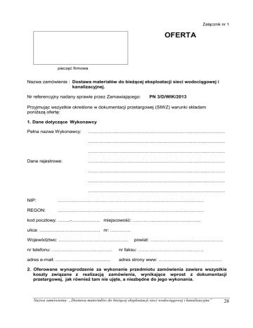 Załącznik nr 1 OFERTA pieczęć firmowa Nazwa zamówienia : Dostawa materiałów do bieżącej eksploatacji sieci wodociągowej i kanalizacyjnej. Nr referencyjny nadany sprawie przez Zamawiającego: PN 3/D/WIK/2013 Przyjmując wszystkie określone w dokumentacji przetargowej (SIWZ) warunki składam poniższą ofertę: 1. Dane dotyczące Wykonawcy Pełna nazwa Wykonawcy: ……………………………………………………………………………. ……………………………………………………………………………. ………………………………………………………………….………… Dane rejestrowe: ……………………………………………………………….…………… ………………………………………………………………….………… …………………………………………………………….……………… ……………………………………………………………………………. NIP: …………………………………………………………………………………. REGON: …………………………………………………………………………………. kod pocztowy: ……..-……………… miejscowość: …………………………………….. ulica: ………………………………… nr: …………. Województwo: ……………………………………… powiat: ……………………………………….. nr telefonu: ………………………………… nr faksu: …………………………………… adres e-mail: ……………………….......... adres strony www: ..………………………………… 2. Oferowane wynagrodzenie za wykonanie przedmiotu zamówienia zawiera wszystkie koszty związane z realizacją zamówienia, wynikające wprost z dokumentacji przetargowej, jak również tam nie ujęte, a niezbędne do jego wykonania. Nazwa zamówienia: „Dostawa materiałów do bieżącej eksploatacji sieci wodociągowej i kanalizacyjne” 28 OFERUJEMY: realizację przedmiotu zamówienia na warunkach zgodnych z opisanymi w specyfikacji istotnych warunków zamówienia (SIWZ) oraz określonych w niniejszej ofercie, a mianowicie : 1. Oferujemy wykonanie całości zamówienia za cenę netto: ……………………. PLN, (słownie: …………………………………………………………………………………… ………………………………………………………………………………………. PLN), 2. Oferujemy wykonanie całości zamówienia za cenę brutto …………………………PLN), (słownie: ………………………………………………………………………….……….. …………………………………………………………………………………………PLN). 3. Osoba uprawniona do kontaktów oraz adres korespondencyjny Imię i nazwisko Adres Nr tel./fax Adres e-mail 4. W treści oferty zastrzegamy jako niejawne następujące dokumenty zawierające informacje stanowiące tajemnicę przedsiębiorstwa w rozumieniu art. 11 ust. 4 ustawy o zwalczaniu nieuczciwej konkurencji oznaczone klauzulą „TAJNE”: ................................................................................................................................. W przypadku braku zastrzeżenia zaleca się napisać: „Nie zastrzegamy żadnych informacji” lub nie wypełniać. 5. Czas realizacji zamówienia Oświadczam, że zamówienie zostanie wykonane w terminie od dnia podpisania umowy do dnia 28.02.2014r.. 6 Okres gwarancji i rękojmi Oświadczam, że warunki gwarancji i rękojmi, przyjmujemy zgodnie z obowiązującymi przepisami określonymi w umowie przez Zamawiającego oraz SIWZ. 7. Okres związania z ofertą Oświadczam, że jestem związany ofertą na okres 30 dni, licząc od ostatecznego terminu złożenia oferty. 8. Oświadczenia Oświadczamy, że: zapoznaliśmy się ze Specyfikacją Istotnych Warunków Zamówienia, załącznikami oraz projektem umowy i przyjmujemy je bez zastrzeżeń, zamówienie wykonamy samodzielnie, Nazwa zamówienia: „Dostawa materiałów do bieżącej eksploatacji sieci wodociągowej i kanalizacyjne” 29 Załączniki do oferty, stanowiące jej integralną część: 1) …………………………………………………………, 2) …………………………………………………………, 3) …………………………………………………………, 4) …………………………………………………………., 5) ………………………………………………………… . …………………………………………… /pieczęci i podpisy osób upoważnionych/ Nazwa zamówienia: „Dostawa materiałów do bieżącej eksploatacji sieci wodociągowej i kanalizacyjne” 30 Arkusz kalkulacyjny oferty L.p. Nazwa i typ materiału Ilość 1 kołnierz ślepy DN80 PN16 8 otworów 1 2 kołnierz ślepy DN100 PN16 8 otworów 1 3 kołnierz ślepy DN150 PN16 8 otworów 1 4 kołnierz ślepy DN200 PN16 8 otworów 1 5 zwężka dwukołnierzowa FFR DN 65/50 L200 PN16 8 otworów 1 6 zwężka dwukołnierzowa FFR DN 80/65 L200 PN16 8 otworów 1 7 zwężka dwukołnierzowa FFR DN 100/65 L200 PN16 8 otworów 1 8 zwężka dwukołnierzowa FFR DN 100/80 L200 PN16 8 otworów 2 9 zwężka dwukołnierzowa FFR DN 125/80 L200 PN16 8 otworów 1 10 zwężka dwukołnierzowa FFR DN 125/100 L200 PN16 8 otworów 1 11 zwężka dwukołnierzowa FFR DN 150/80 L200 PN16 8 otworów 1 12 zwężka dwukołnierzowa FFR DN 150/100 L200 PN16 8 otworów 1 13 zwężka dwukołnierzowa FFR DN 150/125 L200 PN16 8 otworów 1 14 zwężka dwukołnierzowa FFR DN 200/150 L300 PN16 8 otworów 1 15 Trójnik kołnierzowy T DN 80/50 PN16 8 otworów 1 16 Trójnik kołnierzowy T DN 80/80 PN16 8 otworów 1 17 Trójnik kołnierzowy T DN 100/50 PN16 8 otworów 1 18 Trójnik kołnierzowy T DN 100/80 PN16 8 otworów 1 19 Trójnik kołnierzowy 