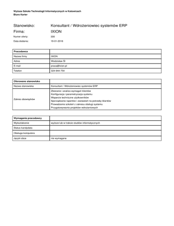 Wyższa Szkoła Technologii Informatycznych w Katowicach Biuro Karier Stanowisko: Konsultant / Wdrożeniowiec systemów ERP Firma: IXION Numer oferty: 330 Data dodania: 19-01-2016 Pracodawca Nazwa firmy IXION Adres Wodzisław Śl E-mail [email protected] Telefon 324-944-754 Oferowane stanowisko Nazwa stanowiska Konsultant / Wdrożeniowiec systemów ERP Zbieranie i analiza wymagań klientów Zakres obowiązków Konfiguracja i parametryzacja systemu Wsparcie techniczne użytkowników Sporządzanie raportów i zestawień na potrzeby klientów Prowadzenie szkoleń z zakresu obsługi systemu Przygotowywanie projektów wdrożeniowych Wymagania pracodawcy Wykształcenie wyższe lub w trakcie studiów informatycznych Status kandydata Obsługa komputera Języki obce nie wymagane -Gotowość i zdolność do szybkiego nabywania wiedzy -Komunikatywność, -Umiejętność pracy w zespole, -Samodzielność, -Zdolność do analitycznego myślenia, -Znajomość baz danych; umiejętność budowania zapytań w języku SQL, -Znajomości narzędzi pakietu Office – w szczególności MS Excel, -Podstawowa wiedza z zakresu konfiguracji systemów operacyjnych i serwerów, Mile widziane: Umiejętności, predyspozycje - Zaawansowana znajomość języka SQL; triggery, procedury składowane, - Znajomość systemu ERP (Streamsoft, Comarch Optima XL,Raks,Sage,Navireo itp), - Znajomość dowolnego narzędzia raportującego; np. Crystal Reports, Jasper Reports, Report Builder, itp. - Znajomość podstaw programowania – preferowane .NET, Delphi, VBA, - Zaawansowana znajomość obsługi Microsoft Office - Excel, - Znajomość procesów wiążących się z działalnością biznesową przedsiębiorstw np. sprzedaż,gospodarka magazynowa, zaopatrzenie, - zarządzanie produkcją, księgowość, kadry-płace, - Znajomość systemów z rodziny Linux; swoboda w korzystaniu z powłoki bash - Prawo jazdy kat. B 1/2 Warunki pracy Wymagane dokumenty potwierdzenie wykształcenia Forma umowy umowa o pracę Czas zatrudnienia do ustalenia Godzinowy wymiar pracy pełny 8 godzin Data rozpoczęcia pracy 0000-00-00 Inne świadczenia Rekrutacja Termin i forma zgłoszenia CV na podanego maila do zakończenia rekrutacji Sposób kontaktowania się z firmą mail Dodatkowe informacje 2/2