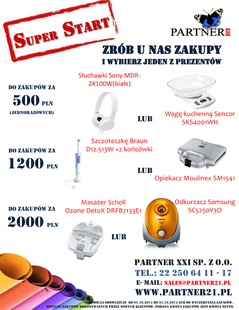 Zrób u nas zakupy i wybierz jeden z prezentów do zakupów za 500 Słuchawki Sony MDR2X100W(białe) pln (jednorazowych) lub do zakupów za 1200 2000 Szczoteczkę Braun D12.513W +2 końcówki pln do zakupów za Wagę kuchenną Sencor SKS4001WH lub Masażer Scholl Ozone DetoX DRFB7133E1 Opiekacz Moulinex SM1541 Odkurzacz Samsung SC5250V3O pln lub Partner XXI Sp. z o.o. tel.: 22 250 64 11 - 17 E- mail: [email protected] www.partner21.pl Promocja obowiAzuje od 01.10.2014 do 31.10.2014 lub do wyczerpania zapasów. Dotyczy zakupów dokonywanych przez nowych klientów. Podana Kwota zakupów jest kwota netto.