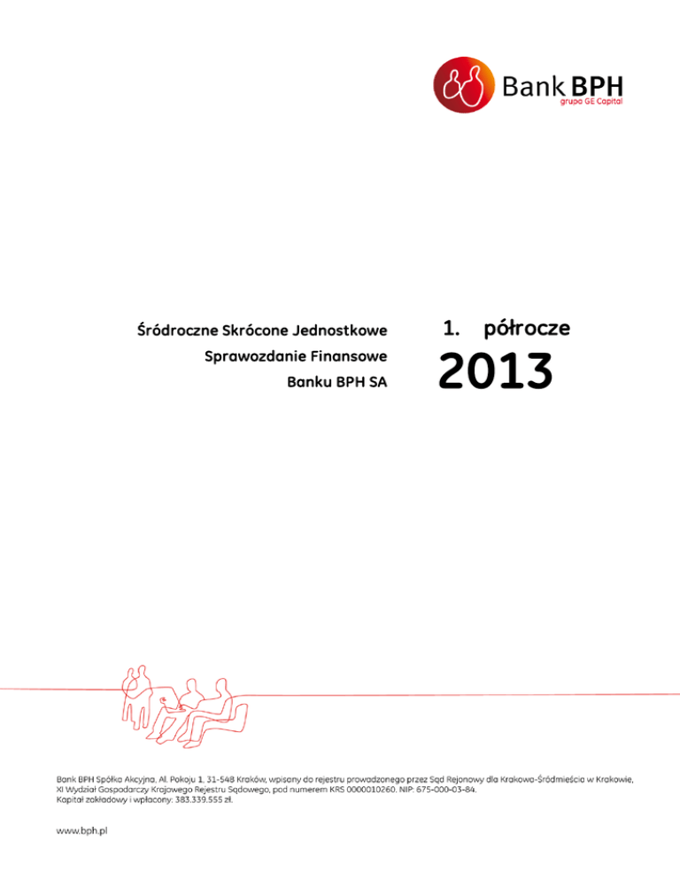 Śródroczne Skrócone Jednostkowe Sprawozdanie Finansowe Banku BPH SA 1. półrocze 2013 Roczne Jednostkowe Sprawozdanie Finansowe Banku BPH SA 45 Spis treści Rachunek zysków i strat ....................................................................................................................................... 3 Sprawozdanie z całkowitych dochodów .............................................................................................................. 3 Sprawozdanie z sytuacji finansowej .................................................................................................................... 4 Sprawozdanie ze zmian w kapitale własnym ...................................................................................................... 5 Sprawozdanie z przepływów pieniężnych ........................................................................................................... 6 Noty do śródrocznego skróconego jednostkowego sprawozdania finansowego Banku BPH SA za 1. półrocze 2013 roku ............................................................................................................................................ 7 1. Podstawowe dane o emitencie .............................................................................................................. 7 2. Zatwierdzenie sprawozdania finansowego .......................................................................................... 7 3. Oświadczenie o zgodności ...................................................................................................................... 7 4. Zasady sporządzania śródrocznego skróconego jednostkowego sprawozdania finansowego ....... 7 a) Znaczące zasady rachunkowości ................................................................................................................................ 8 b) Zmiany zasad rachunkowości ...................................................................................................................................... 8 c) Sezonowość lub cykliczność działalności .................................................................................................................. 8 5. Wartości szacunkowe ............................................................................................................................. 8 6. Sprawozdawczość dotycząca segmentów działalności ....................................................................... 9 7. Wynik z tytułu odsetek ......................................................................................................................... 12 8. Odpisy z tytułu utraty wartości ........................................................................................................... 13 9. Wynik z tytułu prowizji ......................................................................................................................... 13 10. Wynik na instrumentach finansowych wycenianych do wartości godziwej przez rachunek zysków i strat i z tytułu różnic kursowych ...................................................................................................................... 14 11. Koszty działania i koszty ogólnego zarządu ....................................................................................... 15 12. Podatek dochodowy .............................................................................................................................. 15 13. Kasa i operacje z Bankiem Centralnym ............................................................................................... 16 14. Środki pieniężne i ekwiwalenty środków pieniężnych ....................................................................... 16 15. Aktywa finansowe wyceniane według wartości godziwej przez rachunek zysków i strat .............. 17 16. Należności od banków .......................................................................................................................... 18 17. Należności od klientów ......................................................................................................................... 18 18. Odpisy z tytułu utraty wartości należności ......................................................................................... 19 19. Aktywa finansowe dostępne do sprzedaży ......................................................................................... 19 20. Aktywa trwałe rzeczowe ....................................................................................................................... 19 21. Wartości niematerialne ........................................................................................................................ 20 22. Aktywa przeznaczone do sprzedaży i zobowiązania związane z aktywami przeznaczonymi do sprzedaży ............................................................................................................................................................. 20 23. Pozostałe aktywa .................................................................................................................................. 21 24. Zobowiązania wobec Banku Centralnego ........................................................................................... 21 25. Zobowiązania wobec banków .............................................................................................................. 21 26. Zobowiązania wobec klientów ............................................................................................................. 22 27. Zobowiązania wobec pozostałych instytucji ....................................................................................... 22 28. Zobowiązania z tytułu emisji własnych papierów wartościowych .................................................... 23 29. Rezerwy ............................................................................................
