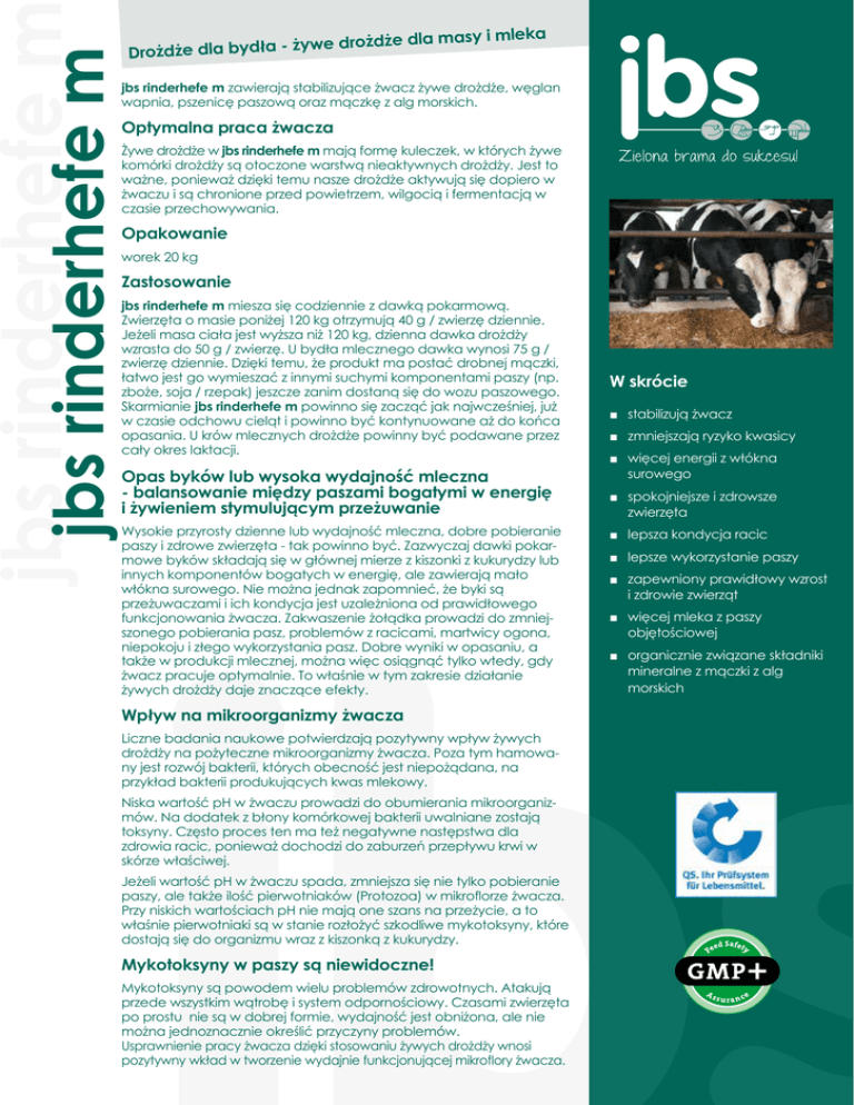 jbs rinderhefe m jbs rinderhefe i mleka we drożdże dla masy ży a dł by a dl e dż Droż jbs rinderhefe m zawierają stabilizujące żwacz żywe drożdże, węglan wapnia, pszenicę paszową oraz mączkę z alg morskich. Optymalna praca żwacza Żywe drożdże w jbs rinderhefe m mają formę kuleczek, w których żywe komórki drożdży są otoczone warstwą nieaktywnych drożdży. Jest to ważne, ponieważ dzięki temu nasze drożdże aktywują się dopiero w żwaczu i są chronione przed powietrzem, wilgocią i fermentacją w czasie przechowywania. Opakowanie worek 20 kg Zastosowanie jbs rinderhefe m miesza się codziennie z dawką pokarmową. Zwierzęta o masie poniżej 120 kg otrzymują 40 g / zwierzę dziennie. Jeżeli masa ciała jest wyższa niż 120 kg, dzienna dawka drożdży wzrasta do 50 g / zwierzę. U bydła mlecznego dawka wynosi 75 g / zwierzę dziennie. Dzięki temu, że produkt ma postać drobnej mączki, łatwo jest go wymieszać z innymi suchymi komponentami paszy (np. zboże, soja / rzepak) jeszcze zanim dostaną się do wozu paszowego. Skarmianie jbs rinderhefe m powinno się zacząć jak najwcześniej, już w czasie odchowu cieląt i powinno być kontynuowane aż do końca opasania. U krów mlecznych drożdże powinny być podawane przez cały okres laktacji. Opas byków lub wysoka wydajność mleczna - balansowanie między paszami bogatymi w energię i żywieniem stymulującym przeżuwanie Wysokie przyrosty dzienne lub wydajność mleczna, dobre pobieranie paszy i zdrowe zwierzęta - tak powinno być. Zazwyczaj dawki pokarmowe byków składają się w głównej mierze z kiszonki z kukurydzy lub innych komponentów bogatych w energię, ale zawierają mało włókna surowego. Nie można jednak zapomnieć, że byki są przeżuwaczami i ich kondycja jest uzależniona od prawidłowego funkcjonowania żwacza. Zakwaszenie żołądka prowadzi do zmniejszonego pobierania pasz, problemów z racicami, martwicy ogona, niepokoju i złego wykorzystania pasz. Dobre wyniki w opasaniu, a także w produkcji mlecznej, można więc osiągnąć tylko wtedy, gdy żwacz pracuje optymalnie. To właśnie w tym zakresie działanie żywych drożdży daje znaczące efekty. Wpływ na mikroorganizmy żwacza Liczne badania naukowe potwierdzają pozytywny wpływ żywych drożdży na pożyteczne mikroorganizmy żwacza. Poza tym hamowany jest rozwój bakterii, których obecność jest niepożądana, na przykład bakterii produkujących kwas mlekowy. Niska wartość pH w żwaczu prowadzi do obumierania mikroorganizmów. Na dodatek z błony komórkowej bakterii uwalniane zostają toksyny. Często proces ten ma też negatywne następstwa dla zdrowia racic, ponieważ dochodzi do zaburzeń przepływu krwi w skórze właściwej. Jeżeli wartość pH w żwaczu spada, zmniejsza się nie tylko pobieranie paszy, ale także ilość pierwotniaków (Protozoa) w mikroflorze żwacza. Przy niskich wartościach pH nie mają one szans na przeżycie, a to właśnie pierwotniaki są w stanie rozłożyć szkodliwe mykotoksyny, które dostają się do organizmu wraz z kiszonką z kukurydzy. Mykotoksyny w paszy są niewidoczne! Mykotoksyny są powodem wielu problemów zdrowotnych. Atakują przede wszystkim wątrobę i system odpornościowy. Czasami zwierzęta po prostu nie są w dobrej formie, wydajność jest obniżona, ale nie można jednoznacznie określić przyczyny problemów. Usprawnienie pracy żwacza dzięki stosowaniu żywych drożdży wnosi pozytywny wkład w tworzenie wydajnie funkcjonującej mikroflory żwacza. W skrócie ■ stabilizują żwacz ■ zmniejszają ryzyko kwasicy ■ więcej energii z włókna surowego ■ spokojniejsze i zdrowsze zwierzęta ■ lepsza kondycja racic ■ lepsze wykorzystanie paszy ■ zapewniony prawidłowy wzrost i zdrowie zwierząt ■ więcej mleka z paszy objętościowej ■ organicznie związane składniki mineralne z mączki z alg morskich jbs rinderhefe m jbs rinderhefe Próba sitowa Optymalną pracę żwacza łatwo jest ocenić na podstawie kontroli odchodów zwierzęcia, najlepiej w formie próby sitowej: w wyniku lepszego wykorzystania pasz w odchodach zmniejsza się zawartość niestrawionych resztek włókna i ziaren. Działanie żywych drożdży w żwaczu Żwacz jest mikroświatem wielu różnorodnych istnień. Pojedyncze przedstawienie wszystkich reakcji biochemicznych, które w nim zachodzą, jest w zasadzie niemożliwe. Mimo to, w ciągu ostatnich 30 lat działanie żywych drożdzy zostało częściowo zbadane: 1. jbs rinderhefe m wykorzystują tlen ze żwacza. Poprzez wiązanie tlenu jbs rinderhefe m wspierają rozwój mikroorganizmów rozkładających celulozę. Efekty działania widać już po krótkim czasie w odchodach zwierząt: zmniejsza się ilość niestrawionego włókna oraz resztek ziaren, wykorzystanie paszy wzrasta, zwierzęta są spokojniejsze. żywienie bez dodatku żywych drożdży 2. jbs rinderhefe m zmieniają proporcje w produkcji kwasów. Ilość obniżającego wartość pH kwasu mlekowego spada, podczas gdy zawartość dostarczającego energię kwasu propionowego wzrasta. Dzięki temu dostępne jest więcej energii do tworzenia mięśni. 3. jbs rinderhefe m utrzymują wartość pH w żwaczu w optymalnym zakresie. Mniej problemów z kwasicą = lepsza kondycja racic, mniej nekroz ogona, spokojniejsze zwierzęta. Pierwotniaki mogą rozkładać toksyny. żywienie z dodatkiem żywych drożdży 4. jbs rinderhefe m wspierają syntezę białka. Pozytywny wpływ żywych drożdży umożliwia bakteriom rozwój w żwaczu. Zwierzę może wykorzystać więcej wysokowartościowego białka bakteryjnego do budowy mięśni i produkcji mleka. Doświadczenia paszowe z żywymi drożdżami w opasaniu końcowym Doświadczenia paszowe wykazały, że dzięki skarmianiu żywymi drożdżami osiągnąć można zwiększone pobieranie pasz oraz lepszą wydajność mięsną. Jednocześnie zauważono również pozytywny wpływ na zdrowotność zwierząt. rasa przyrost d