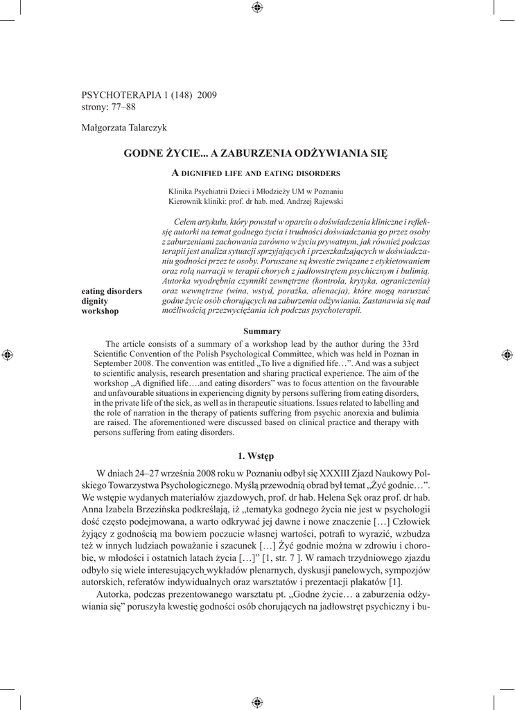 Psychoterapia 1 (148) 2009 strony: 77–88 Małgorzata Talarczyk Godne życie... a zaburzenia odżywiania się A dignified life and eating disorders Klinika Psychiatrii Dzieci i Młodzieży UM w Poznaniu Kierownik kliniki: prof. dr hab. med. Andrzej Rajewski eating disorders dignity workshop Celem artykułu, który powstał w oparciu o doświadczenia kliniczne i refleksję autorki na temat godnego życia i trudności doświadczania go przez osoby z zaburzeniami zachowania zarówno w życiu prywatnym, jak również podczas terapii jest analiza sytuacji sprzyjających i przeszkadzających w doświadczaniu godności przez te osoby. Poruszane są kwestie związane z etykietowaniem oraz rolą narracji w terapii chorych z jadłowstrętem psychicznym i bulimią. Autorka wyodrębnia czynniki zewnętrzne (kontrola, krytyka, ograniczenia) oraz wewnętrzne (wina, wstyd, porażka, alienacja), które mogą naruszać godne życie osób chorujących na zaburzenia odżywiania. Zastanawia się nad możliwością przezwyciężania ich podczas psychoterapii. Summary The article consists of a summary of a workshop lead by the author during the 33rd Scientific Convention of the Polish Psychological Committee, which was held in Poznan in September 2008. The convention was entitled „To live a dignified life…”. And was a subject to scientific analysis, research presentation and sharing practical experience. The aim of the workshop „A dignified life….and eating disorders” was to focus attention on the favourable and unfavourable situations in experiencing dignity by persons suffering from eating disorders, in the private life of the sick, as well as in therapeutic situations. Issues related to labelling and the role of narration in the therapy of patients suffering from psychic anorexia and bulimia are raised. The aforementioned were discussed based on clinical practice and therapy with persons suffering from eating disorders. 1. Wstęp W dniach 24–27 września 2008 roku w Poznaniu odbył się XXXIII Zjazd Naukowy Polskiego Towarzystwa Psychologicznego. Myślą przewodnią obrad był temat „Żyć godnie…”. We wstępie wydanych materiałów zjazdowych, prof. dr hab. Helena Sęk oraz prof. dr hab. Anna Izabela Brzezińska podkreślają, iż „tematyka godnego życia nie jest w psychologii dość często podejmowana, a warto odkrywać jej dawne i nowe znaczenie […] Człowiek żyjący z godnością ma bowiem poczucie własnej wartości, potrafi to wyrazić, wzbudza też w innych ludziach poważanie i szacunek […] Żyć godnie można w zdrowiu i chorobie, w młodości i ostatnich latach życia […]” [1, str. 7 ]. W ramach trzydniowego zjazdu odbyło się wiele interesujących wykładów plenarnych, dyskusji panelowych, sympozjów autorskich, referatów indywidualnych oraz warsztatów i prezentacji plakatów [1]. Autorka, podczas prezentowanego warsztatu pt. „Godne życie… a zaburzenia odżywiania się” poruszyła kwestię godności osób chorujących na jadłowstręt psychiczny i bu- 78 Małgorzata Talarczyk limię. Celem warsztatu było zwrócenie uwagi na okoliczności i sytuacje przeszkadzające w zachowaniu godności przez osoby chore na zaburzenia odżywiania się, zarówno w ich życiu prywatnym, jak i w sytuacjach terapeutycznych. 2. Godność Godność człowieka (dignitas hominis) rozpatrywana może być jako pojęcie filozoficzne, etyczne oraz psychologiczne, a także w sensie prawnym. Pierwsze koncepcje godności ukształtowane zostały w starożytnej Grecji. O godności pisali m.in. Arystoteles, twórca pojęcia „etyka”, oraz Immanuel Kant, a także Fryderyk Nietzsche. Kant pisał m.in., że podstawą godności natury ludzkiej jest autonomia. Nietzsche podkreślał, że najwyższym dobrem jest życie i wszystkie działania służące dynamicznemu rozwojowi jednostki [2]. O godności człowieka w psychologii pisał trzydzieści lat temu Józef Kozielecki w swoim eseju pt. O godności człowieka [3]. „Czym jest godność? Chociaż pojęcie to jest do pewnego stopnia nieokreślone, tak jak poczucie piękna, chociaż każdy człowiek buduje sobie odrębną definicję godności, to jednak w tej różnorodności określeń można znaleźć pewne wspólne, charakterystyczne rysy [….] Godność jest trwałym przekonaniem jednostki o jej autentycznej wartości, jako człowieka będącego niepodzielną całością: jest ono moralnym składnikiem osobowości każdego z nas […] Mimo iż pojęcie godności zawsze odgrywało ważną rolę w życiu jednostki, to jednak jego treść i przejawy zmieniały się wraz z charakterem epoki […] Pojęcie godności nie jest raz na zawsze ustalone, zmienia się ono historycznie, tak jak poczucie wolności czy poczucie odpowiedzialności” [s. 10–11]. Kozielecki wyodrębnia dwa rodzaje godności, to jest: godność ludzką, związaną z prawami człowieka, i godność osobistą jako cechę charakteru [3, 4]. W etyce współczesnej wyróżnia się trzeci rodzaj godności, określanej jako godność społeczna lub zawodowa, która związana jest z jedną z podejmowanych przez człowieka ról [2]. − Godność ludzka przez humanistów opisywana jest jako wartość najwyższa. Moraliści i prawodawcy tworzą normy z myślą o poszanowaniu i przestrzeganiu godności. Prawa cywilizowanych państw gwarantują człowiekowi bezpieczeństwo fizyczne, wolność osobistą, wolność słowa i dowolność zrzeszania się oraz prawa obywatelskie, prawo do nauki i prawo do pracy. Godność ludzka najpełniej opisana jest w Deklaracji praw człowieka z 1948 roku. − Godność osobista odnosi się do poczucia własnej wartości jako osoby kierującej się w życiu wyznawanym systemem wartości i ideałów oraz zachowującej dozę krytycyzmu w stosunku do siebie i innych. Godność osobista rozumiana jest także jako postawa otwartości na to, co nowe i godne uznania. Godność osobista opisywana jest również jako postawa i cecha charakteru, jest t