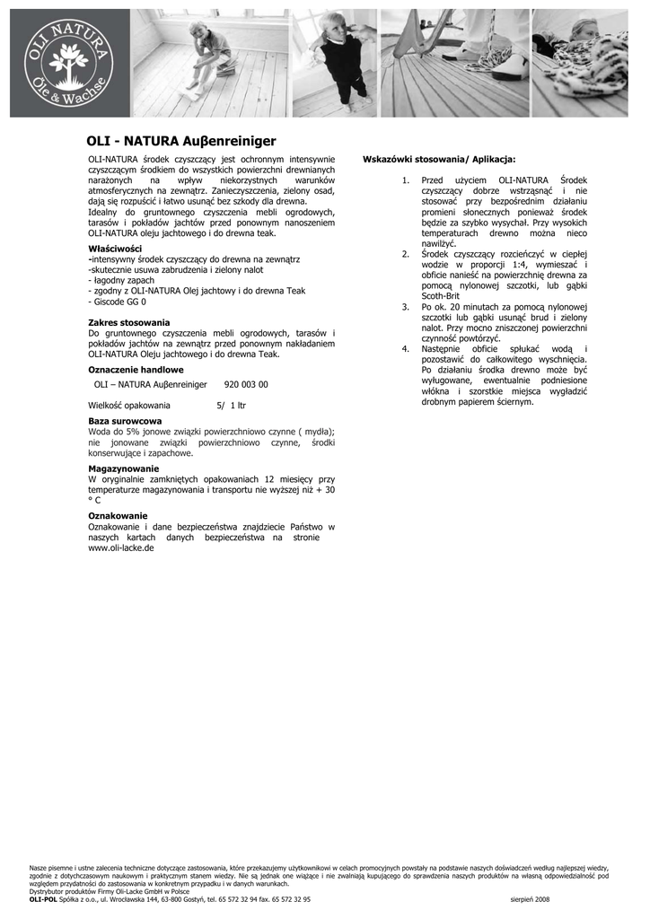 OLI - NATURA Auβenreiniger OLI-NATURA środek czyszczący jest ochronnym intensywnie czyszczącym środkiem do wszystkich powierzchni drewnianych narażonych na wpływ niekorzystnych warunków atmosferycznych na zewnątrz. Zanieczyszczenia, zielony osad, dają się rozpuścić i łatwo usunąć bez szkody dla drewna. Idealny do gruntownego czyszczenia mebli ogrodowych, tarasów i pokładów jachtów przed ponownym nanoszeniem OLI-NATURA oleju jachtowego i do drewna teak. Właściwości -intensywny środek czyszczący do drewna na zewnątrz -skutecznie usuwa zabrudzenia i zielony nalot - łagodny zapach - zgodny z OLI-NATURA Olej jachtowy i do drewna Teak - Giscode GG 0 Zakres stosowania Do gruntownego czyszczenia mebli ogrodowych, tarasów i pokładów jachtów na zewnątrz przed ponownym nakładaniem OLI-NATURA Oleju jachtowego i do drewna Teak. Oznaczenie handlowe OLI – NATURA Auβenreiniger Wielkość opakowania 920 003 00 5/ 1 ltr Wskazówki stosowania/ Aplikacja: 1. 2. 3. 4. Przed użyciem OLI-NATURA Środek czyszczący dobrze wstrząsnąć i nie stosować przy bezpośrednim działaniu promieni słonecznych ponieważ środek będzie za szybko wysychał. Przy wysokich temperaturach drewno można nieco nawilżyć. Środek czyszczący rozcieńczyć w ciepłej wodzie w proporcji 1:4, wymieszać i obficie nanieść na powierzchnię drewna za pomocą nylonowej szczotki, lub gąbki Scoth-Brit Po ok. 20 minutach za pomocą nylonowej szczotki lub gąbki usunąć brud i zielony nalot. Przy mocno zniszczonej powierzchni czynność powtórzyć. Następnie obficie spłukać wodą i pozostawić do całkowitego wyschnięcia. Po działaniu środka drewno może być wyługowane, ewentualnie podniesione włókna i szorstkie miejsca wygładzić drobnym papierem ściernym. Baza surowcowa Woda do 5% jonowe związki powierzchniowo czynne ( mydła); nie jonowane związki powierzchniowo czynne, środki konserwujące i zapachowe. Magazynowanie W oryginalnie zamkniętych opakowaniach 12 miesięcy przy temperaturze magazynowania i transportu nie wyższej niż + 30 °C Oznakowanie Oznakowanie i dane bezpieczeństwa znajdziecie Państwo w naszych kartach danych bezpieczeństwa na stronie www.oli-lacke.de Nasze pisemne i ustne zalecenia techniczne dotyczące zastosowania, które przekazujemy użytkownikowi w celach promocyjnych powstały na podstawie naszych doświadczeń według najlepszej wiedzy, zgodnie z dotychczasowym naukowym i praktycznym stanem wiedzy. Nie są jednak one wiążące i nie zwalniają kupującego do sprawdzenia naszych produktów na własną odpowiedzialność pod względem przydatności do zastosowania w konkretnym przypadku i w danych warunkach. Dystrybutor produktów Firmy Oli-Lacke GmbH w Polsce OLI-POL Spółka z o.o., ul. Wrocławska 144, 63-800 Gostyń, tel. 65 572 32 94 fax. 65 572 32 95 sierpień 2008