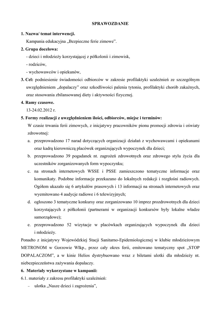 SPRAWOZDANIE 1. Nazwa/ temat interwencji. Kampania edukacyjna „Bezpieczne ferie zimowe”. 2. Grupa docelowa: - dzieci i młodzieży korzystającej z półkolonii i zimowisk, - rodziców, - wychowawców i opiekunów, 3. Cel: podniesienie świadomości odbiorców w zakresie profilaktyki uzależnień ze szczególnym uwzględnieniem „dopalaczy” oraz szkodliwości palenia tytoniu, profilaktyki chorób zakaźnych, oraz stosowania zbilansowanej diety i aktywności fizycznej. 4. Ramy czasowe. 13-24.02.2012 r. 5. Formy realizacji z uwzględnieniem ilości, odbiorców, miejsc i terminów: W czasie trwania ferii zimowych, z inicjatywy pracowników pionu promocji zdrowia i oświaty zdrowotnej: a. przeprowadzono 17 narad dotyczących organizacji działań z wychowawcami i opiekunami oraz kadrą kierowniczą placówek organizujących wypoczynek dla dzieci; b. przeprowadzono 39 pogadanek nt. zagrożeń zdrowotnych oraz zdrowego stylu życia dla uczestników zorganizowanych form wypoczynku; c. na stronach internetowych WSSE i PSSE zamieszczono tematyczne informacje oraz komunikaty. Podobne informacje przekazano do lokalnych redakcji i rozgłośni radiowych. Ogółem ukazało się 6 artykułów prasowych i 13 informacji na stronach internetowych oraz wyemitowano 4 audycje radiowe i 6 telewizyjnych; d. ogłoszono 3 tematyczne konkursy oraz zorganizowano 10 imprez prozdrowotnych dla dzieci korzystających z półkolonii (partnerami w organizacji konkursów były lokalne władze samorządowe); e. przeprowadzono 52 wizytacje w placówkach organizujących wypoczynek dla dzieci i młodzieży. Ponadto z inicjatywy Wojewódzkiej Stacji Sanitarno-Epidemiologicznej w klubie młodzieżowym METRONOM w Gorzowie Wlkp., przez cały okres ferii, emitowano tematyczny spot „STOP DOPALACZOM”, a w kinie Helios dystrybuowano wraz z biletami ulotki dla młodzieży nt. niebezpieczeństwa zażywania dopalaczy. 6. Materiały wykorzystane w kampanii: 6.1. materiały z zakresu profilaktyki uzależnień: − ulotka „Nasze dzieci i zagrożenia”, − broszura „Narkotyki - niebezpieczne związki”, − broszura „Jest ich wiele: amfetamina, marihuana, LSD, heroina”, − broszura, poradnik dla rodziców „Szukaj porozumienia ze swoim dzieckiem”, − broszura / poradnik dla rodziców „Bliżej siebie – dalej od narkotyków”, − plakaty „Dopalacze mogą Cię wypalić”, − ulotki nt. dopalaczy dla młodzieży i rodziców; 6.2. materiały z zakresu profilaktyki chorób zakaźnych: − broszura „Co musisz wiedzieć o HIV/AIDS…”, − ulotka „STOP meningokokom”, − ulotka nt. profilaktyki grypy, − ulotka „Test na HIV, test na odpowiedzialność”, − zakładka „ene, due, AIDS…” Powyższe materiały zostały opracowane i wydane nakładem Głównego Inspektoratu Sanitarnego, Krajowego Biura ds. Przeciwdziałania Narkomanii oraz Krajowego Centrum ds. AIDS; 7. Skutki realizacji: podniesienie świadomości zdrowotnej 13.550 osób – odbiorców kampanii. KIEROWNIK Oddziału Promocji Zdrowia i Oświaty Zdrowotnej mgr Mirosława Boksz - Kąkalec