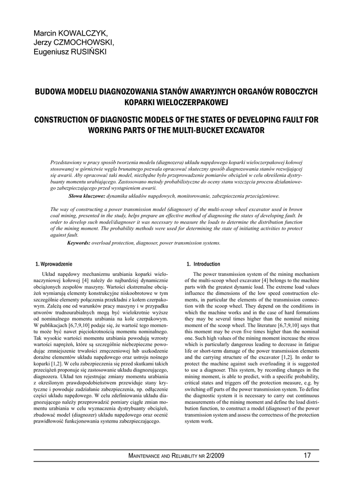 Marcin KOWALCZYK, Jerzy CZMOCHOWSKI, Eugeniusz RUSIŃSKI BUDOWA MODELU DIAGNOZOWANIA STANÓW AWARYJNYCH ORGANÓW ROBOCZYCH KOPARKI WIELOCZERPAKOWEJ CONSTRUCTION OF DIAGNOSTIC MODELS OF THE STATES OF DEVELOPING FAULT FOR WORKING PARTS OF THE MULTI-BUCKET EXCAVATOR Przedstawiony w pracy sposób tworzenia modelu (diagnozera) układu napędowego koparki wieloczerpakowej kołowej stosowanej w górnictwie węgla brunatnego pozwala opracować skuteczny sposób diagnozowania stanów rozwijającej się awarii. Aby opracować taki model, niezbędne było przeprowadzenie pomiarów obciążeń w celu określenia dystrybuanty momentu urabiającego. Zastosowano metody probabilistyczne do oceny stanu wszczęcia procesu działaniowego zabezpieczającego przed wystąpieniem awarii. Słowa kluczowe: dynamika układów napędowych, monitorowanie, zabezpieczenia przeciążeniowe. The way of constructing a power transmission model (diagnoser) of the multi-scoop wheel excavator used in brown coal mining, presented in the study, helps prepare an effective method of diagnosing the states of developing fault. In order to develop such model/diagnoser it was necessary to measure the loads to determine the distribution function of the mining moment. The probability methods were used for determining the state of initiating activities to protect against fault. Keywords: overload protection, diagnoser, power transmission systems. 1. Wprowadzenie 1. Introduction Układ napędowy mechanizmu urabiania koparki wielonaczyniowej kołowej [4] należy do najbardziej dynamicznie obciążonych zespołów maszyny. Wartości ekstremalne obciążeń wymiarują elementy konstrukcyjne niskoobrotowe w tym szczególnie elementy połączenia przekładni z kołem czerpakowym. Zależą one od warunków pracy maszyny i w przypadku utworów trudnourabialnych mogą być wielokrotnie wyższe od nominalnego momentu urabiania na kole czerpakowym. W publikacjach [6,7,9,10] podaje się, że wartość tego momentu może być nawet pięciokrotnością momentu nominalnego. Tak wysokie wartości momentu urabiania powodują wzrosty wartości naprężeń, które są szczególnie niebezpieczne powodując zmniejszenie trwałości zmęczeniowej lub uszkodzenie doraźne elementów układu napędowego oraz ustroju nośnego koparki [1,2]. W celu zabezpieczenia się przed skutkami takich przeciążeń proponuje się zastosowanie układu diagnozującego, diagnozera. Układ ten rejestrując zmiany momentu urabiania z określonym prawdopodobieństwem przewiduje stany krytyczne i powoduje zadziałanie zabezpieczenia, np. odłączenie części układu napędowego. W celu zdefiniowania układu diagnozującego należy przeprowadzić pomiary ciągłe zmian momentu urabiania w celu wyznaczenia dystrybuanty obciążeń, zbudować model (diagnozer) układu napędowego oraz ocenić prawidłowość funkcjonowania systemu zabezpieczającego. The power transmission system of the mining mechanism of the multi-scoop wheel excavator [4] belongs to the machine parts with the greatest dynamic load. The extreme load values influence the dimensions of the low speed construction elements, in particular the elements of the transmission connection with the scoop wheel. They depend on the conditions in which the machine works and in the case of hard formations they may be several times higher than the nominal mining moment of the scoop wheel. The literature [6,7,9,10] says that this moment may be even five times higher than the nominal one. Such high values of the mining moment increase the stress which is particularly dangerous leading to decrease in fatigue life or short-term damage of the power transmission elements and the carrying structure of the excavator [1,2]. In order to protect the machine against such overloading it is suggested to use a diagnoser. This system, by recording changes in the mining moment, is able to predict, with a specific probability, critical states and triggers off the protection measure, e.g. by switching off parts of the power transmission system. To define the diagnostic system it is necessary to carry out continuous measurements of the mining moment and define the load distribution function, to construct a model (diagnoser) of the power transmission system and assess the correctness of the protection system work. MAINTENANCE AND RELIABILITY NR 2/2009 17 NAUKA I TECHNIKA 2. Pomiary obciążeń elementów układu napędowego Wskazanie wartości ekstremalnej obciążeń elementów mechanizmu urabiania jest utrudnione ze względu na różnorodność w budowie układów napędowych i warunków urabiania koparek. Potrzeba ich optymalnego doboru występuje np. w przypadku modernizacji układu napędowego [8]. Pozyskanie informacji o obciążeniach ekstremalnych w miejscu dokonywania przebudowy może odbywać poprzez: 1. pomiar na elemencie konstrukcyjnym w miejscu dokonywania przebudowy, 2. pomiar na dostępnym członie mechanizmu poza miejscem dokonywania przebudowy i obliczanie z uwzględnieniem przełożeń pomiędzy stopniami [6], 3. zastosowanie diagnozera układu napędowego, którego stan modelowy jest dostrajany poprzez pomiar na obiekcie w dostępnych miejscach [5,6], 4. prowadzenie symulacji numerycznych na modelu układu napędowego [6,7]. 2. Measurements of the power transmission elements’ load It is difficult to determine the extreme load value for elements of the mining mechanism due to the differences in the transmission systems’ construction and conditions in which excavators work. It is necessary to choose an optimum one e.g. while modernising a power transmission system [8]. The information on extreme loads in the place of modernisation may be acquired by: 1. measurement at the construction element at the point of modernisation; 2. measurement at the construction element accessible, other than the point of modernisation, calculated taking into consideration the shift between the stages [6]; 3. using a diagnoser of the power transmissi