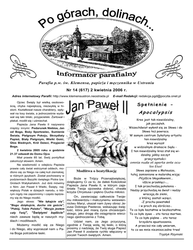 Nr 14 (617)/1 PO GÓRACH, DOLINACH... 2 kwietnia 2006 r. Parafia p.w. św. Klemensa, papieŜa i męczennika w Ustroniu Nr 14 (617) 2 kwietnia 2006 r. Adres internetowy Parafii: http://www.klemensustron.neostrada.pl Ojciec Święty był wielką osobowością, chyba największą, niezwykłą w historii. Kształtował nasze charaktery, wpływał na losy świata, a jednocześnie wydawał się taki bliski, przyjacielski. śartował i płakał, modlił się i uśmiechał. PapieŜa Jana Pawła II nazywano między innymi: Podarunek Niebios, Jan od Boga, BoŜy Sportowiec, Sumienie Świata, Pielgrzym Pokoju, Skrzydlaty PapieŜ, Biały Pielgrzym, Wielki Gość, Głos Biednych, Król Dzieci, Przyjaciel Boga. 2 kwietnia 2005 roku o godzinie 21.37 odszedł do Domu Ojca. Miał prawie 85 lat. Swój pontyfikat zakończył słowem: Amen. Na wiadomość o odejściu PapieŜa prawie cały świat wstrzymał oddech, modlono się za Niego na całej kuli ziemskiej, w róŜnych językach. Został pochowany w podziemiach Bazyliki świętego Piotra tzw. Grotach Watykańskich. JuŜ dziś mówimy o Nim: Jan Paweł II Wielki, Święty, największy Polak w dziejach narodu, o którym nigdy nie zapomnimy i często będziemy się do Niego modlić. Jego słowa: "Nie lękajcie się", "Bogu dziękujcie, ducha nie gaście", "Pokój, Tobie Polsko", "Maryjo jestem cały Twój", "Świętymi bądźcie" E-mail Redakcji: [email protected] Spełnienie - Apocalypsis Modlitwa o beatyfikację BoŜe w Trójcy Przenajświętszej, dziękujemy Ci za to, Ŝe dałeś Kościołowi PapieŜa Jana Pawła II, w którym zajaśniała Twoja ojcowska dobroć, chwała krzyŜa Chrystusa i piękno Ducha miłości. On, zawierzając całkowicie Twojemu miłosierdziu i matczynemu wstawiennictwu Maryi, ukazał nam Ŝywy obraz Jezusa Dobrego Pasterza, wskazując świętość, która jest miarą Ŝycia chrześcijańskiego, jako drogę dla osiągnięcia wieczniech zawsze będą w naszych my- nego zjednoczenia z Tobą. ślach i modlitwach. Udziel nam, za Jego przyczyną, MoŜemy modlić się za Niego zgodnie z Twoją wolą, tej łaski, o którą i do Niego, aby wypraszał nam u Pa- prosimy z nadzieją, Ŝe Twój sługa PapieŜ Jan Paweł II zostanie rychło włączony w na Boga potrzebne łaski. poczet Twoich świętych. Amen. Kres jest tak niewidzialny, jak początek. Wszechświat wyłonił się ze Słowa i do Słowa teŜ powraca. W samym centrum Sykstyny artysta ten niewidzialny kres wyraził w widzialnym dramacie Sądu I ten niewidzialny kres stał się widzialny jakby szczyt przejrzystości: omnia nuda et aperta ante oculos Eius! Słowa zapisane u Mateusza, tutaj zamienione w malarską wizję: «Pójdźcie błogosławieni... idźcie przeklęci»... I tak przechodzą pokolenia Nadzy przychodzą na świat i nadzy wracają do ziemi, z której zostali wzięci. «Z prochu powstałeś i w proch się obrócisz». To co było kształtne w bezkształtne. To co było Ŝywe — oto teraz martwe. To co było piękne — oto teraz brzydota spustoszenia. A przecieŜ nie cały umieram, to co we mnie niezniszczalne trwa! Tryptyk Rzymski Nr 14 (617)/2 PO GÓRACH, DOLINACH... V NIEDZIELA WIELKIEGO POS TU Dzisiaj coraz więcej ludzi, i to nie tylko duchownych, odkrywa, Ŝe chrześcijańska prawda o miłości Boga jest istotna i potrzebna do głębszego zrozumienia Boga i świata. Tę prawdę bardzo pięknie wyraŜają słowa z dzisiejszej Ewangelii św. Jana: „Tak Bóg umiłował świat, Ŝe Syna swego Jednorodzonego dał”. Przy mówieniu o wierze, wciąŜ jednak za często, pojawia się lista wymagających prawd, niezrozumiałych dogmatów i straszy się piekłem. Wiara jednak najlepiej rodzi się i wzrasta, gdy człowiek wierzy w miłość. Jeśli wierzy, Ŝe Bóg kocha świat, wszystkich ludzi i kaŜdego z osobna, nawet wówczas, gdy człowiek pogubi się i wejdzie na drogę grzechu. Bóg „bogaty w miłosierdzie” nie przeczy sobie samemu. Nie moŜe On obejść się bez nieustannego okazywania ludziom swej wielkiej i bezgranicznej miłości, która silniejsza jest od największych nawet zdrad. To miłość BoŜa jest najlepszym klimatem do budzenia i wzrastania wiary w człowieku. Czy budujemy swoją duchowość na świadomości, Ŝe jesteśmy kochani? Czy teŜ bliŜsza jest nam raczej myśl, Ŝe to my kochamy: Panie, kocham Cię, chcę Cię kochać. A tymczasem taka miłość jest wtórna. Powinniśmy wszystko budować na tym, co jest pierwsze, na tej wstrząsającej pewności, Ŝe Bóg nas kocha, Ŝe Bóg mnie kocha. Czy zastanawiamy się dlaczego Bóg obdarza nas tak wielką miłością? Dlaczego Jemu tak bardzo na nas zaleŜy? Kim my jesteśmy, Ŝe nieustannie wychodzi do nas ze swoją wielką miłością? Miłość BoŜa nie jest prawdą teoretyczną, bez pokrycia. Ta miłość została tak bardzo zainwestowana w świat i w kaŜdego z nas, Ŝe Bóg posłał swego Syna. Posłał swoje Słowo. On zechciał się do nas uśmiechać oczami ludzkimi. A zbawienie człowieka polega na przyjęciu lub odrzuceniu BoŜej miłości objawionej w Chrystusie. Z miłością Boga bardzo mocno został związany krzyŜ, który teŜ jest tematem dzisiejszej ewangelicznej rozmowy Jezusa z Nikodemem. W taki oto sposób Chrystus udowodnił i potwierdził swoją i Boga miłość do świata. KrzyŜ mówi o miłości pokonanej, a jednak ostatecznie zwycięskiej. Chrystus został upokorzony, a jednak otoczony chwałą. Zdradzony, a mimo tego wierny miłości Ojca. Jego wywyŜszenie na krzyŜu nie jest wyrazem mocy władczej, ale wyboru jednej mocy i prawdy, a jest nią miłość. Patrzymy zatem dzisiaj z wiarą i miłością na krzyŜ Chrystusa, na którym - jak mówi liturgia - zawisło zbawienie świata. Jak kiedyś wiara w miedzianego węŜa uratowała od śmierci ukąszonych przez jadowite węŜe Izraelitów, tak dziś ta sama wiara i miłość, nas współczesnych ludzi, codziennie dręczonych róŜnymi „ukąszeniami” grzechu, niewiary, pogubienia, moŜe uratować na pewno od wie