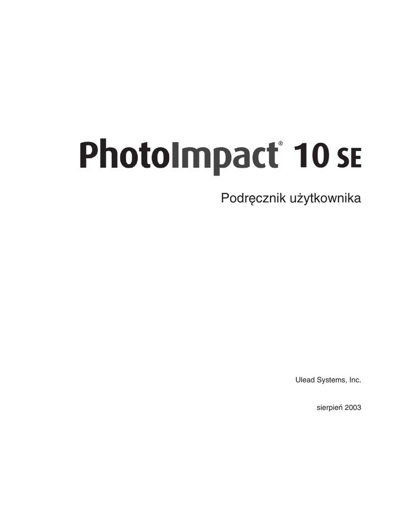 Podręcznik użytkownika Ulead Systems, Inc. sierpień 2003 2 PODRĘCZNIK UŻYTKOWNIKA PHOTOIMPACT Pierwsze wydanie programu Ulead® PhotoImpact® 10, sierpień 2004. © 1992 – 2004 Ulead Systems, Inc. Wszystkie prawa zastrzeżone. Żadna część tej publikacji nie może być powielana ani rozpowszechniana w żadnej formie w jakikolwiek sposób, elektroniczny ani mechaniczny, włączając w to fotokopiowanie, nagrywanie lub przechowywanie w systemie składowania, ani tłumaczona na żaden język w żadnej formie bez pisemnej zgody of Ulead Systems, Inc. Licencja oprogramowania Oprogramowanie opisane w tym dokumencie jest dostarczane pod kontrolą licencji, która jest zawarta z produktem. Licencja ta określa dozwolone i zabronione użycie produktu. Licencje i znaki towarowe ICI Library © 1991-1992 C-Cube Microsystems. ©1995-2004 Ulead Systems, Inc. Wszystkie prawa zastrzeżone. Ulead, logo Ulead, PhotoImpact, EasyPalette oraz Ulead GIF Animator są zastrzeżonymi znakami towarowymi i/lub znakami towarowymi firmy Ulead Systems, Inc. Intel oraz Pentium są zarejestrowanymi znakami towarowymi Intel Corporation. Microsoft, Windows, logo Windows i inne produkty Microsoft tutaj wymienione są znakami towarowymi i/lub zarejestrowanymi znakami towarowymi Microsoft Corporation w USA i innych krajach. Apple, QuickTime oraz logo QuickTime są znakami towarowymi Apple Computer, Inc., zarejestrowanymi w USA i innych krajach. QuickTime oraz logo QuickTime są znakami towarowymi używanymi zgodnie z licencją. Adobe, logo Adobe, Acrobat oraz logo Acrobat są znakami towarowymi Adobe Systems Incorporated. Digimarc, MarcCentre oraz MarcSpider są zarejestrowanymi znakami towarowymi Digimarc Corporation. Java i wszystkie pochodne znaki są zarejestrowanymi znakami towarowymi Sun Microsystems, Inc.w USA i innych krajach. Wszystkie pozostałe nazwy produktów i inne zarejestrowane i niezarejestrowanie nazwy i dowolne zarejestrowane i niezarejestrowane znaki towarowe wymienione tutaj są używane tylko w celu identyfikacji i pozostają wyłączną własnością ich prawowitych właścicieli. Pliki przykładowe Pliki udostępnione jako przykłady na CD programu mogą być używane dla celów prywatnych (demonstracji, wytwarzania i prezentacji). Żadne prawa nie są przyznane dla komercyjnej reprodukcji ani redystrybucji przykładowych plików. O wersji PhotoImpact 10 SE Niektóre funkcje opisane w tym podręczniku użytkownika nie są dostępne w wersji SE. Zajrzyj do „Dodatku” na stronie 355, aby poznać różnice pomiędzy wersjami pełną i wersją SE programu PhotoImpact 10. North & South America Ulead Systems, Inc. http://www.ulead.com Pomoc techniczna: http://www.ulead.com/tech Japan Ulead Systems, Inc. http://www.ulead.co.jp Pomoc techniczna: http://www.ulead.co.jp/tech Germany Ulead Systems GmbH http://www.ulead.de Pomoc techniczna: http://www.ulead.de/tech International Ulead Systems, Inc. http://www.ulead.com http://www.asiapac.ulead.com http://www.ulead.com.tw Pomoc techniczna: http://www.ulead.com/tech http://www.asiapac.ulead.com/tech http://www.ulead.com.tw/tech China Ulead Systems, Inc. http://www.ulead.com.cn Pomoc techniczna: http://www.ulead.com.cn/tech SPIS TREŚCI Spis treści ROZDZIAŁ 1: WPROWADZENIE............................................ 13 Co chcesz zrobić? ......................................................................... 14 Chcę pominąć podręcznik i zacząć pracę ...................................................14 Chcę zobaczyć co jest nowego w tej wersji ................................................14 Jestem nowym użytkownikiem ................................................................14 Chcę projektować strony WWW ...............................................................14 Chcę uporządkować moją kolekcję zdjęć i udostępniać je jako pokaz slajdów na CD.......................................................................................................15 Instalacja ..................................................................................... 15 Nowi użytkownicy PhotoImpact ............................................................... 15 Ponowne instalowanie programów ........................................................... 16 Uruchamianie programów ....................................................................... 16 PhotoImpact .........................................................................................16 Photo Explorer ......................................................................................16 GIF Animator ........................................................................................17 Album ..................................................................................................17 Ulead COOL 360 ....................................................................................17 Przegląd programów .................................................................... 17 PhotoImpact ......................................................................................... 17 Album.................................................................................................. 20 GIF Animator ........................................................................................ 22 Photo Explorer ...................................................................................... 23 Ulead COOL 360.................................................................................... 24 Co nowego?.................................................................................. 24 Profesjonalne narzędzia fotograficzne.................................................24 Narzędzia montażu i kreatywnego projektowania.................................25 Łatwy do nauki i używania................................................................26 Przeglądania dokumentacji i podręczników online ....................... 27 ROZDZIAŁ 2: ROZPOCZYNAMY...........
