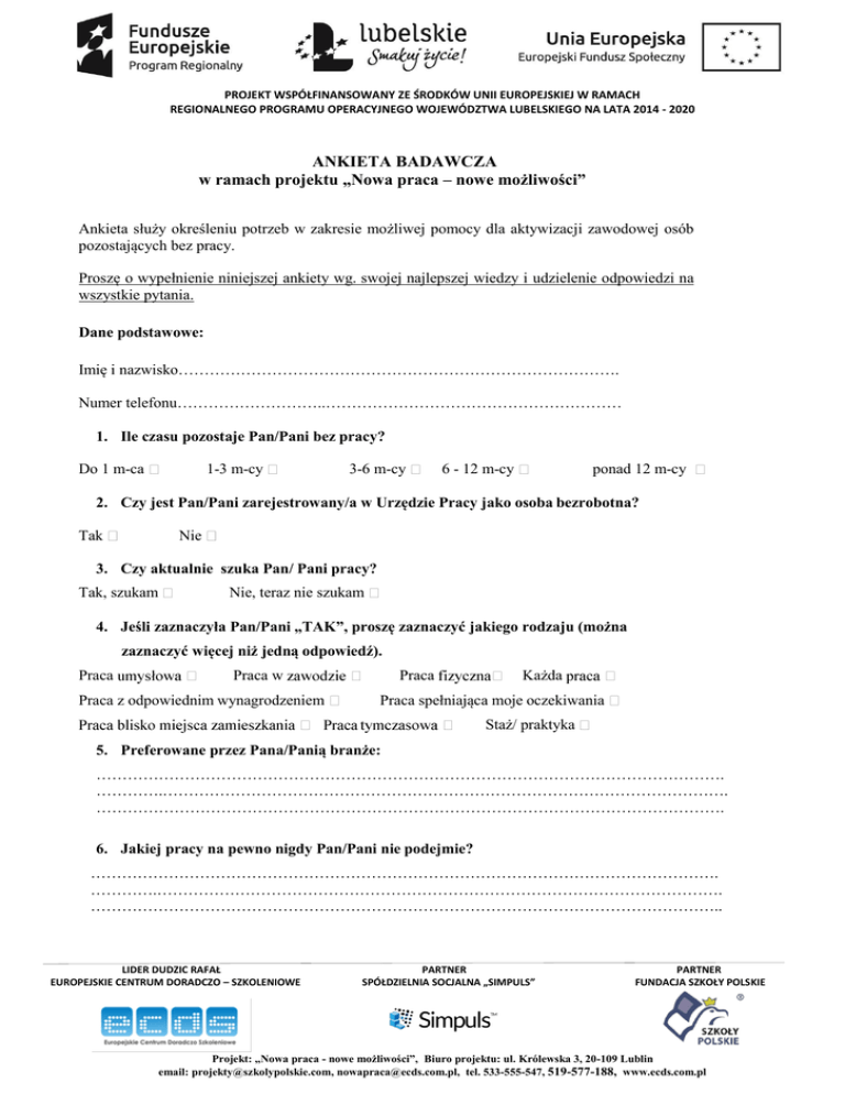 PROJEKT WSPÓŁFINANSOWANY ZE ŚRODKÓW UNII EUROPEJSKIEJ W RAMACH REGIONALNEGO PROGRAMU OPERACYJNEGO WOJEWÓDZTWA LUBELSKIEGO NA LATA 2014 - 2020 ANKIETA BADAWCZA w ramach projektu „Nowa praca – nowe możliwości” Ankieta służy określeniu potrzeb w zakresie możliwej pomocy dla aktywizacji zawodowej osób pozostających bez pracy. Proszę o wypełnienie niniejszej ankiety wg. swojej najlepszej wiedzy i udzielenie odpowiedzi na wszystkie pytania. Dane podstawowe: Imię i nazwisko…………………………………………………………………………. Numer telefonu………………………..………………………………………………… 1. Ile czasu pozostaje Pan/Pani bez pracy? Do 1 m-ca 1-3 m-cy 3-6 m-cy 6 - 12 m-cy ponad 12 m-cy 2. Czy jest Pan/Pani zarejestrowany/a w Urzędzie Pracy jako osoba bezrobotna? Tak Nie 3. Czy aktualnie szuka Pan/ Pani pracy? Tak, szukam Nie, teraz nie szukam 4. Jeśli zaznaczyła Pan/Pani „TAK”, proszę zaznaczyć jakiego rodzaju (można zaznaczyć więcej niż jedną odpowiedź). Praca Praca w Praca z odpowiednim wynagrodzeniem Praca Każda Praca spełniająca moje oczekiwania Staż/ praktyka 5. Preferowane przez Pana/Panią branże: …………………………………………………………………………………………………………. ………….………………………………………………………………………………………………. …………………………………………………………………………………………………………. 6. Jakiej pracy na pewno nigdy Pan/Pani nie podejmie? …………………………………………………………………………………………………………. ………….………………………………………………………………………………………………. ………………………………………………………………………………………………………….. LIDER DUDZIC RAFAŁ EUROPEJSKIE CENTRUM DORADCZO – SZKOLENIOWE PARTNER SPÓŁDZIELNIA SOCJALNA „SIMPULS” PARTNER FUNDACJA SZKOŁY POLSKIE Projekt: „Nowa praca - nowe możliwości”, Biuro projektu: ul. Królewska 3, 20-109 Lublin email: [email protected], [email protected], tel. 533-555-547, 519-577-188, www.ecds.com.pl PROJEKT WSPÓŁFINANSOWANY ZE ŚRODKÓW UNII EUROPEJSKIEJ W RAMACH REGIONALNEGO PROGRAMU OPERACYJNEGO WOJEWÓDZTWA LUBELSKIEGO NA LATA 2014 - 2020 7. Ile razy w ciągu ostatnich 6 m-cy rozmawiał/a Pan/ Pani w sprawie pracy z potencjalnym pracodawcą ? wcale jeden raz 2- kilkanaście razy -10 razy 8. Czy firmy w regionie Pani/Pana miejsca zamieszkania oferują Pani/Pana zdaniem dobre warunki zatrudnienia? Tak, raczej dobre Niezbyt dobre Niektóre firmy dobre a inne złe Nie wiem 9. Jak daleko byłby Pan/Pani skłonny dojeżdżać do pracy (czas dojazdu)? 0,5 - 1 - 20 min 10. Czy posiada Pan/ Pani jakieś przeciwwskazania zdrowotne dla wykonywania pracy fizycznej? Tak Nie Nic mi o tym nie wiadomo 11. Z jakich źródeł informacji najczęściej korzysta Pan/Pani w celu znalezienia pracy?(można zaznaczyć więcej niż jedną odpowiedź) Internet Sam/a wysyłam aplik Prasa Wizyty bezpośrednie w firmach 12. Czy mógłby Pan/Pani zmienić miejsce zamieszkania ze względu na pracę? Tak, czasowo dopuszczam taką Tylko, gdy z całą rodziną Tak, chę 13. Od czego Pan/ Pani zdaniem przede wszystkim zależy znalezienie pracy? (można zaznaczyć więcej niż jedną odpowiedź) to kwestia przypadku, „szczęścia” pomocy innych dobrego CV chęci i czasu przeznaczonego na szukanie nie ode mnie Dziękujemy za wypełnienie ankiety LIDER DUDZIC RAFAŁ EUROPEJSKIE CENTRUM DORADCZO – SZKOLENIOWE PARTNER SPÓŁDZIELNIA SOCJALNA „SIMPULS” PARTNER FUNDACJA SZKOŁY POLSKIE Projekt: „Nowa praca - nowe możliwości”, Biuro projektu: ul. Królewska 3, 20-109 Lublin email: [email protected], [email protected], tel. 533-555-547, 519-577-188, www.ecds.com.pl