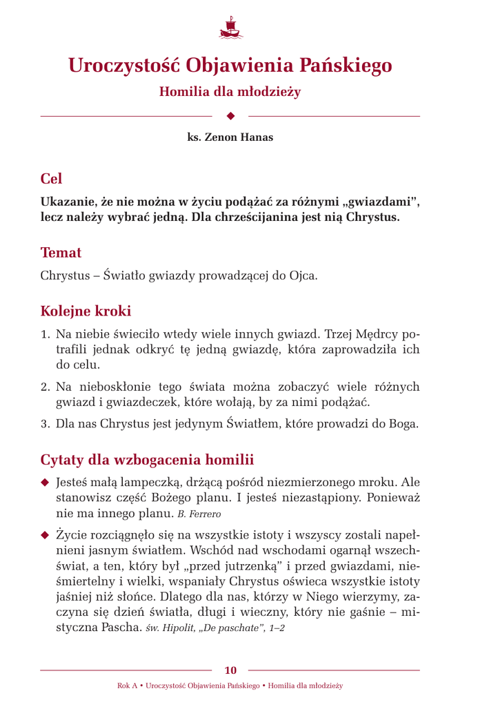 Uroczystość Objawienia Pańskiego Homilia dla młodzieży N ks. Zenon Hanas Cel Ukazanie, że nie można w życiu podążać za różnymi „gwiazdami”, lecz należy wybrać jedną. Dla chrześcijanina jest nią Chrystus. Temat Chrystus – Światło gwiazdy prowadzącej do Ojca. Kolejne kroki 1. Na niebie świeciło wtedy wiele innych gwiazd. Trzej Mędrcy potrafili jednak odkryć tę jedną gwiazdę, która zaprowadziła ich do celu. 2. Na nieboskłonie tego świata można zobaczyć wiele różnych gwiazd i gwiazdeczek, które wołają, by za nimi podążać. 3. Dla nas Chrystus jest jedynym Światłem, które prowadzi do Boga. Cytaty dla wzbogacenia homilii N Jesteś małą lampeczką, drżącą pośród niezmierzonego mroku. Ale stanowisz część Bożego planu. I jesteś niezastąpiony. Ponieważ nie ma innego planu. B. Ferrero N Życie rozciągnęło się na wszystkie istoty i wszyscy zostali napełnieni jasnym światłem. Wschód nad wschodami ogarnął wszechświat, a ten, który był „przed jutrzenką” i przed gwiazdami, nieśmiertelny i wielki, wspaniały Chrystus oświeca wszystkie istoty jaśniej niż słońce. Dlatego dla nas, którzy w Niego wierzymy, zaczyna się dzień światła, długi i wieczny, który nie gaśnie – mistyczna Pascha. św. Hipolit, „De paschate”, 1–2 10 Rok A • Uroczystość Objawienia Pańskiego • Homilia dla młodzieży Poszukiwania Boga W 2009 roku NASA rozpoczęła naukową misję pod nazwą „Kepler”. W ramach tej misji teleskop został wyniesiony w kosmos przez rakietę Delta II. Była to pierwsza misja NASA, która mogła zaobserwować planety wielkości Ziemi, a nawet mniejsze. Taki był jej główny cel: zbadanie różnorodnych systemów planetarnych. Za pomocą teleskopu naukowcy będą poszukiwać dodatkowych planet przy gwiazdach, obok których odkryto już planety pozasłoneczne. Naukowcy chcą też zbadać własności gwiazd, które posiadają układy planetarne. Wszystkie te wysiłki zmierzają do odpowiedzi na pytanie, czy istnieje życie na innych planetach. Czy we wszechświecie jesteśmy sami, jedyni, osamotnieni? A może są inne cywilizacje i istoty, z którymi moglibyśmy się skontaktować i stworzyć wspólnotę? Te pytania mają bardzo głębokie znaczenie. Poszukiwanie odpowiedzi nie tylko daje materiał do filmów science fiction o kosmicznych cywilizacjach. W tych pytaniach i poszukiwaniach ukrywa się głęboka tęsknota ludzkich serc, które nie chcą być samotne, opuszczone, niczyje. Wysłanie teleskopu w kosmos jest symbolem poszukiwania kogoś, kto nas kocha bezwarunkowo i bez ograniczeń. Inaczej mówiąc: poszukiwania Boga. Również opowieść o Trzech Mędrcach przypomina nam o tym poszukiwaniu. Tradycyjnie miało ich być trzech, choć Ewangelia nigdzie nie wspomina, ilu ich było naprawdę. Przynieśli trzy podarki, więc można by wnioskować, że każdy z nich przyniósł jeden. Nie liczba jest tutaj istotna. Dzięki Bogu ziemskich poszukiwaczy Boga jest o wiele więcej. Także dzisiaj niektórzy wychodzą na otwartą przestrzeń i uważnie się rozglądają, jak mogą odkryć obecność Boga w codziennym życiu. Światło gwiazdy prowadziło Trzech Mędrców do Betlejem. Przebłyskiwanie odległego światła było dla nich drogowskazem, który ukazywał szlak do stajenki. Na niebie świeciło wtedy wiele innych gwiazd. Migotały do nich ze wszystkich stron: ze wschodu i z zachodu, z północy i południa. Trzej Mędrcy potrafili jednak odkryć tę właściwą gwiazdę, która zaprowadziła ich do celu. Uradowali się, kiedy ją ujrzeli. A kiedy dotarli na miejsce, poznali Króla żydowskiego. 11 Rok A • Uroczystość Objawienia Pańskiego • Homilia dla młodzieży Weszli do domu i zobaczyli Dziecię z Matką Jego, Maryją; upadli na twarz i oddali Mu pokłon (Mt 1,11). Poszukiwanie Zbawiciela i Wybawcy trwa do dziś. Każdy musi przejść swoją drogę wiary i odnaleźć jej cel. Na nieboskłonie tego świata można zobaczyć wiele różnych gwiazd i gwiazdeczek. Mrugają do nas ze wszystkich stron. Migocą nie tylko z nocnego rozgwieżdżonego nieba, ale też z ekranów telewizyjnych, komputerowych, kinowych. Składają masy ponętnych obietnic i przyrzeczeń: „Chodź za mną! Pokażę ci drogę! Zaprowadzę cię do szczęścia i wolności! Nie słuchaj tego, co mówią inni, starsi! Nie słuchaj tego, co mówią nauczyciele i katecheci! Chodź za mną! Pokażę ci miejsce, gdzie to ty będziesz królem, a nie ktoś inny!”. Wydaje się, że obecnie poszukiwanie prawdziwej, autentycznej gwiazdy, która może nas szczęśliwie doprowadzić do celu, jest bardziej złożone i skomplikowane niż za czasów przywołanych dziś Mędrców. Mamy wprawdzie lepsze teleskopy, ale trudno nam się zorientować w gąszczu życiowych propozycji i oferowanych dróg. Niektórzy mówią, że należy po prostu spróbować wędrówki: raz powędrować na południe za jedną gwiazdą. Potem wybrać inną i podążać na północ. Kiedy nam się znudzi, trzeba wybrać następną i pójść na wschód. Życie staje się wówczas jak wędrówka nomadów przez pustynię. Może się okazać, że będzie nieustannym kręceniem się w kółko, bez obranego celu i przygotowanego planu. Nie wystarczy nam bowiem krótkiego życia na wypróbowanie wszystkich dróg. A może się okazać, że niektóre z nich poprowadzą nas na manowce, z których już nie będzie odwrotu. Opowieść o Mędrcach ze Wschodu przypomina nam prawdę, że Bóg stworzył nas nie dla bezsensownego błąkania się po ziemskich przestworzach, ale dla wspólnoty i spotkania z Nim. On objawił się osobiście w Jezusie Chrystusie. Ukazał nam swoją obecność, swoją twarz, swoją miłość. Dziś dla nas Jezus Chrystus jest jedynym światłem gwiazdy, która nas zaprowadzi do Boga. Nasze życie jest zbyt krótkie, aby kluczyć raz za jedną, a potem za inną gwiazdą. Należy znaleźć jedną z nich, podjąć decyzję i podążać za nią k