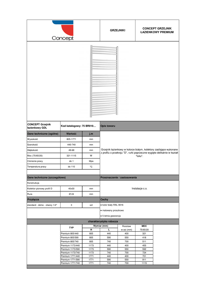 CONCEPT GRZEJNIK ŁAZIENKOWY PREMIUM GRZEJNIKI CONCEPT Grzejnik łazienkowy GDL Kod katalogowy: 75 BR010… Dane techniczne (ogólne) Wartość j.m Wysokość 805-1771 mm Szerokość 440-740 mm Głębokość 49-68 mm Moc (75/65/20) 321-1115 W Ciśnienie pracy do 1 Mpa Temperatura pracy do 110 o Opis towaru Grzejnik łazienkowy w kolorze białym, kolektory zasilające wykonane z profilu o przekroju "D", rurki poprzeczne wygięte delikatnie w kształt "łuku". C Dane techniczne (szczegółowe) Przeznaczenie / zastosowania Konstrukcja Kolektor pionowy profil D 40x30 mm Rura Ø 24 mm Instalacje c.o. Przyłącza standard - dolne - otwory 1/2" Cechy 3 ● kolor biały RAL 9016 szt ● malowany proszkowo ● 5-letnia gwarancja charakterystyka robocza Wymiar (mm) Rozstaw MOC H L w osi (mm) 75/65/20 Premium 805/440 805 440 400 321 Premium 805/590 805 590 550 418 Premium 805/740 805 740 700 511 Premium 1173/440 1173 440 400 455 Premium 1173/590 1173 590 550 592 Premium 1173/740 1173 740 700 724 Premium 1771/440 1771 440 400 701 Premium 1771/590 1771 590 550 911 Premium 1771/740 1771 740 700 1115 TYP