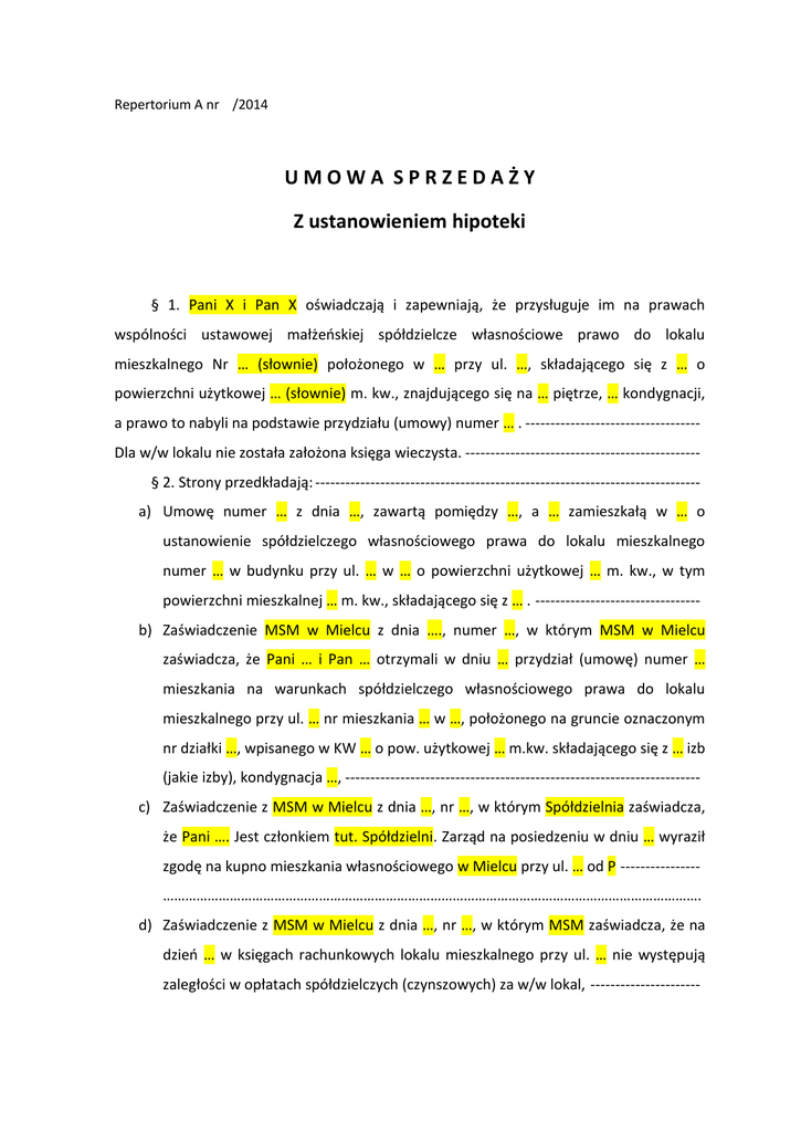 Repertorium A nr /2014 UMOWA SPRZEDAŻY Z ustanowieniem hipoteki § 1. Pani X i Pan X oświadczają i zapewniają, że przysługuje im na prawach wspólności ustawowej małżeńskiej spółdzielcze własnościowe prawo do lokalu mieszkalnego Nr … (słownie) położonego w … przy ul. …, składającego się z … o powierzchni użytkowej … (słownie) m. kw., znajdującego się na … piętrze, … kondygnacji, a prawo to nabyli na podstawie przydziału (umowy) numer … . ----------------------------------Dla w/w lokalu nie została założona księga wieczysta. ----------------------------------------------§ 2. Strony przedkładają: ----------------------------------------------------------------------------a) Umowę numer … z dnia …, zawartą pomiędzy …, a … zamieszkałą w … o ustanowienie spółdzielczego własnościowego prawa do lokalu mieszkalnego numer … w budynku przy ul. … w … o powierzchni użytkowej … m. kw., w tym powierzchni mieszkalnej … m. kw., składającego się z … . --------------------------------b) Zaświadczenie MSM w Mielcu z dnia …., numer …, w którym MSM w Mielcu zaświadcza, że Pani … i Pan … otrzymali w dniu … przydział (umowę) numer … mieszkania na warunkach spółdzielczego własnościowego prawa do lokalu mieszkalnego przy ul. … nr mieszkania … w …, położonego na gruncie oznaczonym nr działki …, wpisanego w KW … o pow. użytkowej … m.kw. składającego się z … izb (jakie izby), kondygnacja …, ----------------------------------------------------------------------c) Zaświadczenie z MSM w Mielcu z dnia …, nr …, w którym Spółdzielnia zaświadcza, że Pani …. Jest członkiem tut. Spółdzielni. Zarząd na posiedzeniu w dniu … wyraził zgodę na kupno mieszkania własnościowego w Mielcu przy ul. … od P ---------------………………………………………………………………………………………………………………………………. d) Zaświadczenie z MSM w Mielcu z dnia …, nr …, w którym MSM zaświadcza, że na dzień … w księgach rachunkowych lokalu mieszkalnego przy ul. … nie występują zaległości w opłatach spółdzielczych (czynszowych) za w/w lokal, ---------------------- e) Zaświadczenie z MSM w Mielcu z dnia …, w którym MSM zaświadcza, że Pani … posiada spółdzielcze własnościowe prawo do lokalu mieszkalnego w Mielcu przy ul. …, w/w nie zalega w opłatach czynszowych ani nie ma innych zobowiązań finansowych wobec Spółdzielni, Spółdzielnia oświadcza, że w stosunku do niej nie jest prowadzona egzekucja z nieruchomości, której częścią składową jest przedmiotowy lokal, Spółdzielnia nie znajduje się w upadłości, Spółdzielnia nie posiada informacji o tym, że w stosunku do spółdzielczego własnościowego prawa do lokalu został ustanowiony zakaz zbywania nieruchomości lub prowadzone jest postępowanie egzekucyjne, Mieszkanie nie posiada założonej księgi wieczystej, --f) Oświadczenie Banku ……………………I Oddział w Mielcu z dnia …., z którego wynika, że w/w Bank na podstawie umowy kredytu … udzielił Pani …, Panu … i Panu … mieszkaniowy kredyt hipoteczny, kwota i waluta kredytu … (słownie) złotych, termin spłaty na rzecz Banku został ustalony na dzień …, oprocentowanie kredytu wg zmiennej stopy procentowej, ulegnie zmianie w przypadkach określonych w umowie kredytowej, w przypadku niespłacenia całości lub części kredytu w terminie określonym w umowie kredytu lub w przypadku wypowiedzenia umowy kredytu przez Bank, oprocentowanie kredytu ulegnie podwyższeniu do 4 – krotności stopy kredytu lombardowego NBP w stosunku rocznym w przypadku stwierdzenia przez Bank pogorszenia się sytuacji finansowej Kredytobiorcy w stopniu zagrażającym spłacie wykorzystanego kredytu bądź niespełnienia przez Kredytobiorcę warunków określonych w umowie kredytu, Bank może wypowiedzieć umowę kredytu w całości lub w części, Bank oświadcza, że Kredytobiorca … i … małżonkowie … oraz … na zabezpieczenie spłaty wierzytelności z tytułu udzielonego kredytu ustanowią na rzecz Bank Polska Kasa Opieki SA I Oddział w Mielcu jednocześnie w formie pisemnej w akcie notarialnym hipotekę zwykła w wysokości … (słownie) złotych na zabezpieczenie kapitału udzielonego kredytu, --------------------------------------------------------- hipotekę kaucyjną do wysokości … (słownie) złotych na zabezpieczenie odsetek kapitałowych ustalonych według zmiennej stopy procentowej, prowizji oraz innych kosztów i należności ubocznych od w/w kredytu na spółdzielczym własnościowym prawie do lokalu mieszkalnego położonego w … przy ul. …, przysługującym Kredytobiorcy: … i … małżonkom … w ½ części oraz … w ½ części, wpisanym do księgi wieczystej Kw. Nr nowo założonej przez Sąd Rejonowy w Mielcu, --------------------------g) umowę numer … złotowego mieszkaniowego kredytu hipotecznego zawartą w … w dniu … pomiędzy Bankiem Polska Kasa Opieki SA z siedzibą w Warszawie, I Oddział w Mielcu ul. Obrońców Pokoju 7, 39-300 Mielec reprezentowanym przez pełnomocników ……………………………. i ………….………….., a Panią ………………………… i oraz Panem …………………….…, na mocy której to umowy Bank udziela Kredytobiorcom kredytu w kwocie … z przeznaczeniem na sfinansowanie nabycia na rynku wtórnym własnościowego spółdzielczego prawa do lokalu mieszkalnego numer …, położonego w budynku mieszkalnym wielorodzinnym nr … przy ul. … w …, dla którego Sąd Rejonowy w Mielcu Wydział Ksiąg Wieczystych założy nową księgę wieczystą.------------------------------------------------------------------------------------§ 3. Pan X i Pani X oświadczają, że lokal powyższy nie jest obciążony żadnymi długami, jak również nie ma żadnych zaległości pieniężnych związanych