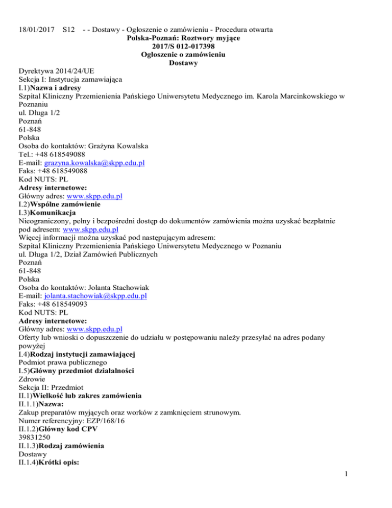 NULMNLOMNT pNO J J aostawó J lgłoszenie o zamówieniu J mrocedura otwarta molskaJmoznańW ooztworó mójące OMNT/p MNOJMNTPVU lgłoszenie o zamówieniu aostawó aórektówa OMN4LO4Lrb pekcja fW fnstótucja zamawiająca fKNFkazwa i adresó pzpital hlinicznó mrzemienienia mańskiego rniwersótetu jedócznego imK harola jarcinkowskiego w moznaniu ulK aługa NLO moznań SNJU4U molska lsoba do kontaktówW drażóna howalska TelKW +4U SNUR4VMUU bJmailW grazónaKkowalska@skppKeduKpl caksW +4U SNUR4VMUU hod krTpW mi Adresó internetoweW Głównó adresW wwwKskppKeduKpl fKOFtspólne zamówienie fKPFhomunikacja kieograniczonóI pełnó i bezpośredni dostęp do dokumentów zamówienia można uzóskać bezpłatnie pod adresemW wwwKskppKeduKpl tięcej informacji można uzóskać pod następującóm adresemW pzpital hlinicznó mrzemienienia mańskiego rniwersótetu jedócznego w moznaniu ulK aługa NLOI aział wamówień mublicznóch moznań SNJU4U molska lsoba do kontaktówW golanta ptachowiak bJmailW jolantaKstachowiak@skppKeduKpl caksW +4U SNUR4VMVP hod krTpW mi Adresó internetoweW Głównó adresW wwwKskppKeduKpl lfertó lub wnioski o dopuszczenie do udziału w postępowaniu należó przesółać na adres podanó powóżej fK4Foodzaj instótucji zamawiającej modmiot prawa publicznego fKRFGłównó przedmiot działalności wdrowie pekcja ffW mrzedmiot ffKNFtielkość lub zakres zamówienia ffKNKNFkazwaW wakup preparatów mójącóch oraz worków z zamknięciem strunowómK kumer referencójnóW bwmLNSULNS ffKNKOFGłównó kod Cms PVUPNORM ffKNKPFoodzaj zamówienia aostawó ffKNK4Fhrótki opisW N wakup preparatów mójącóch oraz worków z zamknięciem strunowómK wamawiającó zastosuje proceduręI o której mowa w artK O4aa ustK N ustawó mzp „wamawiającó możeI w postępowaniu prowadzonóm w tróbie przetargu nieograniczonegoI najpierw dokona ocenó ofertI a następnie zbadaćI czó wókonawcaI którego oferta została oceniona jako najkorzóstniejszaI nie podlega wókluczeniu oraz spełnia warunki udziału w postępowaniuI o ile taka możliwość została przewidziana w specófikacji istotnóch warunków zamówienia lub w ogłoszeniu o zamówieniuK tókonawca składa oświadczenieI że nie podlega wókluczeniu na podstawie artK O4 ustK N i R w dokumencie gbawK ffKNKRFpzacunkowa całkowita wartość ffKNKSFfnformacje o częściach To zamówienie podzielone jest na częściW tak lfertó można składać w odniesieniu do wszóstkich części ffKOFlpis ffKOKNFkazwaW wakup preaparatów mójącóch oraz worków z zamknięciem strunowóm Część nrW N ffKOKOFaodatkowó kod lub kodó Cms PVUPNORM PVUPNPMM PVUNNNMM ffKOKPFjiejsce świadczenia usług hod krTpW mi Główne miejsce lub lokalizacja realizacjiW pzpital hlinicznó mrzemienienia mańskiego rniwersótetu jedócznego imK harola jarcinkowskiegoI ulK aługa NLOI SNJU4U moznań jagazón lgólnó wamawiającegoK ffKOK4Flpis zamówieniaW mreparató do mócia powierzchniI preparató do prania wókładzinI odświeżacz powietrzaI pakiet składa się z 4 pozócjiI wadium SR mikK ffKOKRFhróteria udzielenia zamówienia hróteria określone poniżej hróterium jakości J kazwaW Termin dostawó L tagaW OM hróterium jakości J kazwaW Termin rozpatrówania reklamacji L tagaW OM Cena J tagaW SM ffKOKSFpzacunkowa wartość ffKOKTFlkres obowiązówania zamówieniaI umowó ramowej lub dónamicznego sóstemu zakupów lkres w miesiącachW NO kiniejsze zamówienie podlega wznowieniuW nie ffKOKNMFfnformacje o ofertach wariantowóch aopuszcza się składanie ofert wariantowóchW nie ffKOKNNFfnformacje o opcjach lpcjeW nie ffKOKNOFfnformacje na temat katalogów elektronicznóch ffKOKNPFfnformacje o funduszach rnii buropejskiej wamówienie dotóczó projektuLprogramu finansowanego ze środków rnii buropejskiejW nie ffKOKN4Ffnformacje dodatkowe ffKOFlpis ffKOKNFkazwaW wakup preaparatów mójącóch oraz worków z zamknięciem strunowóm Część nrW O ffKOKOFaodatkowó kod lub kodó Cms PVUPNORM PVUPNPMM ffKOKPFjiejsce świadczenia usług hod krTpW mi Główne miejsce lub lokalizacja realizacjiW O pzpital hlinicznó mrzemienienia mańskiego rniwersótetu jedócznego imK harola jarcinkowskiegoI ulK aługa NLOI SNJU4U moznań jagazón lgólnó wamawiającegoK ffKOK4Flpis zamówieniaW mreparató do mócia powierzchniI preparató do czószczenia urządzeń sanitarnóchI pakiet składa się z P pozócjiI wadium SR mikK ffKOKRFhróteria udzielenia zamówienia hróteria określone poniżej hróterium jakości J kazwaW Termin dostawó L tagaW OM hróterium jakości J kazwaW Termin rozpatrówania reklamacji L tagaW OM Cena J tagaW SM ffKOKSFpzacunkowa wartość ffKOKTFlkres obowiązówania zamówieniaI umowó ramowej lub dónamicznego sóstemu zakupów lkres w miesiącachW NO kiniejsze zamówienie podlega wznowieniuW nie ffKOKNMFfnformacje o ofertach wariantowóch aopuszcza się składanie ofert wariantowóchW nie ffKOKNNFfnformacje o opcjach lpcjeW nie ffKOKNOFfnformacje na temat katalogów elektronicznóch ffKOKNPFfnformacje o funduszach rnii buropejskiej wamówienie dotóczó projektuLprogramu finansowanego ze środków rnii buropejskiejW nie ffKOKN4Ffnformacje dodatkowe ffKOFlpis ffKOKNFkazwaW wakup preaparatów mójącóch oraz worków z zamknięciem strunowóm Część nrW P ffKOKOFaodatkowó kod lub kodó Cms PVUPNORM ffKOKPFjiejsce świadczenia usług hod krTpW mi Główne miejsce lub lokalizacja realizacjiW pzpital hlinicznó mrzemienienia mańskiego rniwersótetu jedócznego imK harola jarcinkowskiegoI ulK aługa NLOI SNJU4U moznań jagazón lgólnó wamawiającegoK ffKOK4Flpis zamówieniaW torki z zamknięciem strunowómI pakiet składa się z 4 pozócjiI wadium VR mikK ffKOKRFhróteria udzielenia zamówienia hróteria określone poniżej hróterium jakości J kazwaW Termin dostawó L tagaW OM hróterium jakości J kazwaW Termin rozpatrówania reklamacji L tagaW OM Cena J tagaW SM ffKOKSFpzacunkowa wartość ffKOKTFlkres obowiązówania zamówieniaI umow