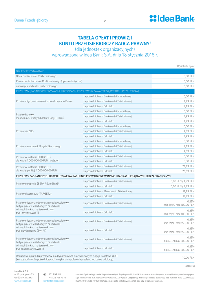 Duma Przedsiębiorcy 1/4 TABELA OPŁAT I PROWIZJI Konto Przedsiębiorczy Radca Prawny1 (dla jednostek organizacyjnych) wprowadzona w Idea Bank S.A. dnia 18 stycznia 2016 r. Wysokość opłat Opłaty podstawowe Otwarcie Rachunku Rozliczeniowego 0,00 PLN Prowadzenie Rachunku Rozliczeniowego (opłata miesięczna) 0,00 PLN Zamknięcie rachunku rozliczeniowego 0,00 PLN Przelewy (zasady wykonywania przez Bank przelewów zawarte są w Tabeli Przelewów) Przelew między rachunkami prowadzonymi w Banku Przelew krajowy (na rachunek w innym banku w kraju – Elixir) Przelew do ZUS Przelew na rachunek Urzędu Skarbowego Przelew w systemie SORBNET2 dla kwoty 1 000 000,00 PLN i wyższej Przelew w systemie SORBNET2 dla kwoty poniżej 1 000 000,00 PLN za pośrednictwem Bankowości Internetowej 0,00 PLN za pośrednictwem Bankowości Telefonicznej 4,99 PLN za pośrednictwem Oddziału 4,99 PLN za pośrednictwem Bankowości Internetowej 0,00 PLN za pośrednictwem Bankowości Telefonicznej 4,99 PLN za pośrednictwem Oddziału 4,99 PLN za pośrednictwem Bankowości Internetowej 0,00 PLN za pośrednictwem Bankowości Telefonicznej 4,99 PLN za pośrednictwem Oddziału 4,99 PLN za pośrednictwem Bankowości Internetowej 0,00 PLN za pośrednictwem Bankowości Telefonicznej 4,99 PLN za pośrednictwem Oddziału 4,99 PLN za pośrednictwem Bankowości Telefonicznej 0,00 PLN za pośrednictwem Oddziału 0,00 PLN za pośrednictwem Bankowości Telefonicznej 29,99 PLN za pośrednictwem Oddziału 29,99 PLN PRZELEWY ZAGRANICZNE LUB WALUTOWE NA RACHUNKI PROWADZONE W INNYCH BANKACH KRAJOWYCH LUB ZAGRANICZNYCH Przelew europejski (SEPA / EuroElixir)2 Przelew ekspresowy (TARGET2) za pośrednictwem Bankowości Telefonicznej 0,00 PLN / 4,99 PLN za pośrednictwem Oddziału 0,00 PLN / 4,99 PLN za pośrednictwem Bankowości Telefonicznej 19,99 PLN za pośrednictwem Oddziału 19,99 PLN za pośrednictwem Bankowości Telefonicznej 0,25% min 29,99 max 100,00 PLN za pośrednictwem Oddziału 0,25% min 29,99 max 100,00 PLN Przelew międzynarodowy oraz przelew walutowy (w tym przelew walut obcych na rachunki w innych bankach na terenie kraju) tryb przyśpieszony (SWIFT) za pośrednictwem Bankowości Telefonicznej 0,25% min 39,99 max 150,00 PLN za pośrednictwem Oddziału 0,25% min 39,99 max 150,00 PLN Przelew międzynarodowy oraz przelew walutowy (w tym przelew walut obcych na rachunki w innych bankach na terenie kraju) tryb ekspresowy (SWIFT) za pośrednictwem Bankowości Telefonicznej 0,25% min 49,99 max 200,00 PLN za pośrednictwem Oddziału 0,25% min 49,99 max 200,00 PLN Przelew międzynarodowy oraz przelew walutowy (w tym przelew walut obcych na rachunki w innych bankach na terenie kraju) tryb zwykły (SWIFT) Dodatkowa opłata dla przelewów międzynarodowych oraz walutowych z opcją kosztową OUR (koszty podmiotów pośredniczących w wykonaniu polecenia przelewu lub banku odbiorcy) 70,00 PLN 1602111256 Idea Bank S.A. ul. Przyokopowa 33 01-208 Warszawa www.ideabank.pl 801 999 111 +48 22 101 10 10 [email protected] T: Idea Bank Spółka Akcyjna z siedzibą w Warszawie, ul. Przyokopowa 33, 01-208 Warszawa, wpisana do rejestru przedsiębiorców prowadzonego przez Sąd Rejonowy dla m.st. Warszawy w Warszawie, XII Wydział Gospodarczy Krajowego Rejestru Sądowego, pod numerem KRS 0000026052, REGON 011063638, NIP 5260307560, której kapitał zakładowy wynosi 156 803 962 zł (opłacony w całości). Duma Przedsiębiorcy 2/4 Anulowanie / zwrot wykonanego przez Bank polecenia przelewu zagranicznego / walutowego na wniosek Posiadacza Rachunku Zlecenie poszukiwania przelewu / postępowanie wyjaśniające wykonane na zlecenie Posiadacza Rachunku (opłaty nie pobiera się, jeśli przyczyną postępowania wyjaśniającego był błąd Banku) 50,00 PLN 50,00 PLN + koszty innych banków Bankowość Elektroniczna Dostęp do Bankowości Internetowej 0,00 PLN Dostęp do Bankowości Telefonicznej Utworzenie i zmiana schematu akceptacji przelewu Utworzenie i zmiana reguły akceptacji przelewu 0,00 PLN za pośrednictwem Bankowości Internetowej 0,00 PLN za pośrednictwem Bankowości Telefonicznej 4,99 PLN za pośrednictwem Oddziału 4,99 PLN za pośrednictwem Bankowości Internetowej 0,00 PLN za pośrednictwem Bankowości Telefonicznej 4,99 PLN za pośrednictwem Oddziału 4,99 PLN Zarządzanie Użytkownikami Dodanie Użytkownika Głównego po przyjęciu dyspozycji w formie pisemnej 4,99 PLN Usunięcie Użytkownika Głównego po przyjęciu dyspozycji w formie pisemnej 4,99 PLN Utworzenie Grupy Użytkowników za pośrednictwem Bankowości Internetowej 0,00 PLN Utworzenie Grupy Użytkowników za pośrednictwem Bankowości Telefonicznej lub w Oddziale 4,99 PLN Edycja uprawnień Użytkownika Dodatkowego za pośrednictwem Bankowości Internetowej 0,00 PLN Edycja uprawnień Użytkownika Dodatkowego za pośrednictwem Bankowości Telefonicznej lub w Oddziale 4,99 PLN Zlecenie stałe Utworzenie lub zmiana zlecenia stałego za pośrednictwem Bankowści Internetowej 0,00 PLN Utworzenie lub zmiana zlecenia stałego za pośrednictwem Bankowści Telefonicznej 4,99 PLN Utworzenie lub zmiana zlecenia stałego za pośrednictwem Oddziału 4,99 PLN Realizacja zlecenia stałego utworzonego za pośrednictwem Bankowści Internetowej 0,00 PLN Realizacja zlecenia stałego utworzonego za pośrednictwem Bankowści Telefonicznej 0,00 PLN Realizacja zlecenia stałego utworzonego za pośrednictwem Oddziału 0,00 PLN Polecenie zapłaty Ustanowienie polecenia zapłaty 0,00 PLN Odwołanie polecenia zapłaty 0,00 PLN Realizacja polecenia zapłaty 0,00 PLN Wpłaty i wypłaty gotówkowe Opłata za wpłatę gotówkową dokonaną w Oddziale 0,00 PLN Opłata za wypłatę gotówkową dokonaną w Oddziale 0,00 PLN Opłata za wpłatę gotówkową dokonaną w Oddziale z udziałem bilonu (powyżej 100 sztuk) Wpłata gotówkowa dokonana w wyznaczonych wpłatomatach lub bankomatach posiadających funkcję wpłat3 Wypłata kwoty wymagającej awizowania, bez awizowania – opłata dodatkowa od kwoty prze