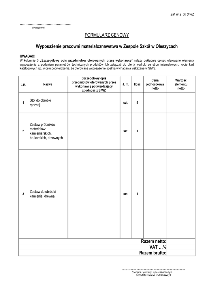 Zał. nr 2 do SIWZ .............................................. ( Pieczęć firmy) FORMULARZ CENOWY Wyposażenie pracowni materiałoznawstwa w Zespole Szkół w Oleszycach UWAGA!!! W kolumnie 3 „Szczegółowy opis przedmiotów oferowanych przez wykonawcę” należy dokładnie opisać oferowane elementy wyposażenia z podaniem parametrów technicznych produktów lub załączyć do oferty wydruki ze stron internetowych, kopie kart katalogowych itp. w celu potwierdzenia, że oferowane wyposażenie spełnia wymagania wskazane w SIWZ. L.p. Nazwa Szczegółowy opis przedmiotów oferowanych przez wykonawcę potwierdzający zgodność z SIWZ J. m. Ilość 1 Stół do obróbki ręcznej szt. 4 2 Zestaw próbników materiałów: kamieniarskich, brukarskich, drzewnych szt. 1 3 Zestaw do obróbki kamienia, drewna szt. 1 Cena jednostkowa netto Wartość elementu netto Razem netto: VAT …% Razem brutto: ………..……………………………………………………………… (podpis i pieczęć upoważnionego przedstawiciela wykonawcy)