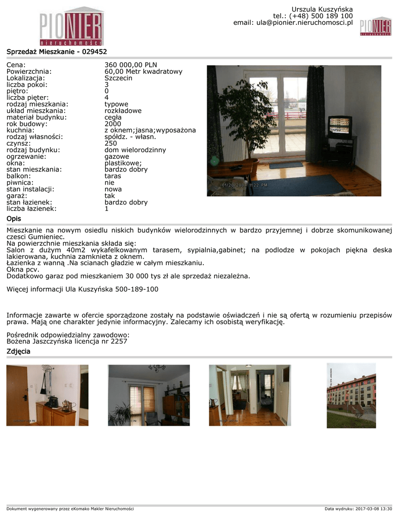 Urszula Kuszyńska tel.: (+48) 500 189 100 email: [email protected] Sprzedaż Mieszkanie - 029452 Cena: Powierzchnia: Lokalizacja: liczba pokoi: piętro: liczba pięter: rodzaj mieszkania: układ mieszkania: materiał budynku: rok budowy: kuchnia: rodzaj własności: czynsz: rodzaj budynku: ogrzewanie: okna: stan mieszkania: balkon: piwnica: stan instalacji: garaż: stan łazienek: liczba łazienek: Opis 360 000,00 PLN 60,00 Metr kwadratowy Szczecin 3 0 4 typowe rozkładowe cegła 2000 z oknem;jasna;wyposażona; spółdz. - własn. 250 dom wielorodzinny gazowe plastikowe; bardzo dobry taras nie nowa tak bardzo dobry 1 Mieszkanie na nowym osiedlu niskich budynków wielorodzinnych w bardzo przyjemnej i dobrze skomunikowanej czesci Gumieniec. Na powierzchnie mieszkania składa się: Salon z dużym 40m2 wykafelkowanym tarasem, sypialnia,gabinet; na podlodze w pokojach piękna deska lakierowana, kuchnia zamknieta z oknem. Łazienka z wanną .Na scianach gładzie w całym mieszkaniu. Okna pcv. Dodatkowo garaz pod mieszkaniem 30 000 tys zł ale sprzedaż niezależna. Więcej informacji Ula Kuszyńska 500-189-100 Informacje zawarte w ofercie sporządzone zostały na podstawie oświadczeń i nie są ofertą w rozumieniu przepisów prawa. Mają one charakter jedynie informacyjny. Zalecamy ich osobistą weryfikację. Pośrednik odpowiedzialny zawodowo: Bożena Jaszczyńska licencja nr 2257 Zdjęcia Dokument wygenerowany przez eKomako Makler Nieruchomości Data wydruku: 2017-03-08 13:30
