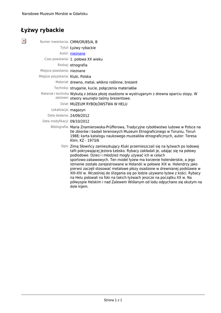 Narodowe Muzeum Morskie w Gdańsku Łyżwy rybackie Numer inwentarza: CMM/OR/85/A, B Tytuł: Łyżwy rybackie Autor: nieznane Czas powstania: 1. połowa XX wieku Rodzaj: etnografia Miejsce powstania: nieznane Miejsce pozyskania: Kluki, Polska Materiał: drewno, metal, włókno roślinne, brezent Technika: struganie, kucie, połączenia materiałów Materiał i technika Wykutą z żelaza płozę osadzono w wystruganym z drewna oparciu stopy. W opisowo: otwory wsunięto taśmy brezentowe. Dział: MUZEUM RYBOŁÓWSTWA W HELU Lokalizacja: magazyn Data dodania: 24/09/2012 Data modyfikacji: 09/10/2012 Bibliografia: Maria Znamierowska-Prüfferowa, Tradycyjne rybołówstwo ludowe w Polsce na tle zbiorów i badań terenowych Muzeum Etnograficznego w Toruniu, Toruń 1988; karta katalogu naukowego muzealiów etnograficznych, autor: Teresa Klim; KZ - 1973/6 Opis: Zimą Słowińcy zamieszkujący Kluki przemieszczali się na łyżwach po lodowej tafli pokrywającej Jeziora Łebsko. Rybacy zakładali je, udając się na połowy podlodowe. Dzieci i młodzież mogły używać ich w celach sportowo-zabawowych. Ten model łyżew ma korzenie holenderskie, a jego istnienie zostało zarejestrowane w Holandii w połowie XIX w. Holendrzy jako pierwsi zaczęli stosować metalowe płozy osadzone w drewnianej podstawie w XIII-XIV w. Wcześniej do ślizgania się po lodzie używano łyżew z kości. Rybacy na Helu polowali na foki na takich łyżwach jeszcze na początku XX w. Na półwyspie Helskim i nad Zalewem Wiślanym od lodu odpychano się okutym na dole kijem. Strona 1 z 1
