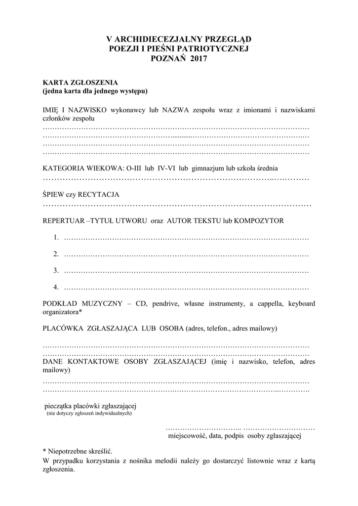 V ARCHIDIECEZJALNY PRZEGLĄD POEZJI I PIEŚNI PATRIOTYCZNEJ POZNAŃ 2017 KARTA ZGŁOSZENIA (jedna karta dla jednego występu) IMIĘ I NAZWISKO wykonawcy lub NAZWA zespołu wraz z imionami i nazwiskami członków zespołu ………………………………………………………………………………………………… ………………………………………………...........……………………………………….… ………………………………………………………………………………………………… ………………………………………………………………………………………………… KATEGORIA WIEKOWA: O-III lub IV-VI lub gimnazjum lub szkoła średnia ………………………………………………………………………..….……… ŚPIEW czy RECYTACJA …………………………………………………………………………………… REPERTUAR –TYTUŁ UTWORU oraz AUTOR TEKSTU lub KOMPOZYTOR 1. ………………………………………………………………………………………… 2. ………………………………………………………………………………………… 3. ………………………………………………………………………………………… 4. ………………………………………………………………………………………… PODKŁAD MUZYCZNY – CD, pendrive, własne instrumenty, a cappella, keyboard organizatora* PLACÓWKA ZGŁASZAJĄCA LUB OSOBA (adres, telefon., adres mailowy) ………………………………………………………………………………………………… ………………………………………………………………………………………………… DANE KONTAKTOWE OSOBY ZGŁASZAJĄCEJ (imię i nazwisko, telefon, adres mailowy) ………………………………………………………………………………………………… ……………………………………………….……………………………………..…………. pieczątka placówki zgłaszającej (nie dotyczy zgłoszeń indywidualnych) ………………………….. ………………………… miejscowość, data, podpis osoby zgłaszającej * Niepotrzebne skreślić. W przypadku korzystania z nośnika melodii należy go dostarczyć listownie wraz z kartą zgłoszenia.