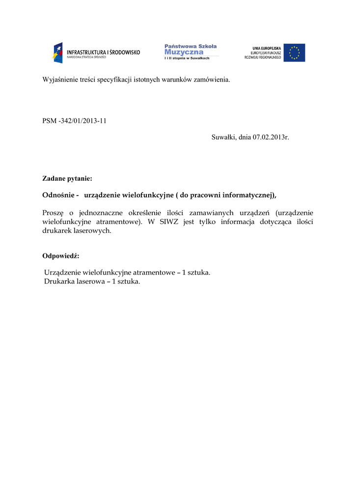Wyjaśnienie treści specyfikacji istotnych warunków zamówienia. PSM -342/01/2013-11 Suwałki, dnia 07.02.2013r. Zadane pytanie: Odnośnie - urządzenie wielofunkcyjne ( do pracowni informatycznej), Proszę o jednoznaczne określenie ilości zamawianych urządzeń (urządzenie wielofunkcyjne atramentowe). W SIWZ jest tylko informacja dotycząca ilości drukarek laserowych. Odpowiedź: Urządzenie wielofunkcyjne atramentowe – 1 sztuka. Drukarka laserowa – 1 sztuka.