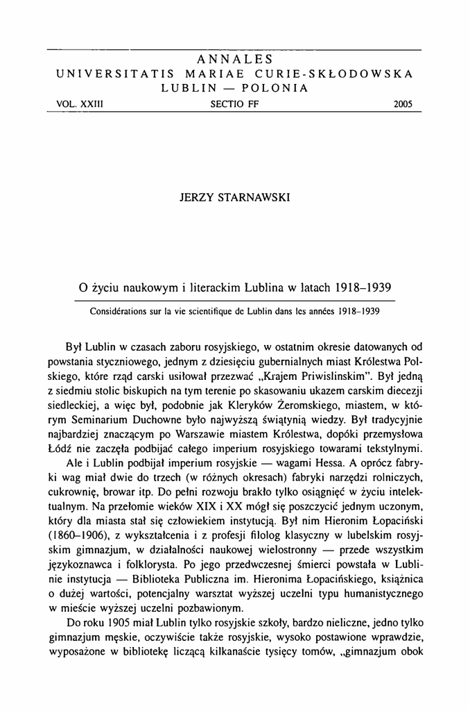 ANNALES U N I V E R S I T A T I S M A R I A E C U RI E - S К Ł O D O W S К A LUBLIN — POLONIA VOL. XXIII SECTIO FF 2005 JERZY STARNAWSKI O życiu naukowym i literackim Lublina w latach 1918-1939 Considerations sur la vie scientifique dc Lublin dans les annćes 1918-1939 Był Lublin w czasach zaboru rosyjskiego, w ostatnim okresie datowanych od powstania styczniowego, jednym z dziesięciu gubernialnych miast Królestwa Pol skiego, które rząd carski usiłował przezwać „Krajem Priwislinskim”. Był jedną z siedmiu stolic biskupich na tym terenie po skasowaniu ukazem carskim diecezji siedleckiej, a więc był, podobnie jak Kleryków Żeromskiego, miastem, w któ rym Seminarium Duchowne było najwyższą świątynią wiedzy. Był tradycyjnie najbardziej znaczącym po Warszawie miastem Królestwa, dopóki przemysłowa Łódź nie zaczęła podbijać całego imperium rosyjskiego towarami tekstylnymi. Ale i Lublin podbijał imperium rosyjskie — wagami Hessa. A oprócz fabry ki wag miał dwie do trzech (w różnych okresach) fabryki narzędzi rolniczych, cukrownię, browar itp. Do pełni rozwoju brakło tylko osiągnięć w życiu intelek tualnym. Na przełomie wieków XIX i XX mógł się poszczycić jednym uczonym, który dla miasta stał się człowiekiem instytucją. Był nim Hieronim Łopaciński (1860-1906), z wykształcenia i z profesji filolog klasyczny w lubelskim rosyj skim gimnazjum, w działalności naukowej wielostronny — przede wszystkim językoznawca i folklorysta. Po jego przedwczesnej śmierci powstała w Lubli nie instytucja — Biblioteka Publiczna im. Hieronima Łopacińskiego, książnica o dużej wartości, potencjalny warsztat wyższej uczelni typu humanistycznego w mieście wyższej uczelni pozbawionym. Do roku 1905 miał Lublin tylko rosyjskie szkoły, bardzo nieliczne, jedno tylko gimnazjum męskie, oczywiście także rosyjskie, wysoko postawione wprawdzie, wyposażone w bibliotekę liczącą kilkanaście tysięcy tomów, „gimnazjum obok wizytek”, jak zanotował w jednym z pism Bolesław Prus 1, zachowujący w pa mięci polską jeszcze szkołę sprzed powstania styczniowego. Po przełomie 1905 roku, po „walce o szkołę polską”, jak grzyby po deszczu powstawać zaczęły pol skie gimnazja, dozwolone, lecz nieotoczone opieką rosyjskich władz szkolnych: męskie w liczbie trzech, z czasem czterech: żeńskie a la „pensja pani Latter”, w liczbie większej jeszcze. Państwowe szkoły średnie z polskim językiem wy kładowym tworzyły władze tzw. generalnego gubernatorstwa w 1915 roku, gdy południowa część Królestwa Polskiego z Lublinem jako stolicą gubernatorstwa poddana została polskiej władzy szkolnej tworzącej gimnazja i seminaria na uczycielskie z myślą o rozwoju polskich szkół powszechnych, już powstających w miejsce dawnych, nazywanych „gorodskoje ucziliszcze”, ale zakładanych przed 1905 rokiem jedynie w małych miasteczkach, nie na wsiach. To, co zaczęły pol skie władze szkolne generalnego gubernatorstwa, przenosząc na ziemię kielecką i lubelską stosunki panujące w Galicji, kontynuowały władze szkolne Rady Re gencyjnej. W Lublinie wychodziła „Szkoła Polska”, dopełniająca pedagogiczne pisma galicyjskie, choć niedorównującą im. Nawiasem dodać warto, że północna część Królestwa, poddana okupacji niemieckiej, otrzymała równocześnie także szkolnictwo polskie: dla propagandowych celów wskrzesili Niemcy Uniwersytet Warszawski (1915), który od początku był nie „propagandową”, ale prawdziwą, w każdym calu polską wyższą uczelnią: do towarzystwa dwu świetnych uniwersy tetów galicyjskich przybył trzeci, w stolicy powstającego drogą ewolucji państwa. W odrodzonej Polsce przybyły od samego początku dwa nowe uniwersytety: w Poznaniu i w Lublinie (1918), w rok później wskrzeszony został Uniwersytet Stefana Batorego w Wilnie (1919), uczelnia o tradycjach Skargi i Sarbiewskiego w fazie początkowej, o tradycjach Mickiewicza i filomatów, a także Słowackiego i Kraszewskiego w krótkim okresie szczęśliwego rozwoju w pierwszych dziesiąt kach XIX wieku. Uniwersytet Lubelski był inicjatywą prywatną. Ksiądz Idzi Radziszewski (1871-1922) jeszcze nieco wcześnie, zanim powstała niepodległa Polska, wte dy, gdy odrodzenie Polski stało się pewnikiem, zdecydował przenieść na ziemie Polski Akademię Duchowną z Petersburga i rozszerzyć jej działalność przez zało żenie wydziałów świeckich. Granice odradzającego się państwa nie były jeszcze w tym czasie pewne, toteż siedzibę planowanej uczelni należało wybrać na zie miach byłego Królestwa, bezspornie już polskich. Wybór padł na Lublin. Tu w pobernardyńskim gmachu przy kościele pod wezwaniem Nawrócenia św. Paw ła znalazł ksiądz Radziszewski pomieszczenie dla zgromadzonej już wcześniej biblioteki uniwersyteckiej, którą udało się przewieźć (tam mieściła się do ro 1 Notatki z Lublina, „Tygodnik Ilustrowany” 1911, nr 5; przcdr. [w:] B. Prus, Kroniki, oprać. Z. Szweykowski, l. 20, Warszawa 1970, s. 332. ku 1949), zaś w gmachu Seminarium Duchownego znalazł za aprobatą biskupa lubelskiego, Mariana Leona Fulmana, czasowe pomieszczenie dla uniwersytetu, mającego na początku cztery wydziały: teologiczny, prawa kanonicznego (w cią gu całego dwudziestolecia międzywojennego jedyny w Polsce), prawa i nauk społeczno-ekonomicznych, nauk humanistycznych. Twórca uniwersytetu mierzył siły na zamiary. Dysponował jednak na początku pewnym funduszem, który działalność umożliwił. Bogaty ziemianin z Podola, Karol Jaroszyński, niemający spadkobierców, ofiarował na rzecz Uniwersytetu Lubelskiego 10 milionów rubli, a sam zakończył życie w warunkach skromnych. Suma na funkcjonowanie uczelni w początkowym okresie była wystarczająca, ale fundusz nie pozwalał na kupno czy wybudowanie gmachu własnego. Gmach uzyskał pierwszy rektor uniwersytetu w roku 1920. Do Lublina przy był