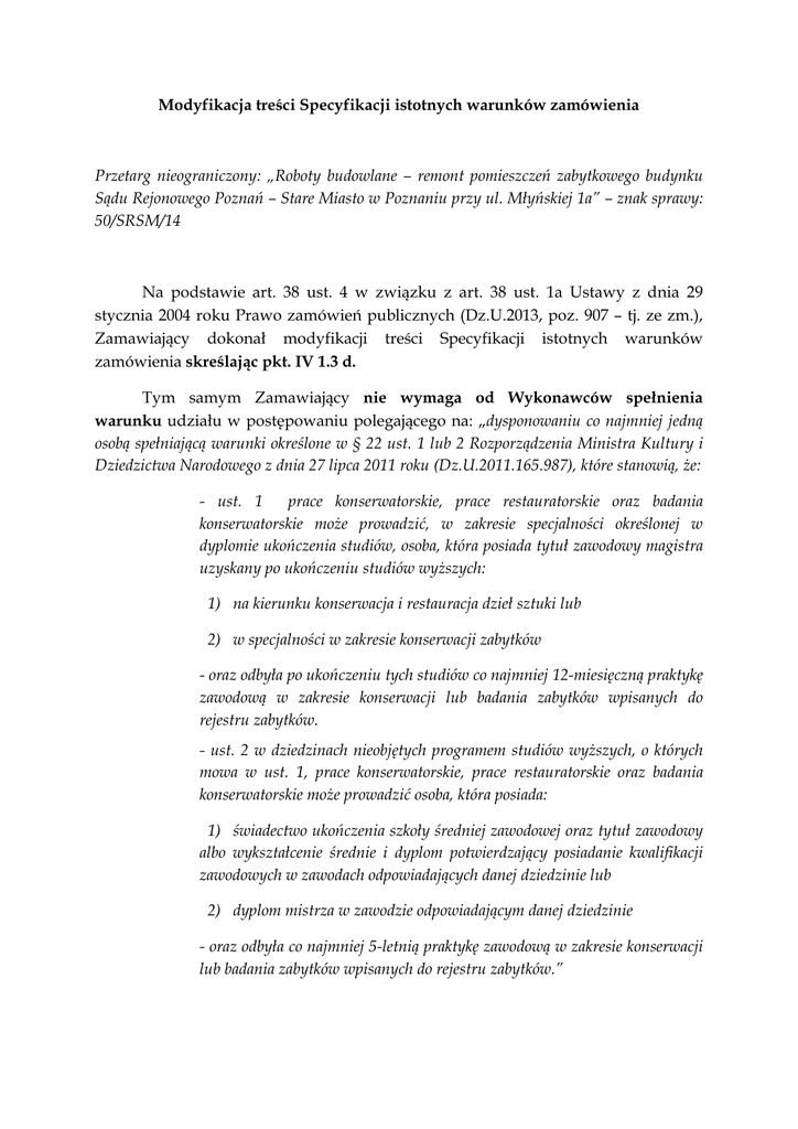Modyfikacja treści Specyfikacji istotnych warunków zamówienia Przetarg nieograniczony: „Roboty budowlane – remont pomieszczeń zabytkowego budynku Sądu Rejonowego Poznań – Stare Miasto w Poznaniu przy ul. Młyńskiej 1a” – znak sprawy: 50/SRSM/14 Na podstawie art. 38 ust. 4 w związku z art. 38 ust. 1a Ustawy z dnia 29 stycznia 2004 roku Prawo zamówień publicznych (Dz.U.2013, poz. 907 – tj. ze zm.), Zamawiający dokonał modyfikacji treści Specyfikacji istotnych warunków zamówienia skreślając pkt. IV 1.3 d. Tym samym Zamawiający nie wymaga od Wykonawców spełnienia warunku udziału w postępowaniu polegającego na: „dysponowaniu co najmniej jedną osobą spełniającą warunki określone w § 22 ust. 1 lub 2 Rozporządzenia Ministra Kultury i Dziedzictwa Narodowego z dnia 27 lipca 2011 roku (Dz.U.2011.165.987), które stanowią, że: - ust. 1 prace konserwatorskie, prace restauratorskie oraz badania konserwatorskie może prowadzić, w zakresie specjalności określonej w dyplomie ukończenia studiów, osoba, która posiada tytuł zawodowy magistra uzyskany po ukończeniu studiów wyższych: 1) na kierunku konserwacja i restauracja dzieł sztuki lub 2) w specjalności w zakresie konserwacji zabytków - oraz odbyła po ukończeniu tych studiów co najmniej 12-miesięczną praktykę zawodową w zakresie konserwacji lub badania zabytków wpisanych do rejestru zabytków. - ust. 2 w dziedzinach nieobjętych programem studiów wyższych, o których mowa w ust. 1, prace konserwatorskie, prace restauratorskie oraz badania konserwatorskie może prowadzić osoba, która posiada: 1) świadectwo ukończenia szkoły średniej zawodowej oraz tytuł zawodowy albo wykształcenie średnie i dyplom potwierdzający posiadanie kwalifikacji zawodowych w zawodach odpowiadających danej dziedzinie lub 2) dyplom mistrza w zawodzie odpowiadającym danej dziedzinie - oraz odbyła co najmniej 5-letnią praktykę zawodową w zakresie konserwacji lub badania zabytków wpisanych do rejestru zabytków.”
