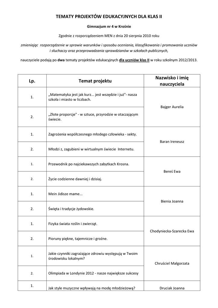 TEMATY PROJEKTÓW EDUKACYJNYCH DLA KLAS II Gimnazjum nr 4 w Krośnie Zgodnie z rozporządzeniem MEN z dnia 20 sierpnia 2010 roku zmieniając rozporządzenie w sprawie warunków i sposobu oceniania, klasyfikowania i promowania uczniów i słuchaczy oraz przeprowadzania sprawdzianów w szkołach publicznych, nauczyciele podają po dwa tematy projektów edukacyjnych dla uczniów klas II w roku szkolnym 2012/2013. Lp. 1. Temat projektu Nazwisko i imię nauczyciela „Matematyka jest jak kurz... jest wszędzie i już"- nasza szkoła i miasto w liczbach. Bajger Aurelia 2. „Złote proporcje" - w sztuce, przyrodzie w otaczającym świecie. 1. Zagrożenia współczesnego młodego człowieka - sekty. Baran Ireneusz 2. Młodzi z, zagubieni w wirtualnym świecie Internetu. 1. Przewodnik po najciekawszych zabytkach Krosna. Bereś Ewa 2. Życie codzienne dawniej i dzisiaj. 1. Mein Jidisze mame... Bienia Joanna 2. Święta i tradycje żydowskie. 1. Fizyka świata roślin i zwierząt. Chodyniecka-Szarecka Ewa 2. Pioruny piękne, tajemnicze i groźne. 1. Jakie czynniki zagrażające zdrowiu występują w Twoim środowisku lokalnym? Chruściel Małgorzata 2. 1. Olimpiada w Londynie 2012 - nasze największe sukcesy Jak style muzyczne wpływają na modę młodzieżową? Druciak Joanna 2. 1. Święta i tradycje bożonarodzeniowe - kolędy. Egzotyczne kraje anglojęzyczne. Dziedzic Matylda 2. Dworska etykieta monarchii brytyjskiej. 1. Odczucia i oczekiwania uczniów G-4 w zakresie wychowania fizycznego i sportu w szkole. Fara Arkadiusz 2. Moda w sporcie. 1. Z modą przez epoki literackie-prezentacja. Fara Jolanta 2. Szkolne „Dziady''- trawestacja dramatu A. Mickiewicza. 1. Symetria i proporcje czy chaos wokół nas? Gębarowska Jolanta 2. Gry i igraszki matematyczne - projekt i wykonanie pomocy dydaktycznych. 1. Teatr wyobraźni - słuchowisko. Grabias Mirosława 2. Literackie wędrówki - prezentacja. 1. W krainie onomastyki. Popularność i pochodzenie naszych imion. Grzebieniowska Renata 2. Akrostychy, palindromy i ropalikony czyli poważne igraszki językowe. 1. Jak to się stało, że to co płaskie stało się przestrzenne - o perspektyce. Janowska Urszula 2. Film jako dziedzina sztuki. 1. „Symetrie w otaczającym nas środowisku". Jastrzębska Maria 2. Dziwne pytania , czyli pytania Fermiego dotyczące naszej szkoły lub miasta. 1. Atrakcje turystyczne Krosna i okolic. Kijowska Barbara 2. Atrakcje turystyczne Podkarpacia. 1. Znane kobiety monarchii brytyjskiej. Kut-Szymańska Bożena 2. Życie członków brytyjskiej rodziny królewskiej. 1. Przewodnik po Londynie. Łopuszańska -Patrylak Dorota 2. Kalendarz świąt brytyjskich. 1. Wirtualna wycieczka po mojej miejscowości prezentacja medialna lub strona www. Majerski Marcin 2. Moja szkoła - multimedialna prezentacja lub strona www. 1. Ignacy Łukasiewicz - życie i dzieło. Malik Marta 2. Wielcy Polacy - Maria Skłodowska - Curie. 1. Historia siatkówki ( sukcesy reprezentacji Polski ) 2. W jaki sposób zachęcić młodzież do czynnego uprawiania sportu. 1. Trzymaj formę. Marszałek Jaromir Matras-Kociuba Mariola 2. Zdrowie= dieta +aktywny tryb życia. 1. Negatywne skutki stosowania dopingu w sporcie. Majka Małgorzata 2. Aktywne formy spędzania wolnego czasu. 1. Historia: O patronach krośnieńskich ulic. Jestem kronikarzem rodzinnym - losy rodzin Nabywaniec Włodzimierz krośnieńskich Gimnazjalistów. 2. Informatyka: Nasza szkolna wizytówka - praca nad gimnazjalną witryną www. O patronach krośnieńskich ulic - wykonywanie strony www. 1. Historia judo w Polsce Nowicki Mirosław 2. Judo jako dyscyplina olimpijska 1. Jak dobrze wybrać? - szkoły średnie i zawodowe Krosna i okolic. Oryszczak Joanna 2. Marketing. 1. Wpływ prawidłowego odżywiania na zdrowie człowieka. Rajs Dorota 2. Ocena zanieczyszczenia najbliższego środowiska. 1. Ślady polskie w Waszyngtonie - przewodnik po Waszyngtonie. Smyka Anna 2. Śladami filmu i teatru - przewodnik po Nowym Jorku. 1. Święta w Niemczech. Szmyd Agata 2. Co można zobaczyć u naszych zachodnich sąsiadów. 1. Świadkowie prawdy o zmartwychwstaniu Jezusa Chrystusa. Walczak Tomasz 2. Całun turyński, oblicze z Manoppello ,chusta z Oviedo i inne relikwie Męki Pańskiej. 1. Wycieczka po stolicy Austrii. Witalis Elżbieta 2. Jak świętują Niemcy a jak Polacy? czy coś nas łączy?