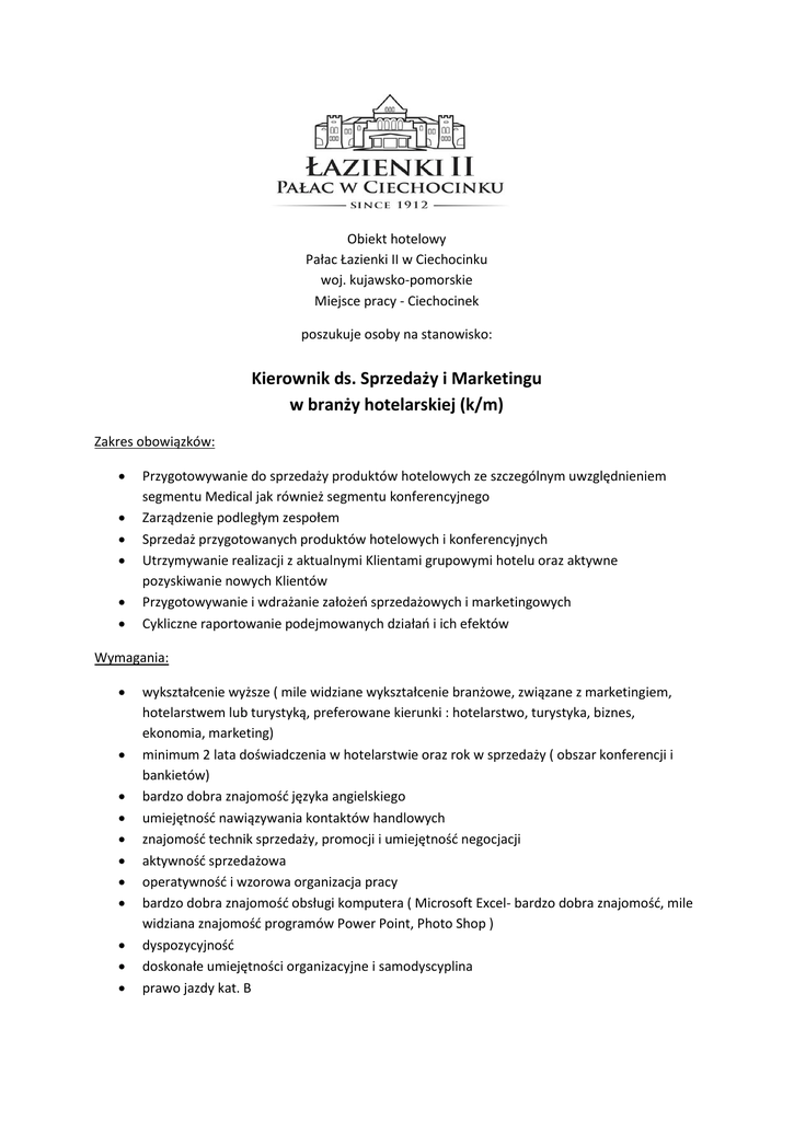 Obiekt hotelowy Pałac Łazienki II w Ciechocinku woj. kujawsko-pomorskie Miejsce pracy - Ciechocinek poszukuje osoby na stanowisko: Kierownik ds. Sprzedaży i Marketingu w branży hotelarskiej (k/m) Zakres obowiązków: Przygotowywanie do sprzedaży produktów hotelowych ze szczególnym uwzględnieniem segmentu Medical jak również segmentu konferencyjnego Zarządzenie podległym zespołem Sprzedaż przygotowanych produktów hotelowych i konferencyjnych Utrzymywanie realizacji z aktualnymi Klientami grupowymi hotelu oraz aktywne pozyskiwanie nowych Klientów Przygotowywanie i wdrażanie założeń sprzedażowych i marketingowych Cykliczne raportowanie podejmowanych działań i ich efektów Wymagania: wykształcenie wyższe ( mile widziane wykształcenie branżowe, związane z marketingiem, hotelarstwem lub turystyką, preferowane kierunki : hotelarstwo, turystyka, biznes, ekonomia, marketing) minimum 2 lata doświadczenia w hotelarstwie oraz rok w sprzedaży ( obszar konferencji i bankietów) bardzo dobra znajomość języka angielskiego umiejętność nawiązywania kontaktów handlowych znajomość technik sprzedaży, promocji i umiejętność negocjacji aktywność sprzedażowa operatywność i wzorowa organizacja pracy bardzo dobra znajomość obsługi komputera ( Microsoft Excel- bardzo dobra znajomość, mile widziana znajomość programów Power Point, Photo Shop ) dyspozycyjność doskonałe umiejętności organizacyjne i samodyscyplina prawo jazdy kat. B Proponujemy: Zatrudnienie w oparciu o umowę o pracę pracę w profesjonalnym zespole szkolenia podnoszące umiejętności zawodowe, możliwość rozwoju zawodowego i awansu w obiekcie hotelowo-konferencyjnym typu Rising Star Współpraca z pozostałymi działami firmy celem prawidłowej obsługi Gości przypisanych do Specjalisty Atrakcyjne wynagrodzenie Raportowanie efektów działań sprzedażowych, marketingowych, plus systematyzowanie Inicjatywa w działaniach sprzedażowych i marketingowych Osoby zainteresowane współpracą prosimy o przesyłanie CV na adres: [email protected] (Wraz z załączoną klauzulą o ochronie danych osobowych)