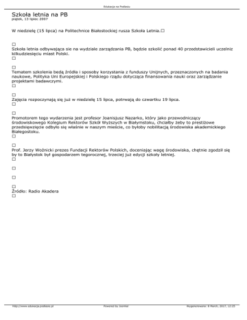 Edukacja na Podlasiu Szkoła letnia na PB piątek, 13 lipiec 2007 W niedzielę (15 lipca) na Politechnice Białostockiej rusza Szkoła Letnia. Szkoła letnia odbywająca sie na wydziale zarządzania PB, będzie szkolić ponad 40 przedstawicieli uczelniz kilkudziesięciu miast Polski. Tematem szkolenia bedą źródła i sposoby korzystania z funduszy Unijnych, przeznaczonych na badania naukowe, Polityka Uni Europejskiej i Polskiego rządu dotycząca finansowania nauki oraz zarządzanie projektami badawczymi. Zajęcia rozpoczynają się już w niedzielę 15 lipca, potrwają do czwartku 19 lipca. Promotorem tego wydarzenia jest profesor Joanisjusz Nazarko, który jako przewodniczący środowiskowego Kolegium Rektorów Szkół Wyższych w Białymstoku, chciałby żeby to prestiżowe przedsięwzięcie odbyło się właśnie w naszym mieście, co byłoby nobilitacją środowiska akademickiego Białegostoku. Prof. Jerzy Woźnicki prezes Fundacji Rektorów Polskich, doceniając wagę środowiska, chętnie zgodził się by to Białystok był gospodarzem tegorocznej, trzeciej już edycji szkoły letniej. Źródło: Radio Akadera http://www.edukacja.podlasie.pl Powered by Joomla! Wygenerowano: 8 March, 2017, 12:25