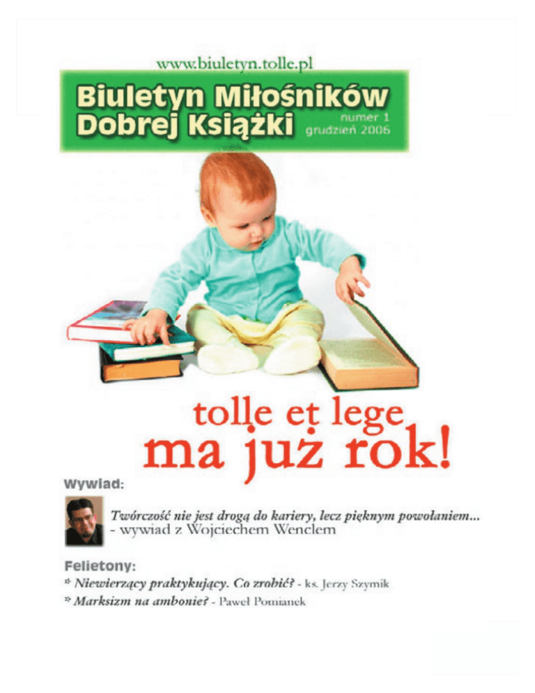 Biuletyn Miłośników Dobrej Książki nr 1 (grudzień 2006) www.biuletyn.tolle.pl strona 1 Biuletyn Miłośników Dobrej Książki nr 1 (grudzień 2006) www.biuletyn.tolle.pl Drodzy Czytelnicy! Z ogromną radością przekazuję nareszcie w Wasze czcigodne ręce pierwszy numer naszego nowego Biuletynu. Początkowo planowaliśmy rozpocząć jego comiesięczne publikowanie wraz z dniem 1 października. Z wielu powodów okazało się to jednak niemożliwe. Cóż... może to i dobrze, bo przecież dzisiaj tj. 1 grudnia mamy... dokładnie rok. Pierwszy numer Biuletynu dokładnie w rocznicę – to chyba niezły sposób na jej uczczenie... Mam nadzieję, że nowa forma naszego Biuletynu przypadnie Wam do gustu. Na pewno już na pierwszy rzut oka widać, że jest on lepszy pod względem graficznym. Bardzo wygodna forma. Ściągamy newsletter na swój komputer, czytamy go w pdfie, jak zwykły e-book. Mam jednak nadzieję, że na tym się jego walory nie kończą. Przede wszystkim mamy do zaoferowanie o wiele więcej różnorodnej treści niż dotychczas. Nie skupiamy się jedynie na książkach i recenzjach polecanych w Tolle et lege. Otwieramy bowiem dział z felietonami, które będą dotykały różnych dziedzin naszego życia. W każdym numerze planujemy również publikację nowego wywiadu. W pierwszym polecam nade wszystko wywiad z jednym z najznamienitszych obecnie piszących polskich poetów Wojciechem Wenclem. Zachęcam do przeczytania nie tylko tych, którzy znają poezję Pana Wojtka lub w ogóle na codzień interesują się poezją. Wojciech Wencel to tak nietuzinkowa i sympatyczna osobowość, że przeczytanie tego wywiadu może być dla każdego niezwykłą gratką. Oprócz wywiadu polecam niezwykle gorąco poniższy artykuł Pawła Królaka, w którym nasi Czytelnicy i stali Klienci będą mogli dowiedzieć się więcej o tym, jak w głowie naszego Szefa zrodził się ten ze wszech miar strona 2 Biuletyn Miłośników Dobrej Książki nr 1 (grudzień 2006) www.biuletyn.tolle.pl wyjątkowy pomysł, jakim jest Tolle et lege. Do przeczytania mamy także dwa felietony. Znany już naszym stałym Czytelnikom ks. prof. Jerzy Szymik stara się zmierzyć z problemem ludzi praktykujących, a jednocześnie niewierzących. Ja krótko podejmuję problematykę definicji sprawiedliwości i konsekwencji płynących z danego sposobu jej określenia. Na koniec dziewięć wybranych recenzji z książek, które publikowaliśmy w Tolle.pl ostatniego lata. Wybraliśmy tak zróżnicowane pozycje, że – jak mniemam – każdy znajdzie coś dla siebie. Ja ze swej strony polecam szczególnie dwie ostatnie recenzje: Pawła Królaka i Justyny Smereckiej. Są naprawdę świetne, aż chcę się natychmiast chwycić za książkę. Oczywiście w najbliższych miesiącach zamierzamy stale udoskonalać nasz Biuletyn – w końcu dopiero zaczynamy i (jak zaznaczył w poniższym artykule Paweł Królak) cały czas pragniemy się rozwijać. Tak więc drogi Tolleański Czytelniku: Bierz i czytaj! Paweł Pomianek redaktor naczelny *** strona 3 Biuletyn Miłośników Dobrej Książki nr 1 (grudzień 2006) www.biuletyn.tolle.pl Mamy już rok! Aż trudno w to uwierzyć. Dokładnie rok temu, 1 grudnia 2005 roku, powstało Tolle et lege. Ciężko w tak krótkiej formie opisać, jak wiele zapału, chęci, nadziei, a może i szaleństwa było w tym pomyśle... a tu już rok za nami. Zaczynaliśmy bardzo skromnie. Budżet prawie zerowy. Tylko ten zapał i niesamowity zespół ludzi (dziękuję Wam Kochani!). Może nasz sukces jest dowodem, że w tym kraju jednak można uczciwie dojść do czegoś, a przy okazji robić również rzeczy pożyteczne? Ale zacznijmy od początku... Końcem października 2005 roku zrodził się w mojej głowie pomysł serwisu internetowego, który polecałby starannie wybrane książki. Takie, po które naprawdę warto sięgnąć. Ten serwis miałby być połączony z księgarnią internetową, w której można byłoby te książki nabyć w promocyjnej cenie. Jednoznacznie skojarzyłem ten pomysł z pochodzącym od św. Augustyna zwrotem „Tolle et lege” - „Bierz i czytaj”. Po niewiele ponad miesięcznych przygotowaniach, 1 grudnia 2005 roku serwis ruszył... Na pierwszy rzut oka może i wygląda to prosto, ale pomyślmy o tym, że nad całością pracują młodzi ludzie, w zdecydowanej większości studenci. Energii było w nas od początku dużo, ale brakowało wszystkiego innego – poczynając od doświadczenia w biznesie, a na pieniądzach kończąc. Zaczęliśmy więc skromnie – na początek zaoferowaliśmy jedynie 25 książek do wyboru. Mało, bardzo mało... Dodatkowo branża księgarska jest w internecie wyjątkowo rozwinięta. Chyba ze wszystkich sklepów internetowych najwięcej jest właśnie księgarń. W dodatku wszystkie do siebie podobne (prawie każda z nich mówi o sobie, że jest „największą księgarnią”). A my tymczasem tylko z 25 książkami... Gdy o tym teraz myślę, to przypomina mi się dowcip o mrówce i słoniu. Dziś, gdy mamy dziesięć razy więcej książek niż na początku, nie jest już tak źle. strona 4 Biuletyn Miłośników Dobrej Książki nr 1 (grudzień 2006) www.biuletyn.tolle.pl Ale chyba jednak wciąż pozostajemy najmniejszą księgarnią w polskim internecie. No i wszystkiego musieliśmy się uczyć od początku. Dosłownie wszystkiego. Poczynając od negocjacji handlowych, form współpracy, poprzez obsługę Klienta na kwestiach logistycznych kończąc. Dziś już wiemy, jakie błędy popełniliśmy, co można było zrobić lepiej. Sądzę jednak, że miało to też swoje zalety. Myślę, że na kwestie obsługi Klienta wpłynęło bardzo pozytywnie to, że zaczęliśmy od zera. Dzięki temu mogliśmy ukierunkować się na ludzkie, zwyczajne, nie wymuszone rutyną podejście. Takie podejście, które zdecydowanie podoba się naszym Klientom. Minął rok... Teraz wiele rzeczy wygląda całkiem inaczej. Patrząc z perspektywy tego rok
