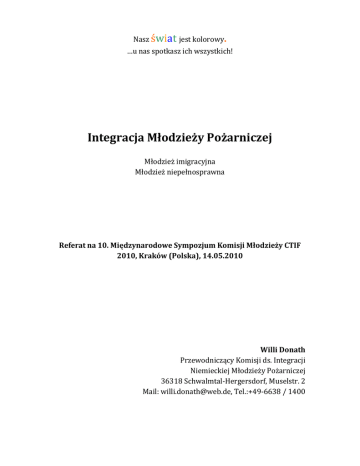 Nasz świat jest kolorowy. …u nas spotkasz ich wszystkich! Integracja Młodzieży Pożarniczej Młodzież imigracyjna Młodzież niepełnosprawna Referat na 10. Międzynarodowe Sympozjum Komisji Młodzieży CTIF 2010, Kraków (Polska), 14.05.2010 Willi Donath Przewodniczący Komisji ds. Integracji Niemieckiej Młodzieży Pożarniczej 36318 Schwalmtal-Hergersdorf, Muselstr. 2 Mail: [email protected], Tel.:+49-6638 / 1400 Szanowni Państwo, Drogie Koleżanki i drodzy Koledzy Strażacy, Kochana Młodzieży, Nasz świat jest kolorowy. …u nas spotkasz ich wszystkich! tak brzmi hasło kampanii integracyjnej niemieckiej MDP. Celem tej kampanii jest przedstawienie mnogości zadań wynikających z naszej pracy. Tą kampanią chcemy także zachęcić Młodzież Pożarniczą do otwarcia się na grupy społeczne, które do tej pory nie znalazły drogi do naszej organizacji. Integracja – temat ten, w odniesieniu do Straży Pożarnej, może wydawać się dla niektórych (może nawet wielu?) całkiem obcy. Pojęcie integracji rozumiane jest jako przyjęcie obywateli pochodzących z innych państw do naszych grup społecznych. To pojęcie jest jednak zbyt płytko zdefiniowane. Integracja oznacza więcej – także dla OSP i MDP. Integracja znajduje się coraz bardziej w centrum uwagi. Politycznie odpowiedzialni w gminach, powiatach, krajach związkowych, jak również w państwie wymagają – oni oczekują – tego od wszystkich grup społecznych, a między innymi także od nas OSP i MDP. W tym miejscu chciałbym dostarczyć kilka impulsów do przemyślenia . Na początku trochę o rozwoju społeczeństwa. Badania statystyczne pokazują, że średnia wieku w Niemczech rośnie. Jest coraz mniej dzieci i młodzieży w obliczu rosnącej liczby osób starszych. Bogu na chwałę – bliźniemu (?) na pomoc Równocześnie można stwierdzić, że społeczeństwo Niemiec zmieniło się jeszcze w innym punkcie. W roku 2005 w Niemczech żyło 15,3 milionów ludzi z tzw. tłem imigracyjnym, a to odpowiada 19% ludności. Następujące grupy ludności nazywane są „ludźmi z tłem imigracyjnym” : • napływowi obcokrajowcy • obcokrajowcy urodzeni w Niemczech • obcokrajowcy, którzy uzyskali obywatelstwo niemieckie • późni przesiedleńcy • także dzieci, których przynajmniej jeden z rodziców może być zaklasyfikowany do powyższych kategorii Badania statystyczne Niemieckiej Młodzieżowej Straży Pożarnej 2008 2009 Grupy MDP 17.470 17.502 Grupy MDP z dziewczynami 14.016 13.878 Członkowie –dziewczyny- 55.448 56.962 Członkowie –chłopcy 181.525 182.505 Grupy MDP z młodzieżą cudzoziemską 1.021 1.095 Młodzież cudzoziemska w MDP 1.138 1.942 Przejęcie młodzieży przez jednostki operacyjne – sumaPrzejęcie młodzieży cudzoziemskiej przez jednostki operacyjne - 25.075 - 622 Z pewnością liczba młodzieżowych drużyn pożarniczych z obcokrajowcami jest o wiele wyższa, gdy nie uwzględni się młodzieży z tłem imigracyjnym. W MDP i także w OSP będziemy postawieni w nadchodzących latach przed następującymi pytaniami: 1. Jak możemy zainteresować dzieci i młodzież z tłem imigracyjnym naszą pracą, przy równoczesnym wzroście liczby tych młodych ludzi w Niemczech? 2. Czy spotkamy się w przyszłości z akceptacją wśród dużej części społeczeństwa, jeśli nie otworzymy się bardziej na ludzi ze środowisk imigrantów i nie umożliwimy im aktywnego udziału w naszej pracy? Praca z / dla młodzieży imigrantów, szansa czy zagrożenie? Z pewnością spotykają się tu różne kultury i różne języki. Byłoby to jednak złe i fatalne, gdyby traktować to jako przeszkodę. Do aktywnej pracy w pożarnictwie młodzieżowym należy zarówno przekazywanie świadomości narodowej i tradycji, jak również uznanie innych osób, skądkolwiek one pochodzą. Wsparcia mogą również udzielić inne instytucje i organizacje młodzieżowe, które mają już doświadczenie w pracy z dziećmi i młodzieżą zagraniczną. Współpraca nie powinna być wykluczona, a wydaje się możliwa. Nikt nie jest niepełnosprawny – niepełnosprawnych robi się z nas „W OSP oraz w MDP można być czynnym, posiadając pełną sprawność umysłową i fizyczną”, tą definicją często kończy się rozmowa na ten temat. Czy tak jest jednak naprawdę, czy może z nami współpracować tylko sportowiec wyczynowy? Czy młodzieżowe straże pożarne nie mogą w tej sprawie działać integracyjnie? Mamy najlepsze założenia: praca techniczna w straży i ogólnie praca z młodzieżą, wspólne gry – praca – przeżywanie w grupie. Tutaj możemy przekazywać te wartości, że każdy ma swoje miejsce w społeczeństwie, także u nas. Praca w młodzieżowej drużynie pożarniczej dla niepełnosprawnych. Fizyczne i umysłowe upośledzenie nie może być decydującym kryterium w młodzieżowej drużynie pożarniczej, liczne pozytywne przykłady świadczą o tym. Jednak nie możemy przeciążać naszych członków i opiekunów. Czy nie żądamy zbyt wiele od naszej pracy z młodzieżą pożarniczą biorąc pod uwagę dwie przedstawione powyżej kwestie? Jeżeli MDP chce się otworzyć na pracę z obcokrajowcami/imigrantami i/lub niepełnosprawnymi, na początku może być odczuwany strach przed zbyt dużymi wymaganiami: „Czy dobrze postępujemy?” „Na jakie problemy mogę się natknąć?” to najczęściej stawiane pytania. Nie możemy natomiast od razu popaść w negatywne stawianie pytań. Raczej powinniśmy zapytać, jakie dodatkowe oferty dla młodzieży możemy im przedstawić. Zdobyte doświadczenia młodzieżowej straży pożarnej jest już widoczne. Tutaj obowiązuje uczenie się od siebie nawzajem. Właściwe przekazanie modeli widzę jako obowiązek i odpowiedzialność gremiów związku. Muszą zostać przedsięwzięte starania, aby nasza dewiza i nasza obietnica miały ważność „Witamy serdecznie każdego!”. Tutaj cenny potencjał nie jest wystarczająco wykorzystany, pożąd