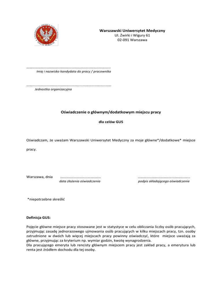 Warszawski Uniwersytet Medyczny Ul. Żwirki i Wigury 61 02-091 Warszawa ………………………………………………………..…………………… Imię i nazwisko kandydata do pracy / pracownika ……………………………………………………………………………… Jednostka organizacyjna Oświadczenie o głównym/dodatkowym miejscu pracy dla celów GUS Oświadczam, że uważam Warszawski Uniwersytet Medyczny za moje główne*/dodatkowe* miejsce pracy. Warszawa, dnia ……..………………………..…… …………………………………………….... data złożenia oświadczenia podpis składającego oświadczenie *niepotrzebne skreślić Definicja GUS: Pojęcie główne miejsce pracy stosowane jest w statystyce w celu obliczania liczby osób pracujących, przyjmując zasadę jednorazowego ujmowania osób pracujących w kilku miejscach pracy, tzn. osoby zatrudnione w dwóch lub więcej miejscach pracy powinny oświadczyć, które miejsce uważają za główne, przyjmując za kryterium np. wymiar godzin, kwotę wynagrodzenia. Dla pracującego emeryta lub rencisty głównym miejscem pracy jest zakład pracy, a emerytura lub renta jest źródłem dochodu dla tej osoby.