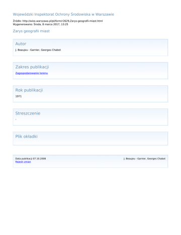 Wojewódzki Inspektorat Ochrony Środowiska w Warszawie Źródło: http://wios.warszawa.pl/pl/form/r2629,Zarys-geografii-miast.html Wygenerowano: Środa, 8 marca 2017, 13:25 Zarys geografii miast Autor J. Beaujeu - Garnier, Georges Chabot Zakres publikacji Zagospodarowanie terenu Rok publikacji 1971 Streszczenie - Plik okładki Data publikacji 07.10.2008 Rejestr zmian J. Beaujeu - Garnier, Georges Chabot