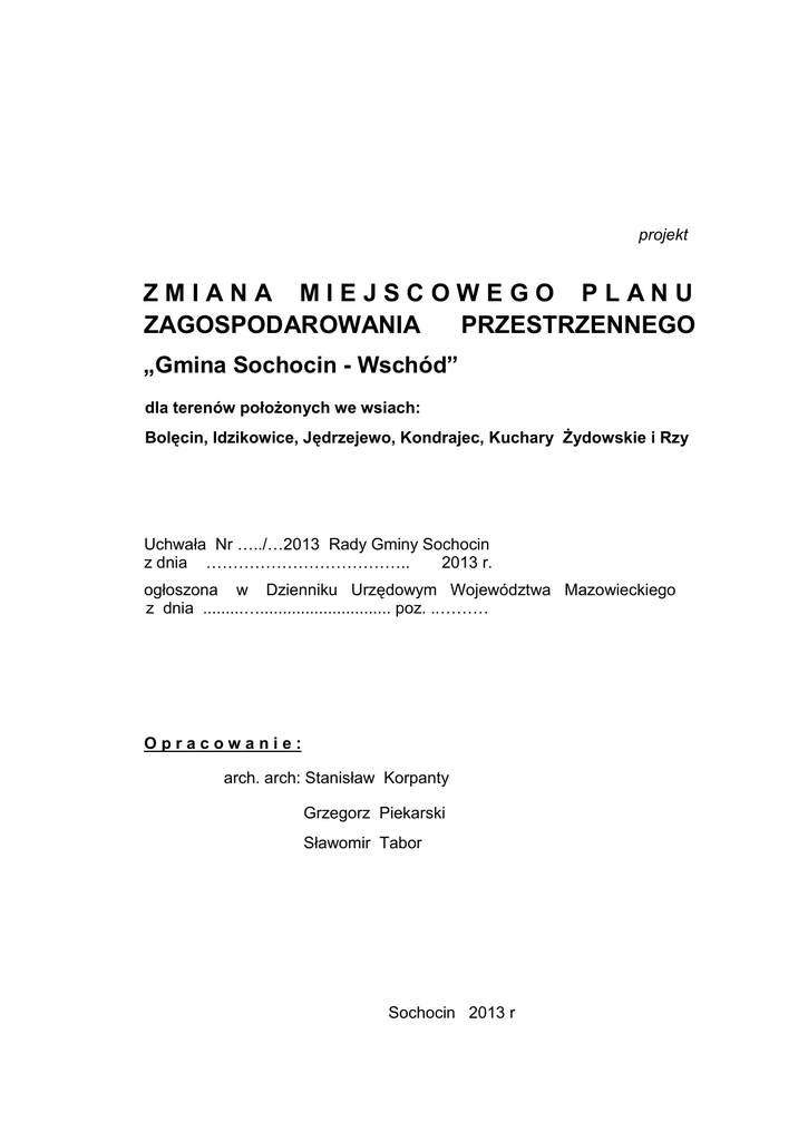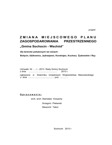 projekt ZMIANA MIEJSCOWEGO PLANU ZAGOSPODAROWANIA PRZESTRZENNEGO „Gmina Sochocin - Wschód” dla terenów położonych we wsiach: Bolęcin, Idzikowice, Jędrzejewo, Kondrajec, Kuchary Żydowskie i Rzy Uchwała Nr …../…2013 Rady Gminy Sochocin z dnia ……………………………….. 2013 r. ogłoszona w Dzienniku Urzędowym Województwa Mazowieckiego z dnia .........…............................. poz. ..……… Opracowanie: arch. arch: Stanisław Korpanty Grzegorz Piekarski Sławomir Tabor Sochocin 2013 r projekt Uchwała Nr ………../……/2013 Rady Gminy Sochocin z dnia …………………. 2013 r. w sprawie uchwalenia zmiany miejscowego planu zagospodarowania przestrzennego „ Gmina Sochocin – Wschód ” dla terenów położonych we wsiach: Bolęcin, Idzikowice, Jędrzejewo, Kondrajec, Kuchary Żydowskie i Rzy. Na podstawie art.18 ust. 2 pkt. 5 ustawy z dnia 8 marca 1990 r. o samorządzie gminnym (Dz.U. z 2013 r. Nr 97, poz. 594), oraz art. 20 ust. 1 ustawy z dnia 27 marca 2003 r. o planowaniu i zagospodarowaniu przestrzennym (Dz.U. z 2012 r., poz. 647 z późniejszymi zmianami), w związku z uchwałą Rady Gminy Sochocin Nr XVIII/151/2012 z dnia 19 grudnia 2012 r. w sprawie przystąpienia do sporządzenia zmiany miejscowego planu zagospodarowania przestrzennego „Gmina Sochocin - Wschód” dla terenów położonych we wsiach Bolęcin, Idzikowice, Jędrzejewo, Kondrajec, Kuchary Żydowskie i Rzy, po stwierdzeniu zgodności ze „Studium uwarunkowań i kierunków zagospodarowania przestrzennego gminy Sochocin” (przyjętego uchwałą Rady Gminy Sochocin Nr XV/78/2000 z dnia 22 września 2000 r i zmienionego uchwałą Rady Gminy Sochocin Nr IV/25/2007 z dnia 31 stycznia 2007r), Rada Gminy Sochocin, postanawia, co następuje: ROZDZIAŁ I Ustalenia ogólne § 1. Uchwala się zmianę miejscowego planu zagospodarowania przestrzennego gminy Sochocin (przyjętego Uchwałą Nr XVI/101/05 Rady Gminy Sochocin z dnia 19 maja 2005r ) pod nazwą „Gmina Sochocin - Wschód”, dla terenów położonych we wsiach: Bolęcin, Idzikowice, Jędrzejewo, Kondrajec, Kuchary Żydowskie i Rzy, o łącznej powierzchni ok. 83 ha, zwaną dalej planem. § 2. Miejscowy plan zagospodarowania przestrzennego składa się z następujących, integralnych części: 1) Części tekstowej, stanowiącej treść niniejszej uchwały, składającej się z czterech rozdziałów: I. II. Ustalenia ogólne; Ustalenia dotyczące całego obszaru objętego planem; III. Ustalenia szczegółowe dotyczące wyznaczonych terenów: 1. 2. 3. 4. 5. 6. Bolęcin, Idzikowice, Jędrzejewo, Kondrajec, Kuchary Żydowskie, Rzy, 2 IV. Ustalenia końcowe. 2) Części graficznej, na którą składa się 14 rysunków w skali 1:2000, zwanych dalej rysunkiem planu, stanowiących załącznik nr 1 do uchwały; 3) Rozstrzygnięcia o sposobie rozpatrzenia uwag wniesionych do projektu planu, stanowiącego załącznik nr 2 do uchwały; 4) Rozstrzygnięć dotyczących sposobu realizacji zapisanych w planie inwestycji z zakresu infrastruktury technicznej, które należą do zadań własnych gminy oraz zasady ich finansowania, stanowiących załącznik nr 3 do uchwały. § 3. Ilekroć w dalszych przepisach niniejszej uchwały jest mowa o: 1. ustawie - należy przez to rozumieć ustawę z dnia 27 marca 2003r. o planowaniu i zagospodarowaniu przestrzennym (Dz.U. z 2012 r. poz. 647 z późniejszymi zmianami); 2. przepisach odrębnych – należy przez to rozumieć przepisy ustaw wraz z aktami wykonawczymi, a w szczególności: Ustawa o udostępnianiu informacji o środowisku i jego ochronie, udziale społeczeństwa w ochronie środowiska oraz o ocenach oddziaływania na środowisko, Ustawa o ochronie przyrody, Prawo ochrony środowiska, Ustawa o odpadach, Prawo wodne, Prawo budowlane, Ustawa o drogach publicznych, Ustawa o gospodarce nieruchomościami, Prawo o ochronie zabytków i opiece nad zabytkami, oraz ograniczenia w dysponowaniu terenem, wynikające z prawomocnych decyzji administracyjnych, stosownie do art. 110 Kodeksu Postępowania Administracyjnego; 3. planie - należy przez to rozumieć ustalenia miejscowego planu zagospodarowania przestrzennego, o którym mowa w § 1 niniejszej uchwały; 4. uchwale – należy przez to rozumieć niniejsza uchwałę; 5. rysunku planu – należy przez to rozumieć integralną część planu, rysunek w skali 1 : 2 000, stanowiący załącznik nr 1 do uchwały; 6. symbolu – należy przez to rozumieć symbol terenu funkcjonalnego lub terenu komunikacji określony odpowiednio symbolem literowym i numerem, wyróżniającym go spośród innych terenów; 7. terenie – należy przez to rozumieć teren funkcjonalny lub teren komunikacji dla którego obowiązują ustalenia planu, wyznaczony liniami rozgraniczającymi oraz określony symbolem terenu zgodnie z rysunkiem planu; 3 8. linii rozgraniczającej - należy przez to rozumieć linię będącą granicą pomiędzy terenami o różnym sposobie użytkowania, zagospodarowania lub różnym przeznaczeniu podstawowym ( różnej funkcji ), w tym również pomiędzy terenami dróg a terenami przeznaczonymi pod zabudowę; 9. intensywności zabudowy - należy przez to rozumieć wskaźnik powierzchni całkowitej zabudowy obiektów na danej działce budowlanej, w odniesieniu do powierzchni tej działki; 10. wskaźniku zabudowy – należy przez to rozumieć wskaźnik powierzchni zabudowy wszystkich budynków na działce budowlanej w odniesieniu do powierzchni tej działki; 11. nieprzekraczalnej linii zabudowy – należy przez to rozumieć linię ustaloną niniejszym planem, określającą linię usytuowania elewacji budynku na minimum 50% jej długości na danej działce lub terenie objętym inwestycją; linia ta nie dotyczy: logii, balkonów, wykuszy wysuniętych poza obrys budynku, elementów wejść do budynków (schodów, podestów, pochylni dla niepełnosprawnych i zadaszeń) - o głębokości do 1,50 m i powierzchni zabudowy do 5,0 m2 oraz: chodników,