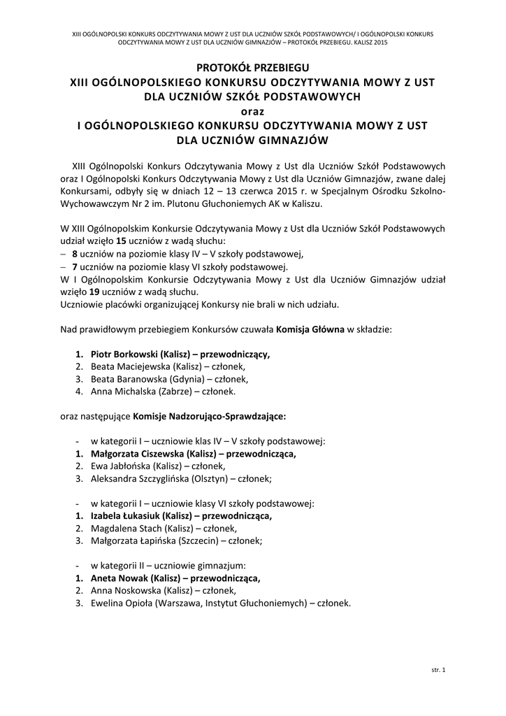 XIII OGÓLNOPOLSKI KONKURS ODCZYTYWANIA MOWY Z UST DLA UCZNIÓW SZKÓŁ PODSTAWOWYCH/ I OGÓLNOPOLSKI KONKURS ODCZYTYWANIA MOWY Z UST DLA UCZNIÓW GIMNAZJÓW – PROTOKÓŁ PRZEBIEGU. KALISZ 2015 PROTOKÓŁ PRZEBIEGU XIII OGÓLNOPOLSKIEGO KONKURSU ODCZYTYWANIA MOWY Z UST DLA UCZNIÓW SZKÓŁ PODSTAWOWYCH oraz I OGÓLNOPOLSKIEGO KONKURSU ODCZYTYWANIA MOWY Z UST DLA UCZNIÓW GIMNAZJÓW XIII Ogólnopolski Konkurs Odczytywania Mowy z Ust dla Uczniów Szkół Podstawowych oraz I Ogólnopolski Konkurs Odczytywania Mowy z Ust dla Uczniów Gimnazjów, zwane dalej Konkursami, odbyły się w dniach 12 – 13 czerwca 2015 r. w Specjalnym Ośrodku SzkolnoWychowawczym Nr 2 im. Plutonu Głuchoniemych AK w Kaliszu. W XIII Ogólnopolskim Konkursie Odczytywania Mowy z Ust dla Uczniów Szkół Podstawowych udział wzięło 15 uczniów z wadą słuchu: 8 uczniów na poziomie klasy IV – V szkoły podstawowej, 7 uczniów na poziomie klasy VI szkoły podstawowej. W I Ogólnopolskim Konkursie Odczytywania Mowy z Ust dla Uczniów Gimnazjów udział wzięło 19 uczniów z wadą słuchu. Uczniowie placówki organizującej Konkursy nie brali w nich udziału. Nad prawidłowym przebiegiem Konkursów czuwała Komisja Główna w składzie: 1. 2. 3. 4. Piotr Borkowski (Kalisz) – przewodniczący, Beata Maciejewska (Kalisz) – członek, Beata Baranowska (Gdynia) – członek, Anna Michalska (Zabrze) – członek. oraz następujące Komisje Nadzorująco-Sprawdzające: 1. 2. 3. w kategorii I – uczniowie klas IV – V szkoły podstawowej: Małgorzata Ciszewska (Kalisz) – przewodnicząca, Ewa Jabłońska (Kalisz) – członek, Aleksandra Szczyglińska (Olsztyn) – członek; 1. 2. 3. w kategorii I – uczniowie klasy VI szkoły podstawowej: Izabela Łukasiuk (Kalisz) – przewodnicząca, Magdalena Stach (Kalisz) – członek, Małgorzata Łapińska (Szczecin) – członek; 1. 2. 3. w kategorii II – uczniowie gimnazjum: Aneta Nowak (Kalisz) – przewodnicząca, Anna Noskowska (Kalisz) – członek, Ewelina Opioła (Warszawa, Instytut Głuchoniemych) – członek. str. 1 XIII OGÓLNOPOLSKI KONKURS ODCZYTYWANIA MOWY Z UST DLA UCZNIÓW SZKÓŁ PODSTAWOWYCH/ I OGÓLNOPOLSKI KONKURS ODCZYTYWANIA MOWY Z UST DLA UCZNIÓW GIMNAZJÓW – PROTOKÓŁ PRZEBIEGU. KALISZ 2015 W dniu 12 czerwca 2015 r. o godz. 1830 nastąpiło uroczyste otwarcie XIII Ogólnopolskiego Konkursu Odczytywania Mowy z Ust dla Uczniów Szkół Podstawowych oraz I Ogólnopolskiego Konkursu Odczytywania Mowy z Ust dla Uczniów Gimnazjów. Na spotkaniu organizacyjnym o godz. 2000 pan Piotr Borkowski, wicedyrektor Ośrodka w Kaliszu, omówił najważniejsze zapisy regulaminu Konkursów oraz przedstawił procedury związane z ich organizacją i przeprowadzeniem. Następnie dokonano uzupełnienia składu Komisji Głównej oraz składów Komisji Nadzorująco-Sprawdzających na poszczególnych poziomach. W drodze losowania wyłoniono organizatora XIV Ogólnopolskiego Konkursu Odczytywania Mowy z Ust (dla Uczniów Szkół Podstawowych i Gimnazjów), tj. Dolnośląski Specjalny Ośrodek Szkolno-Wychowawczy nr 12 dla Niesłyszących i Słabosłyszących im. Marii Grzegorzewskiej we Wrocławiu. Dnia 13 czerwca br. o godzinie 0900 uczestnicy Konkursów przystąpili do rozwiązywania zestawów zadań konkursowych w obecności członków komisji nadzorująco-sprawdzających. Zestawy zadań konkursowych zostały opracowane przez nauczycieli Ośrodka organizującego Konkurs i były różne dla poszczególnych poziomów. Prace uczniów były kodowane. Po zakończeniu rozwiązywania zadań konkursowych, prace uczniów zostały sprawdzone przez członków komisji nadzorująco-sprawdzających w oparciu o szczegółowe klucze odpowiedzi i kryteria punktowania. Z przebiegu pisania i sprawdzania zestawów zadań konkursowych komisje nadzorującosprawdzające sporządziły odrębne protokoły, które stanowią załączniki do niniejszego protokołu. Zakodowane prace uczniów wraz z protokołami komisje nadzorującosprawdzające przekazały Komisji Głównej. W dniu 13 czerwca 2015 r. o godz. 1500, po zapoznaniu się z wynikami prac komisji nadzorująco-sprawdzających, Komisja Główna rozkodowała sprawdzone zestawy zadań konkursowych oraz ustaliła klasyfikację indywidualną i klasyfikację zespołową: str. 2 XIII OGÓLNOPOLSKI KONKURS ODCZYTYWANIA MOWY Z UST DLA UCZNIÓW SZKÓŁ PODSTAWOWYCH/ I OGÓLNOPOLSKI KONKURS ODCZYTYWANIA MOWY Z UST DLA UCZNIÓW GIMNAZJÓW – PROTOKÓŁ PRZEBIEGU. KALISZ 2015 I. Klasyfikacja indywidualna w XIII Ogólnopolskim Konkursie Odczytywania Mowy z Ust dla Uczniów Szkół Podstawowych: 1. w kategorii I – uczniowie klas IV – V szkoły podstawowej: Kod ucznia Liczba zdobytych punktów Wynik w% Miejsce SOSW, Szczecin A05 52 34,21 6. Brylińska Klaudia OSW, Warszawa A04 120,5 79,27 1. 3. Jelińska Natalia SOSW, Olsztyn A07 42 27,63 7. 4. Kleinert Dawid OSW, Poznań A01 94 61,84 3. 5. Klyta Aleksandra ZSP, Katowice A06 36 23,68 8. 6. Matuszewska Eliza SOSW, Sławno A03 107,5 70,72 2. 7. Nowacka Klara Instytut Głuchoniemych, Warszawa A08 74,5 49,01 4. 8. Zawisza Filip SOSW, Olsztyn A02 67,5 44,40 5. Lp. Nazwisko i imię ucznia Ośrodek 1. Boreysza Weronika 2. 2. w kategorii I – uczniowie klasy VI szkoły podstawowej: Kod ucznia Liczba zdobytych punktów Wynik w% Miejsce SOSW, Olsztyn B01 170,5 81,97 2. Kowalik Daniel SOSW, Szczecin B07 132,5 63,7 4. 3. Kucio Wiktoria SOSW, Lublin B02 144,5 69,47 3. 4. Piątek Dawid ZSP, Katowice B04 65,5 31,49 5. 5. Starszak Edmund OSW, Poznań B03 61 29,93 6. OSW, Warszawa B06 195,5 93,99 1. DSOSW, Wrocław B05 23 11,05 7. Lp. Nazwisko i imię ucznia Ośrodek 1. Ankutowicz Oliwia 2. 6. 7. Truszkowska Joanna Wojtanowski Mateusz str. 3 XIII OGÓLNOPOLSKI KONKURS ODCZYTYWANIA MOWY Z UST DLA UCZNIÓW SZKÓŁ PODSTAWOWYCH/ I OGÓLNOPOLSKI KONKURS ODCZYTYWANIA MOWY Z UST DLA UCZNIÓW GIMNAZJÓW – PROTOKÓŁ PRZEBIEGU. KALISZ 2015 II. Klasyfikacja zespołowa w XIII Ogólnopolskim Konkursie Odczytywania Mowy z